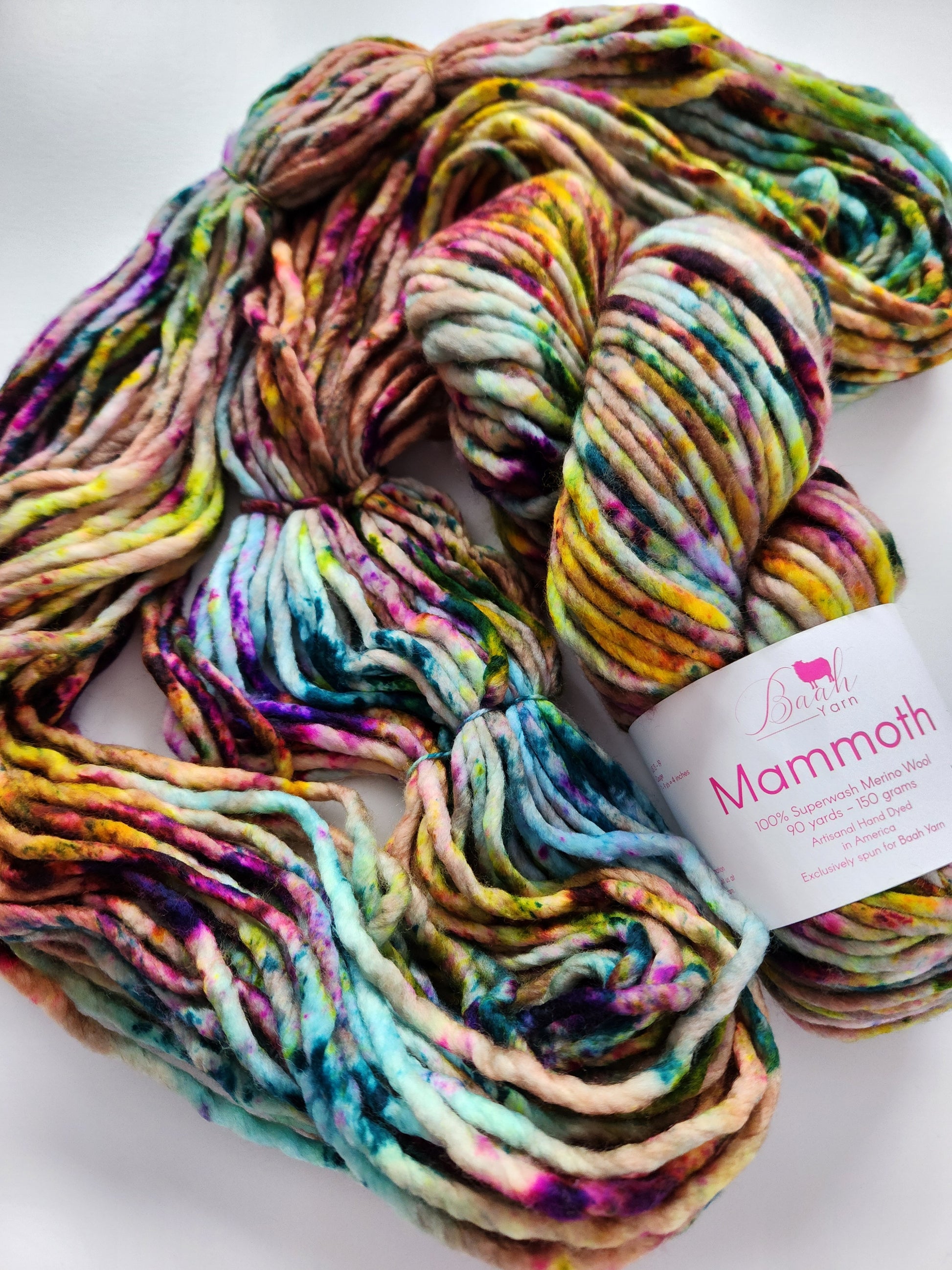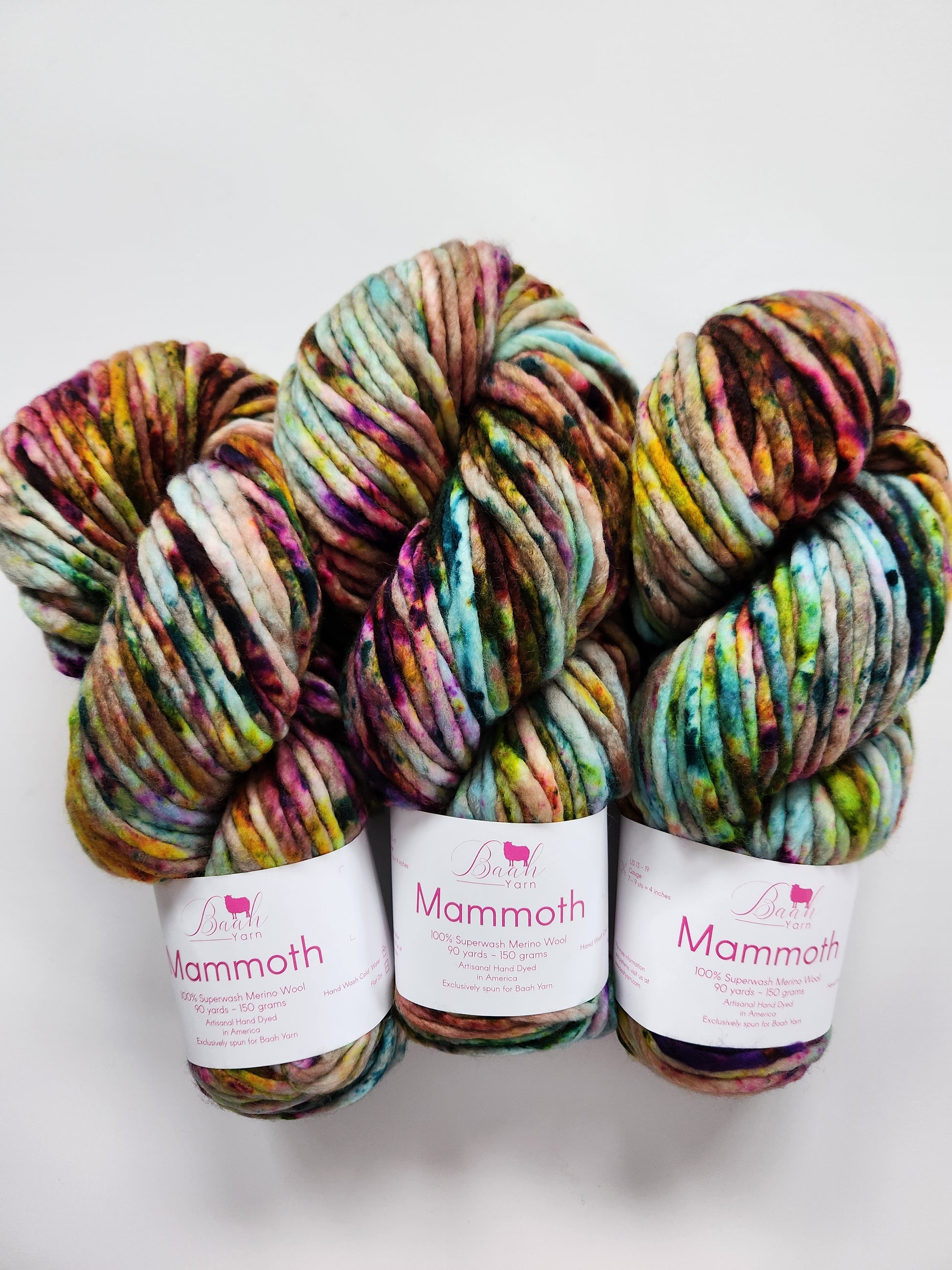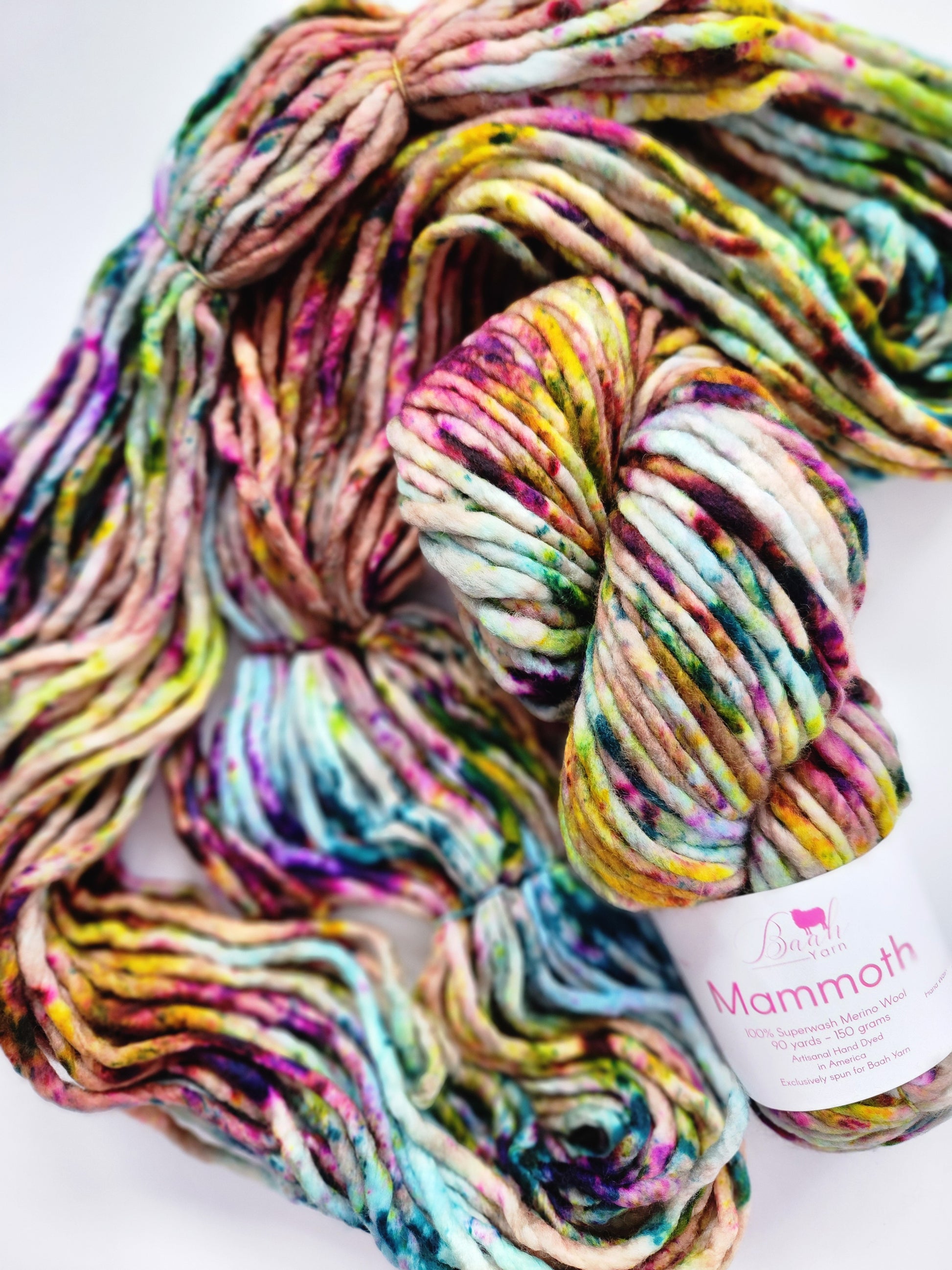 Baah Mammoth 100% superwash single ply merino wool. Each skein is 90 yards of hand-dyed squishy beauty, perfect for plump, quick knit or crochet projects.