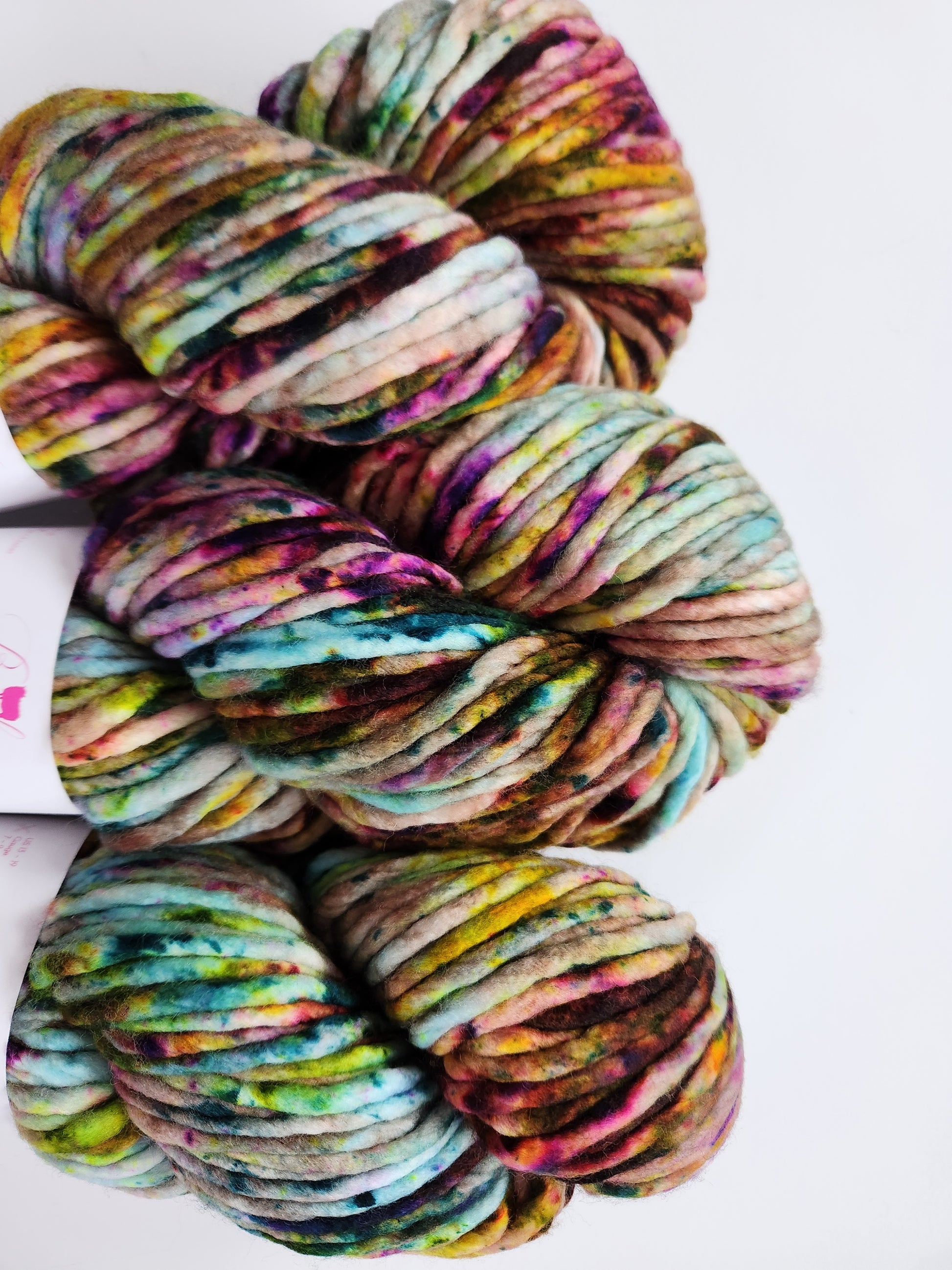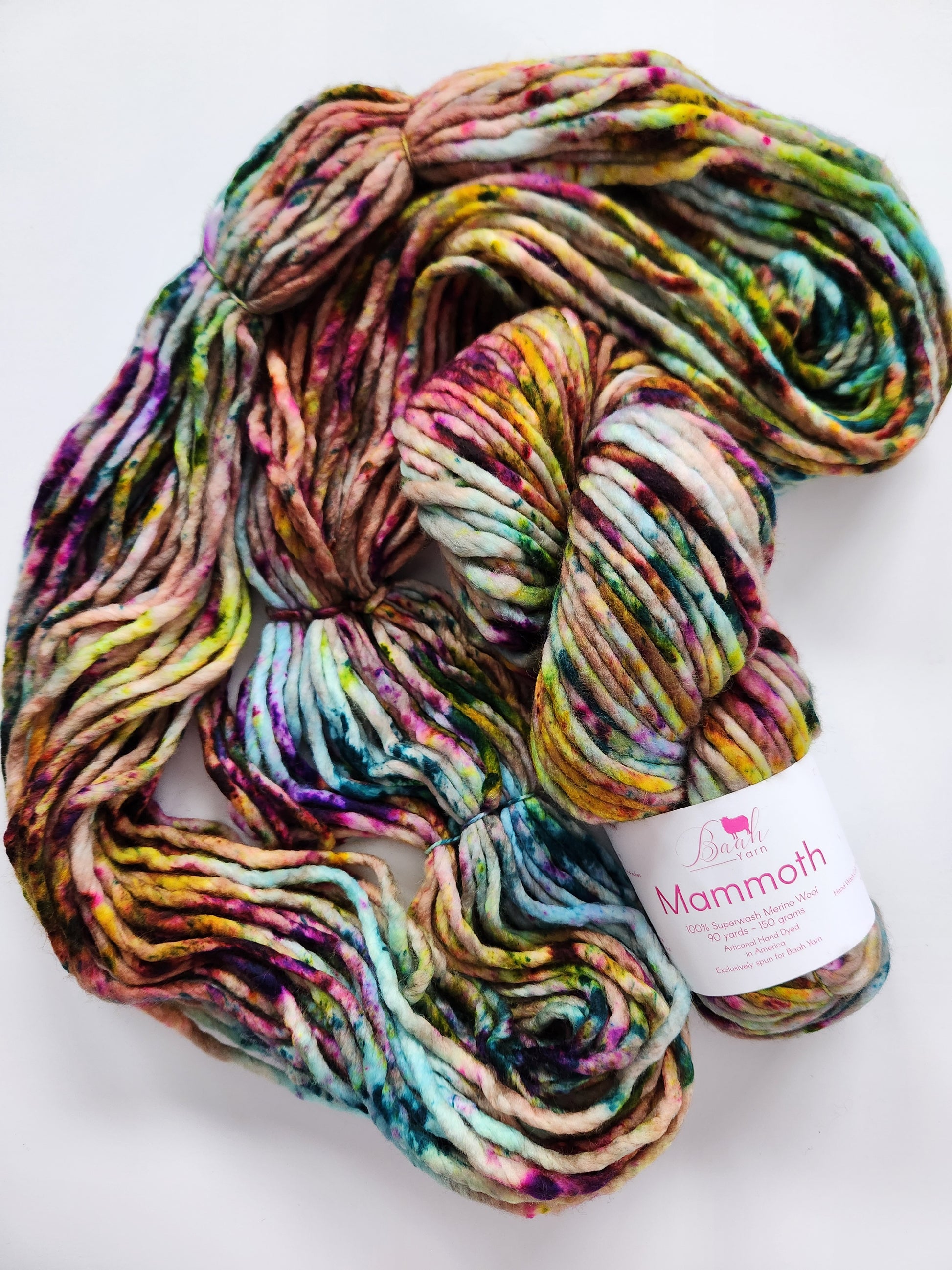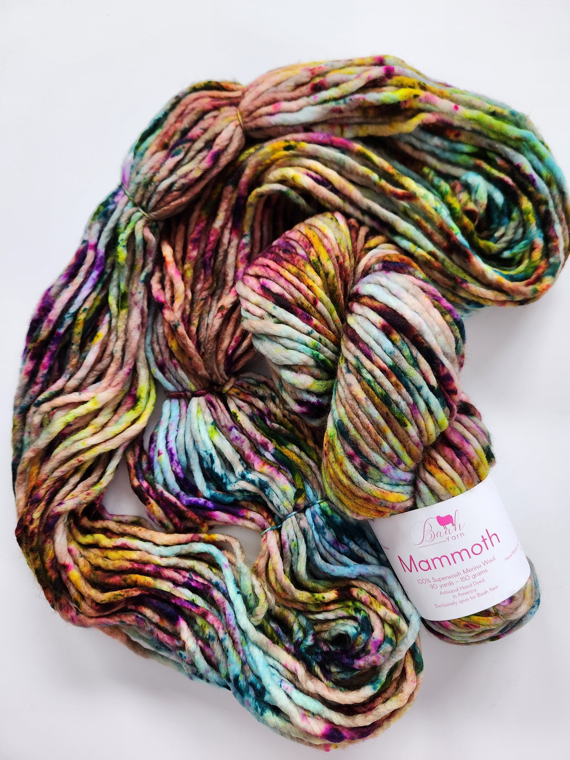 Baah Mammoth 100% superwash single ply merino wool. Each skein is 90 yards of hand-dyed squishy beauty, perfect for plump, quick knit or crochet projects.