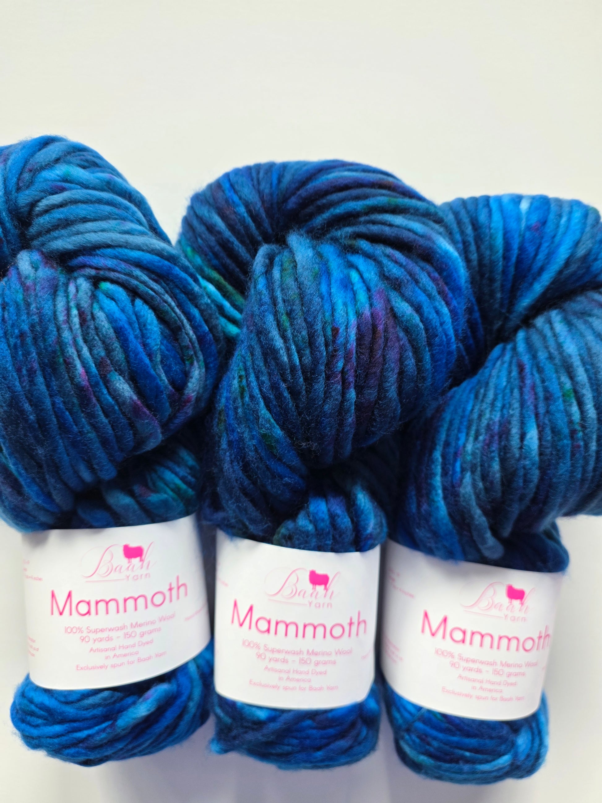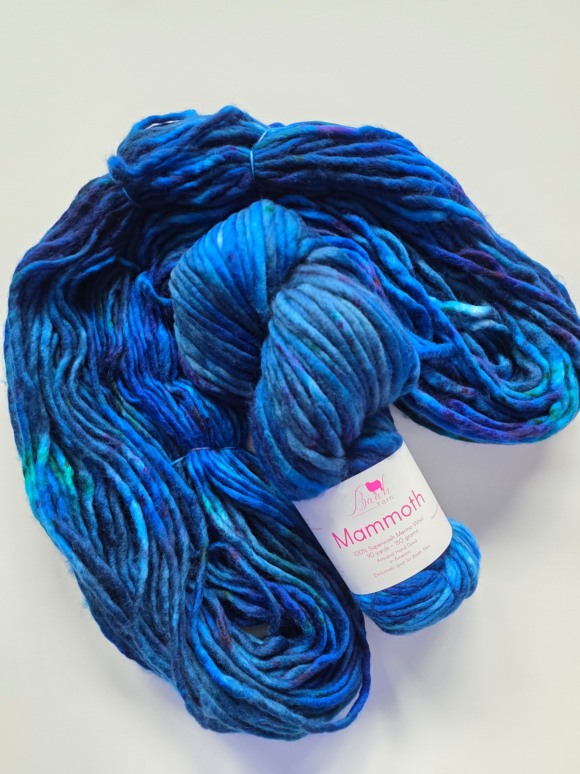 Baah Mammoth 100% superwash single ply merino wool. Each skein is 90 yards of hand-dyed squishy beauty, perfect for plump, quick knit or crochet projects.