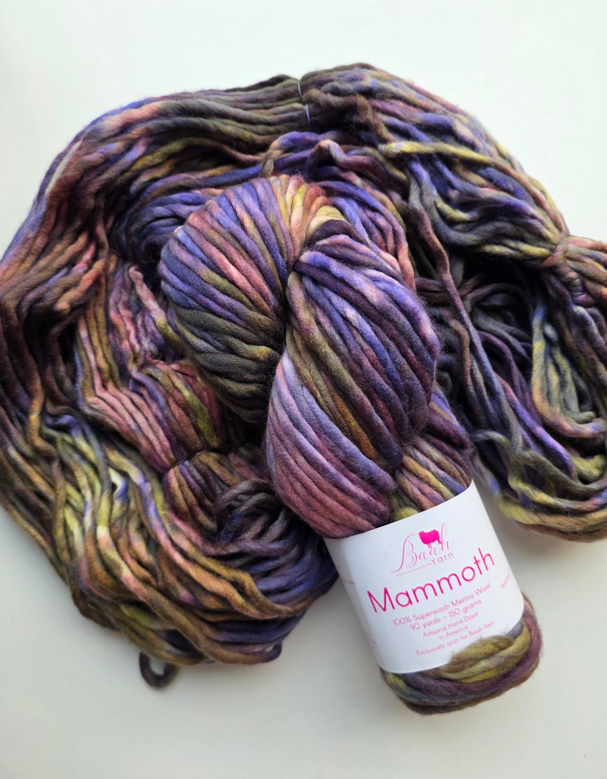 Baah Mammoth 100% superwash single ply merino wool. Each skein is 90 yards of hand-dyed squishy beauty, perfect for plump, quick knit or crochet projects.