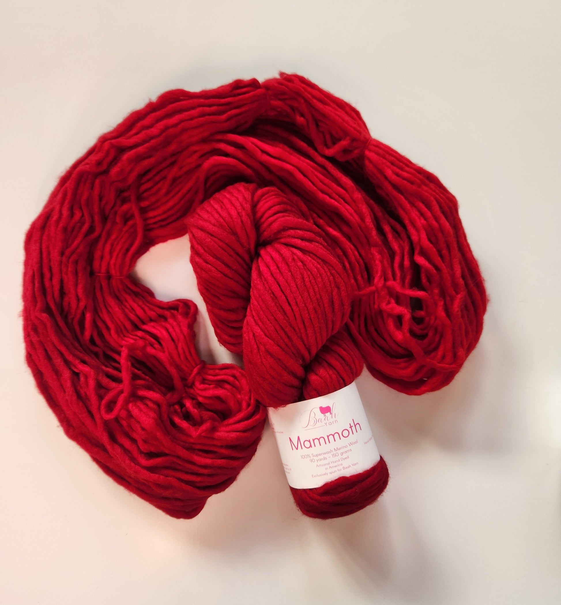 Baah Mammoth 100% superwash single ply merino wool. Each skein is 90 yards of hand-dyed squishy beauty, perfect for plump, quick knit or crochet projects.