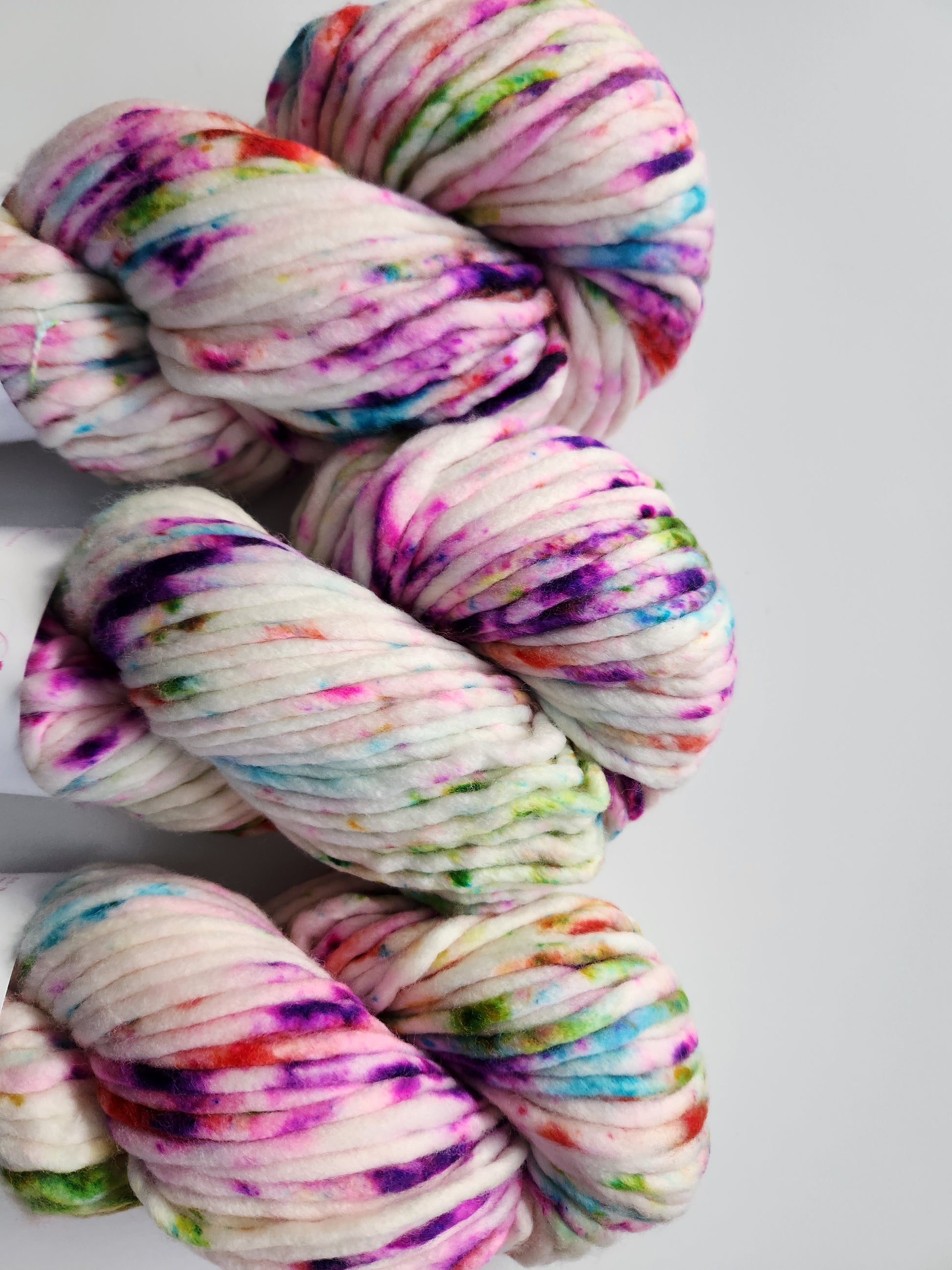 Baah Mammoth 100% superwash single ply merino wool. Each skein is 90 yards of hand-dyed squishy beauty, perfect for plump, quick knit or crochet projects.