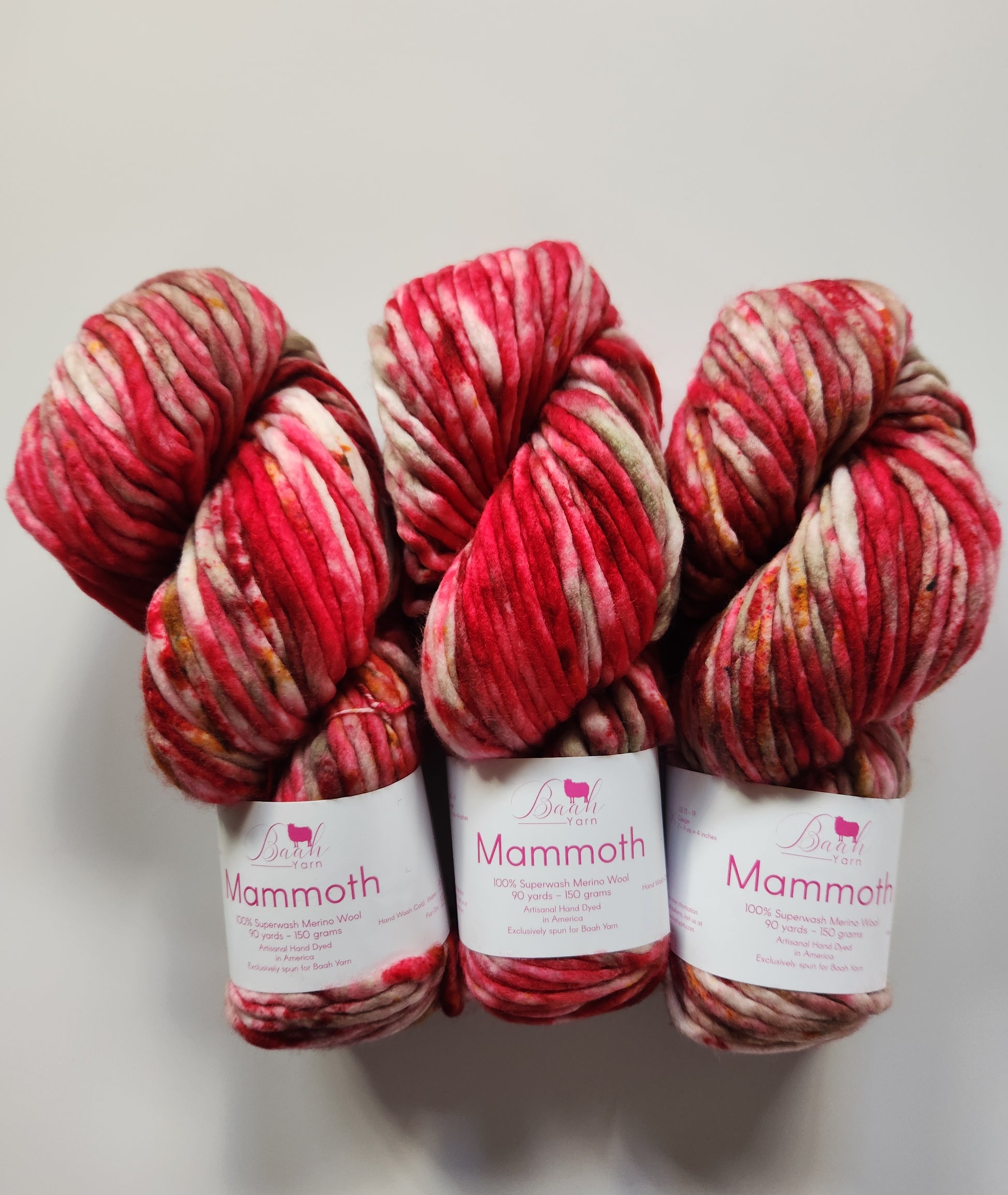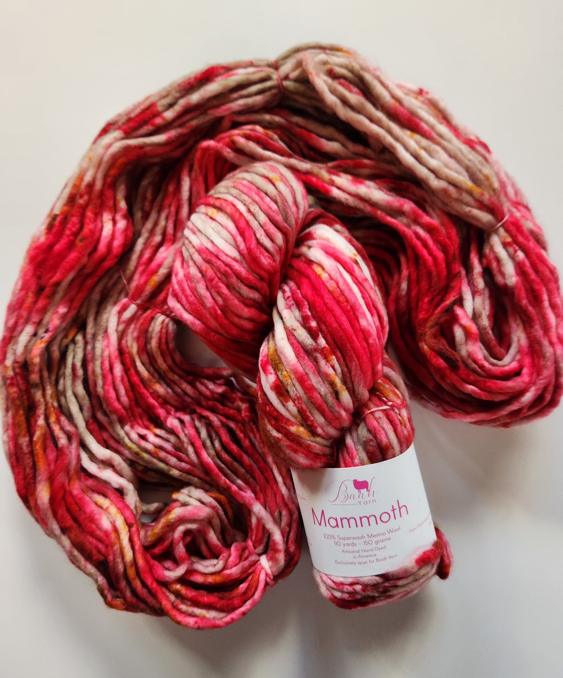 Baah Mammoth 100% superwash single ply merino wool. Each skein is 90 yards of hand-dyed squishy beauty, perfect for plump, quick knit or crochet projects.