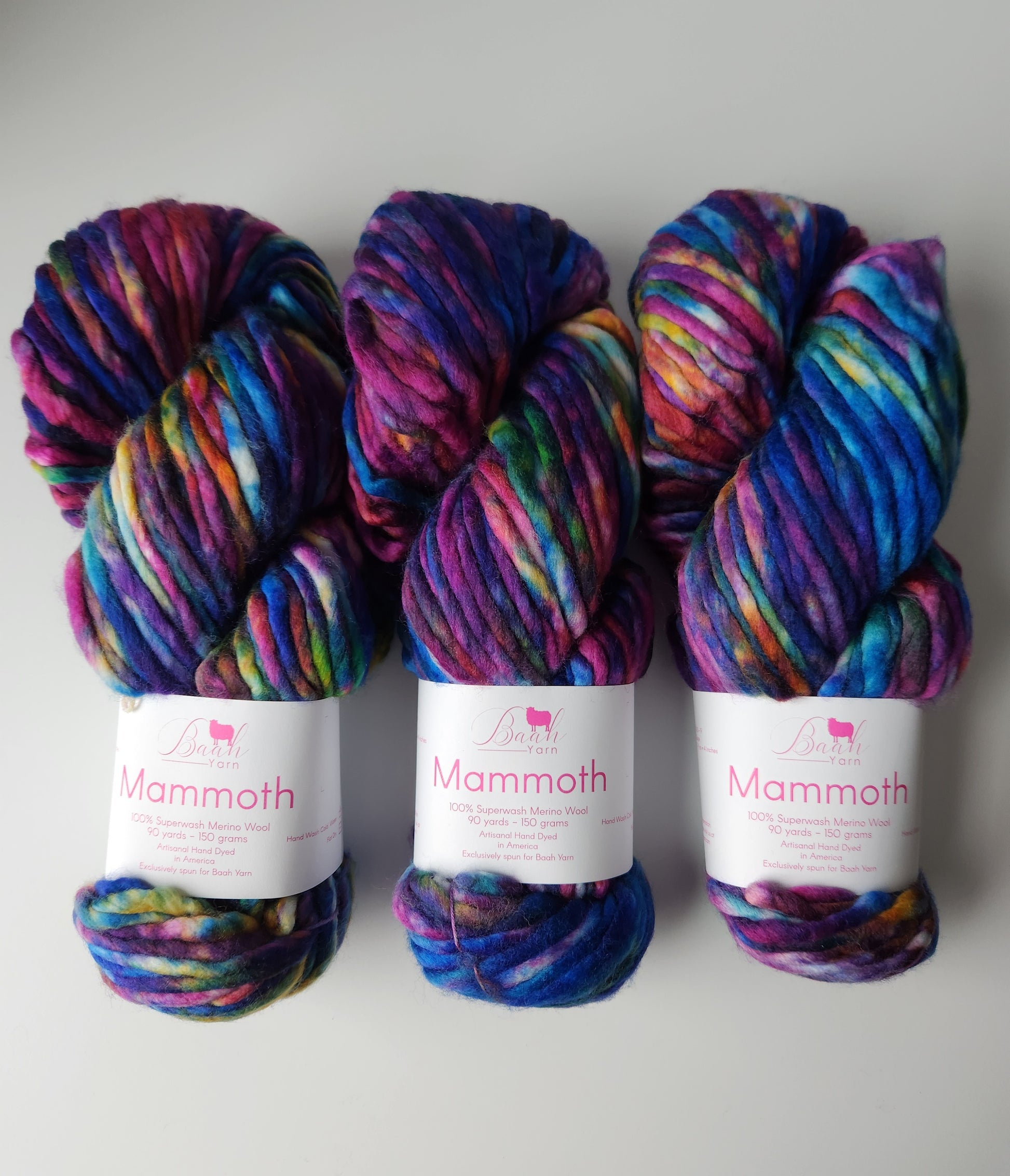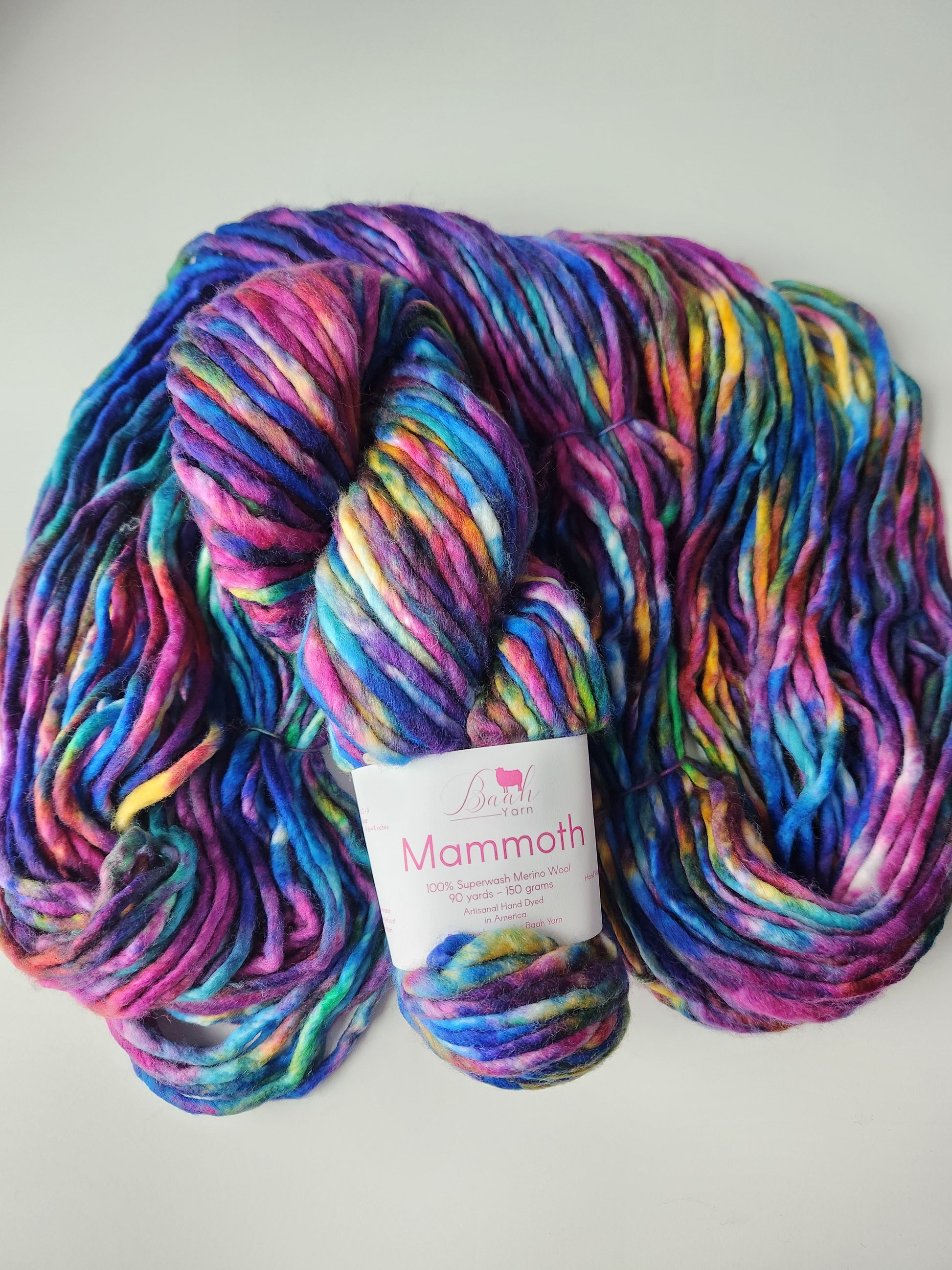 Baah Mammoth 100% superwash single ply merino wool. Each skein is 90 yards of hand-dyed squishy beauty, perfect for plump, quick knit or crochet projects.