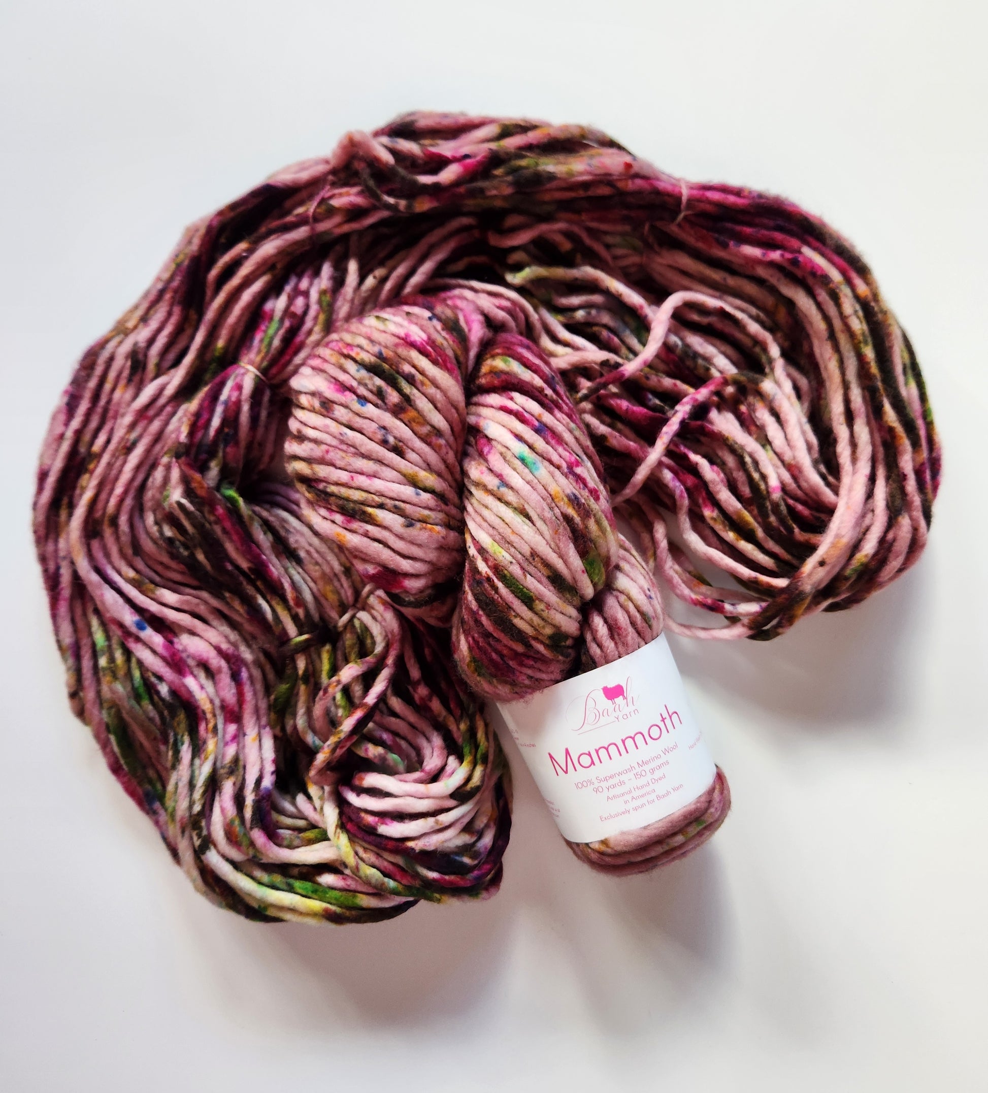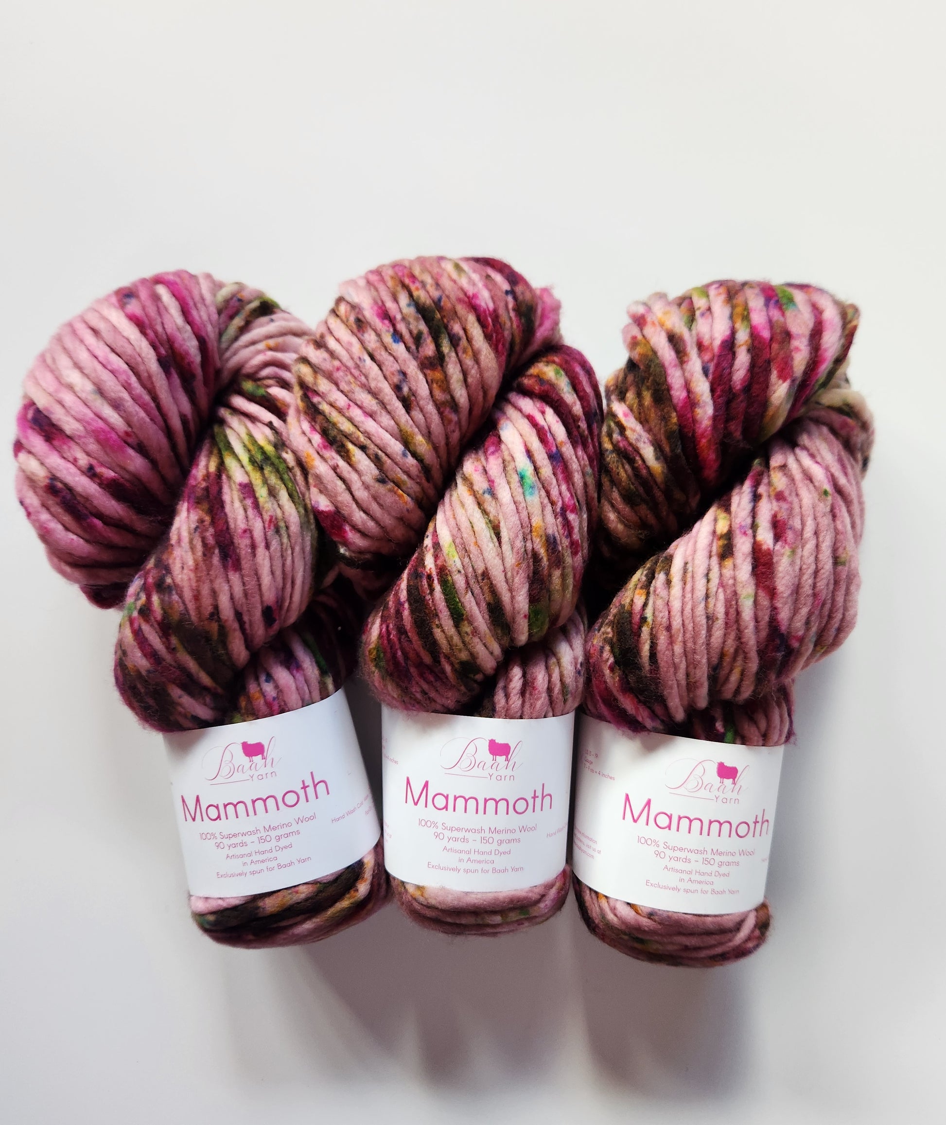 Baah Mammoth 100% superwash single ply merino wool. Each skein is 90 yards of hand-dyed squishy beauty, perfect for plump, quick knit or crochet projects.