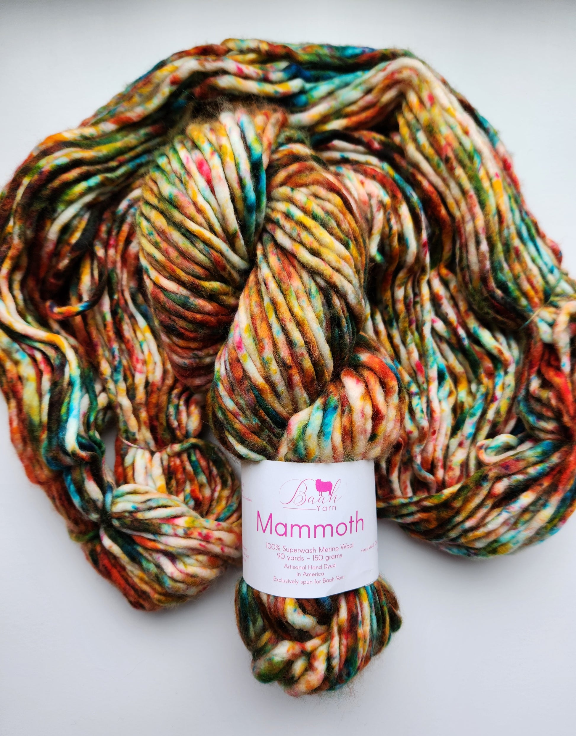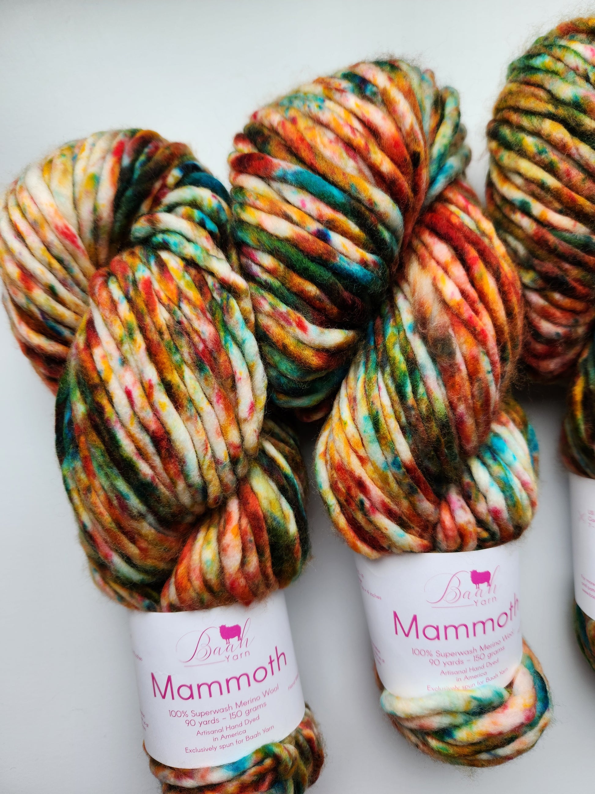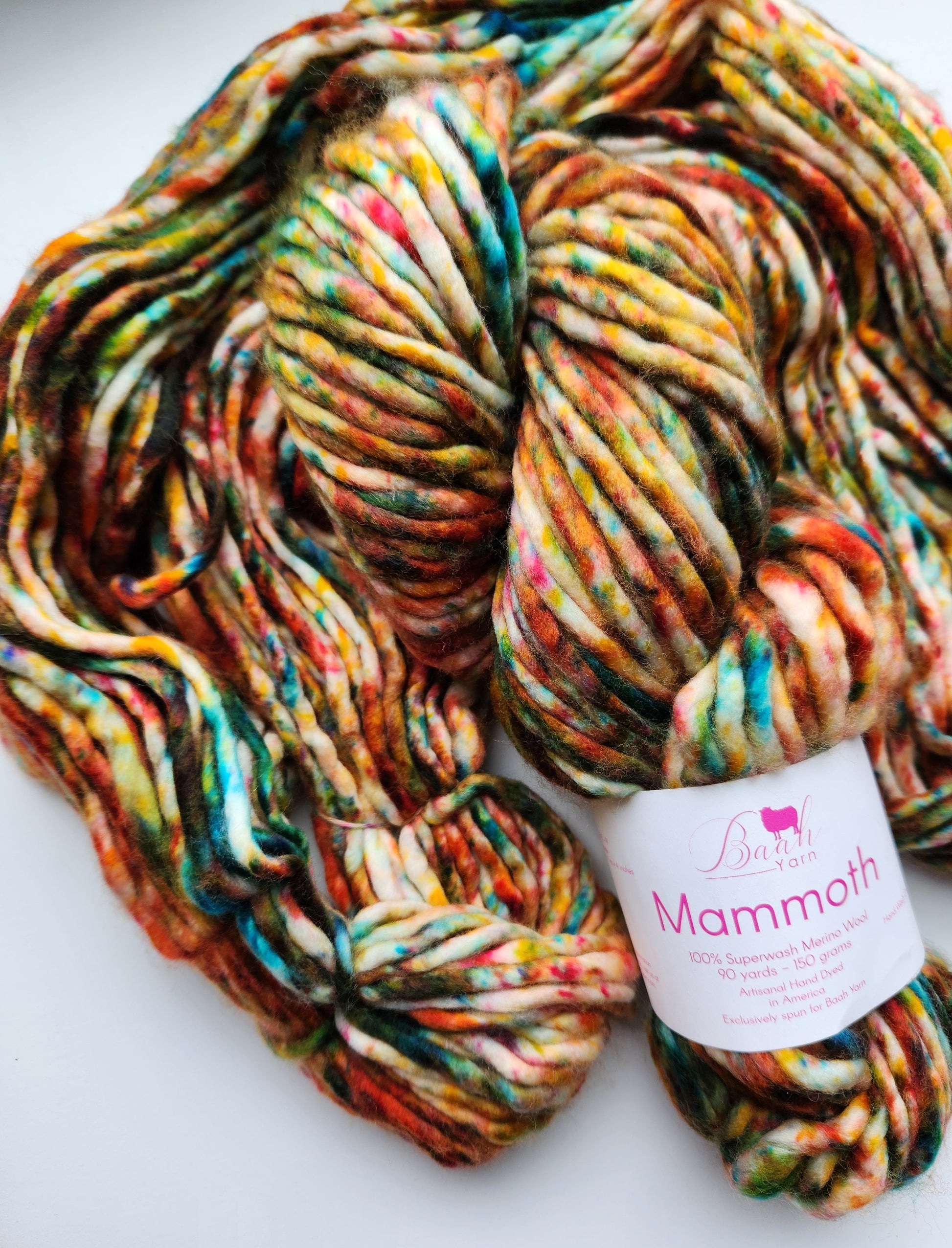 Baah Mammoth 100% superwash single ply merino wool. Each skein is 90 yards of hand-dyed squishy beauty, perfect for plump, quick knit or crochet projects.