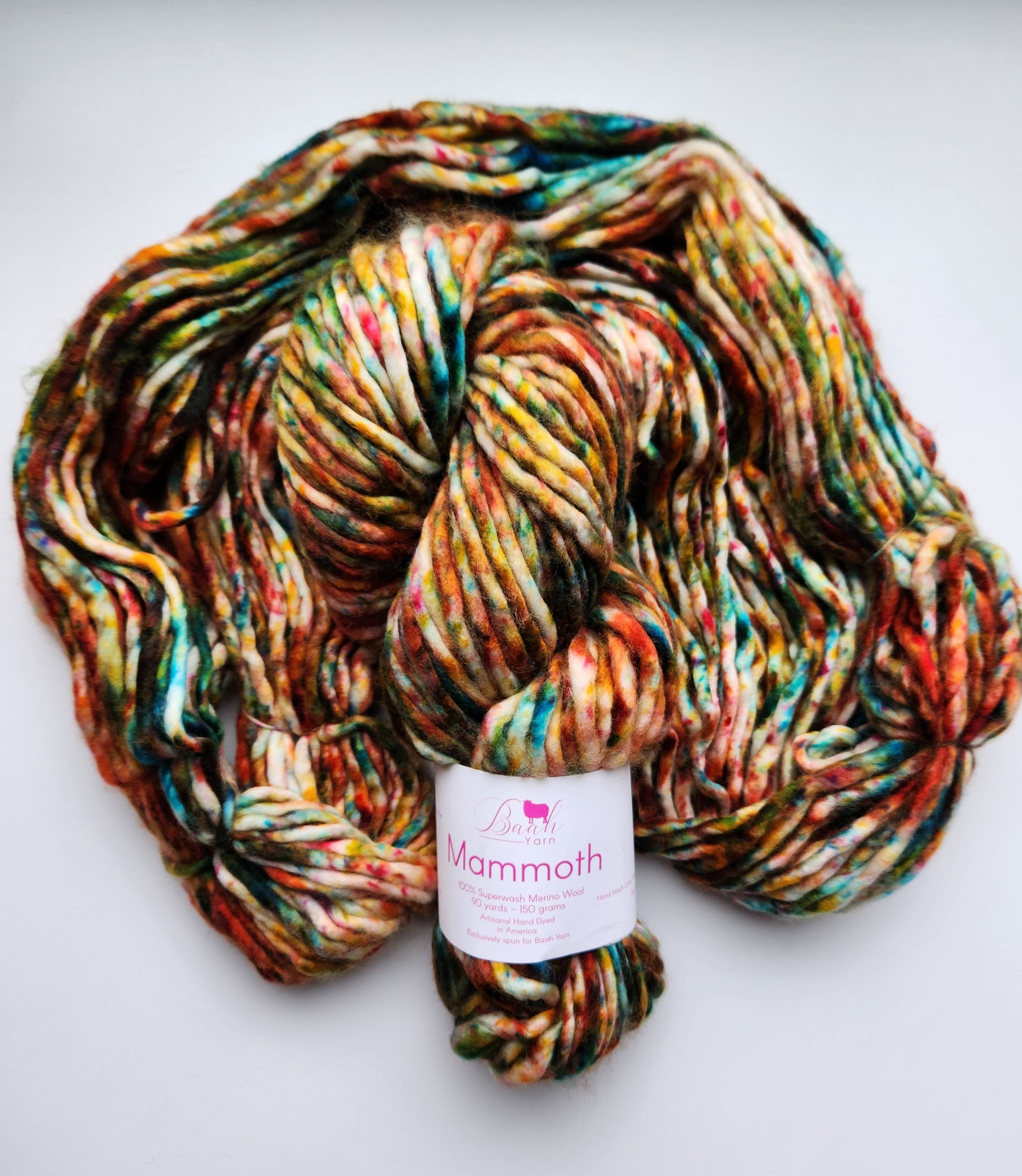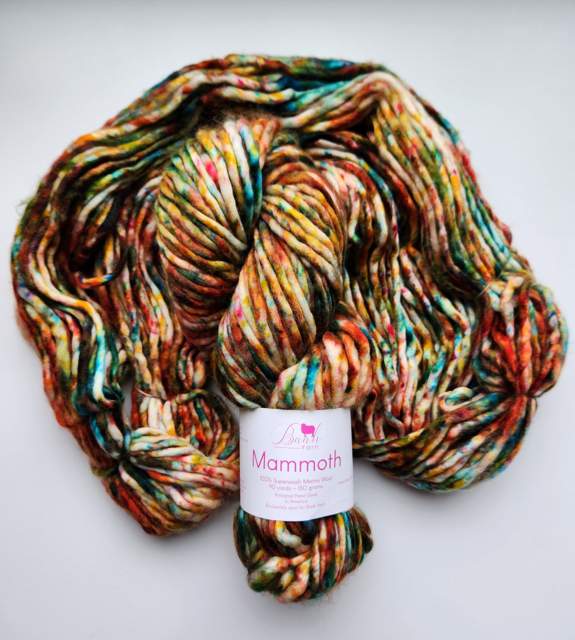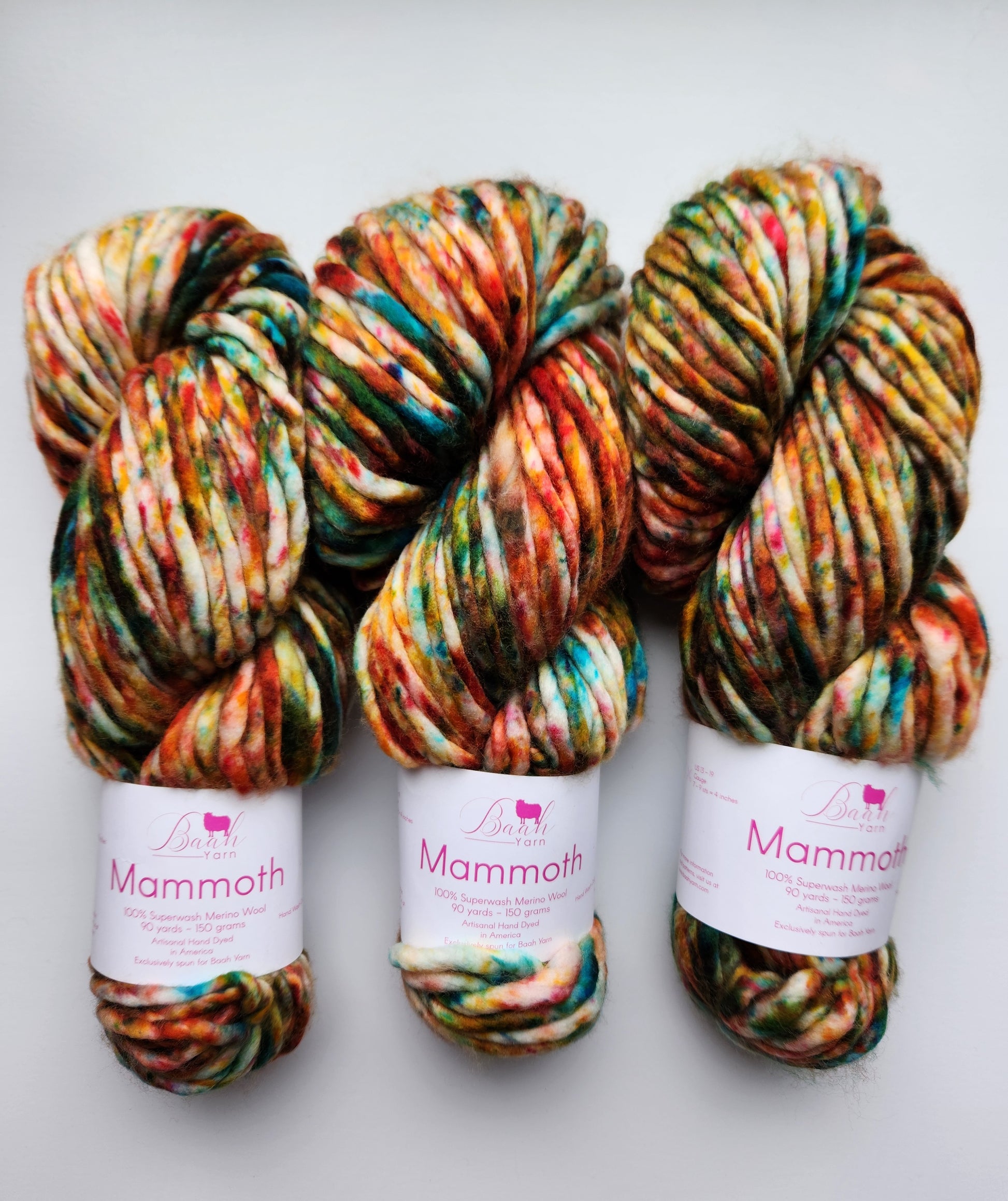 Baah Mammoth 100% superwash single ply merino wool. Each skein is 90 yards of hand-dyed squishy beauty, perfect for plump, quick knit or crochet projects.