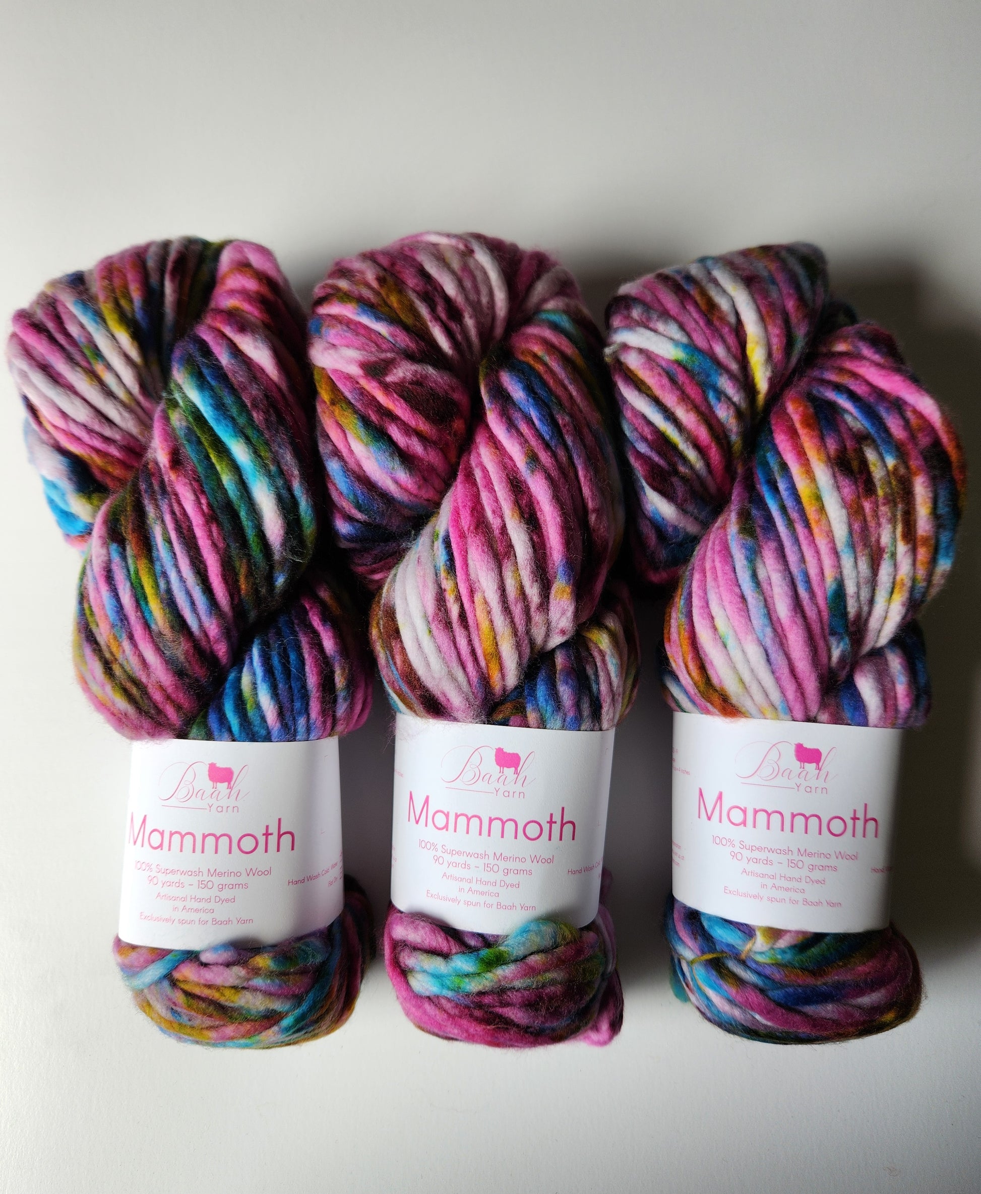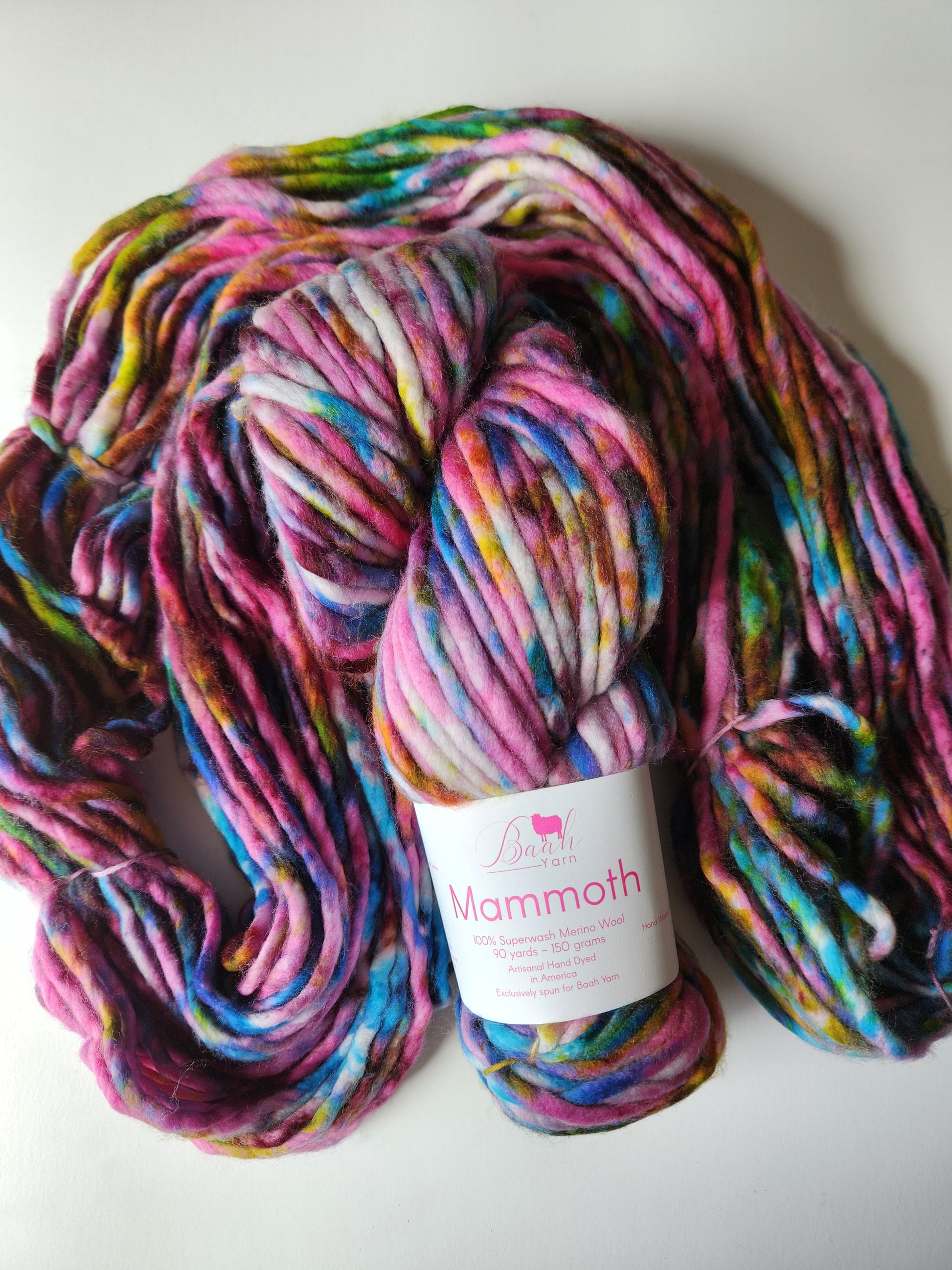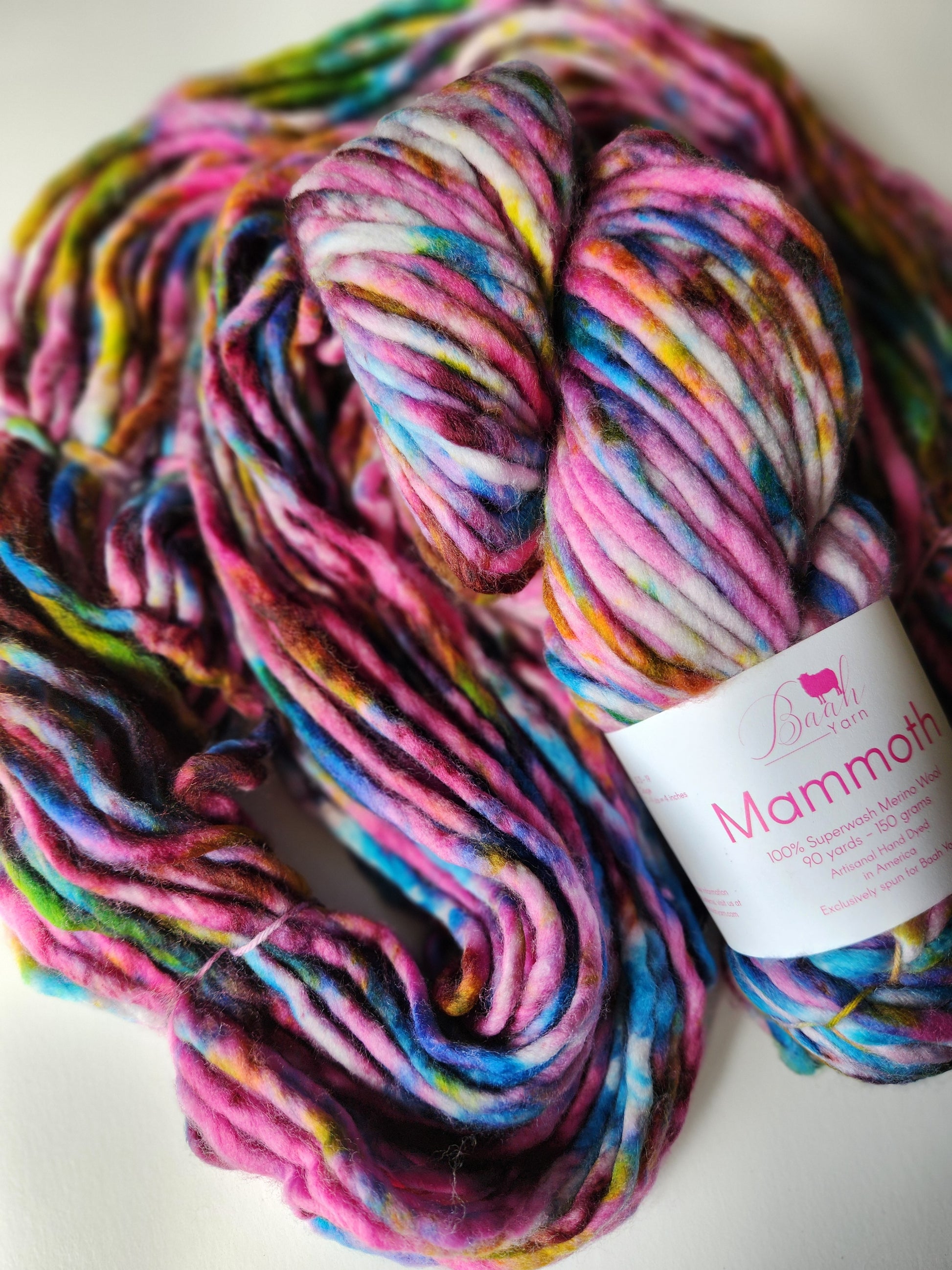 Baah Mammoth 100% superwash single ply merino wool. Each skein is 90 yards of hand-dyed squishy beauty, perfect for plump, quick knit or crochet projects.