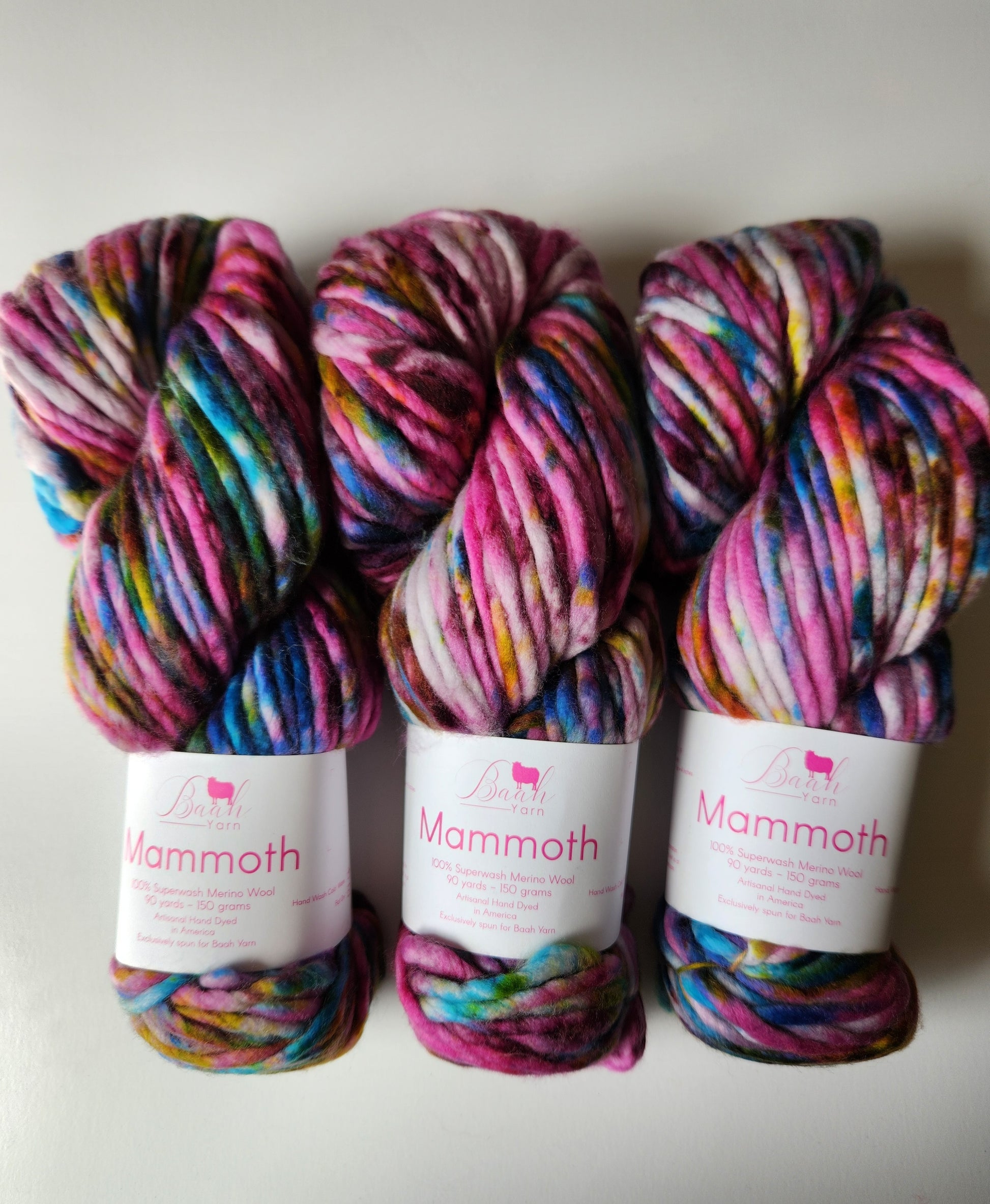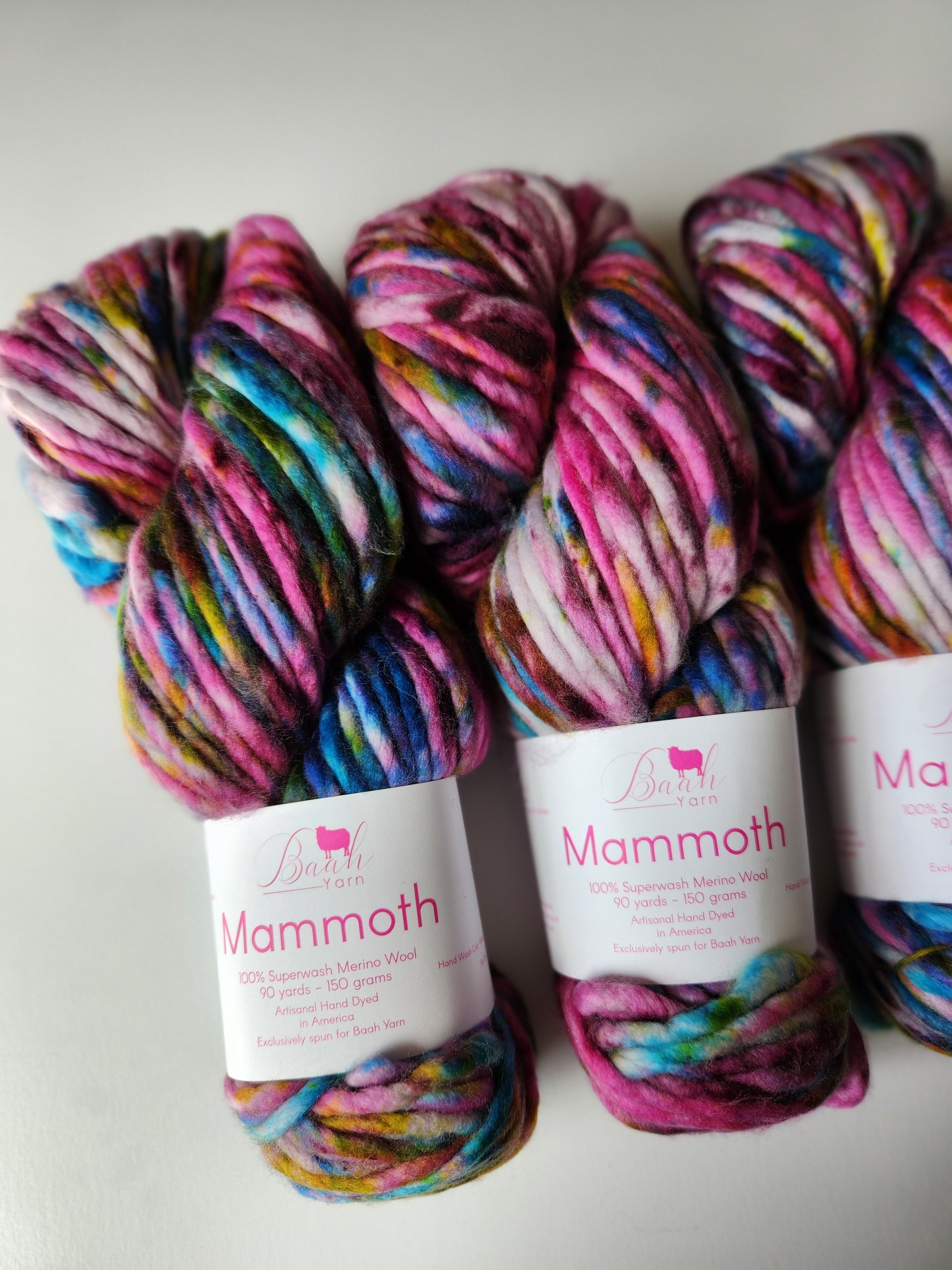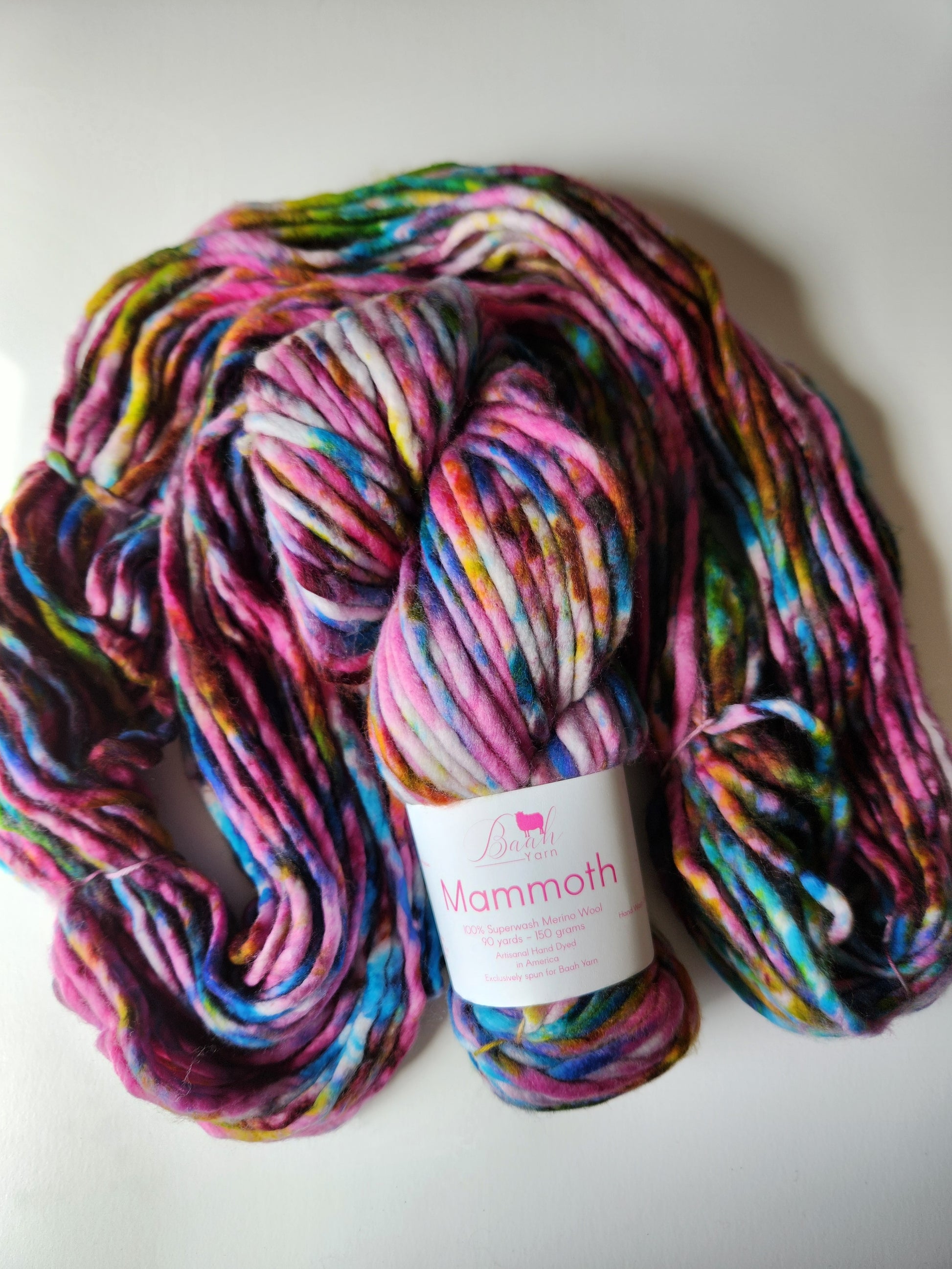 Baah Mammoth 100% superwash single ply merino wool. Each skein is 90 yards of hand-dyed squishy beauty, perfect for plump, quick knit or crochet projects.