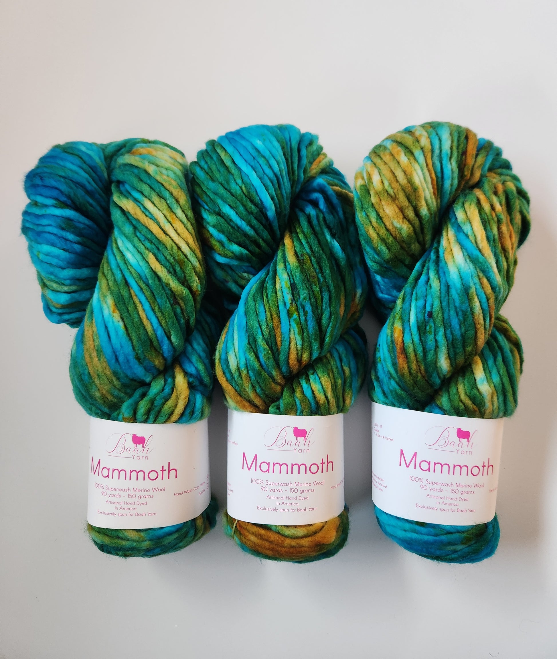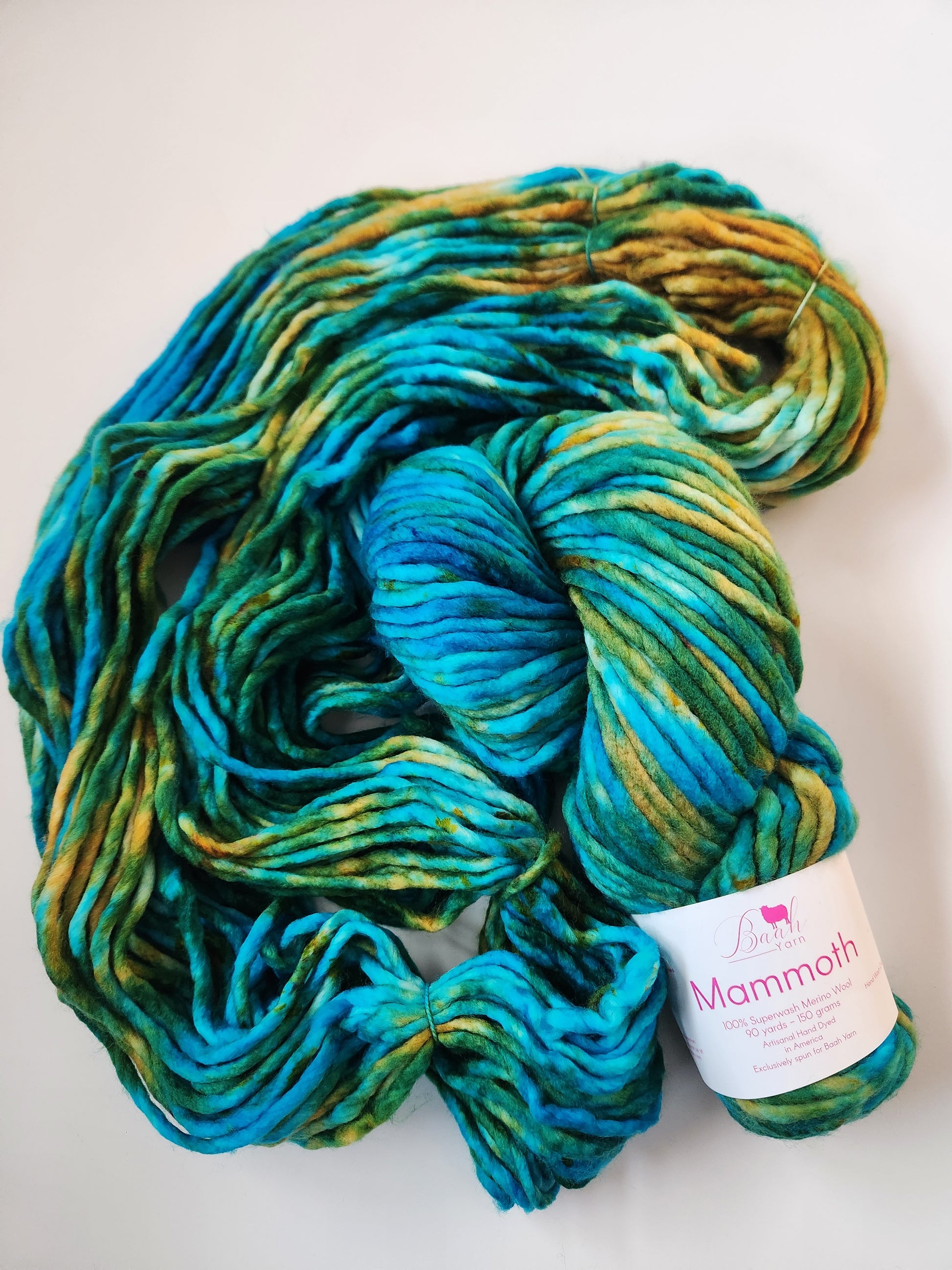Baah Mammoth 100% superwash single ply merino wool. Each skein is 90 yards of hand-dyed squishy beauty, perfect for plump, quick knit or crochet projects.