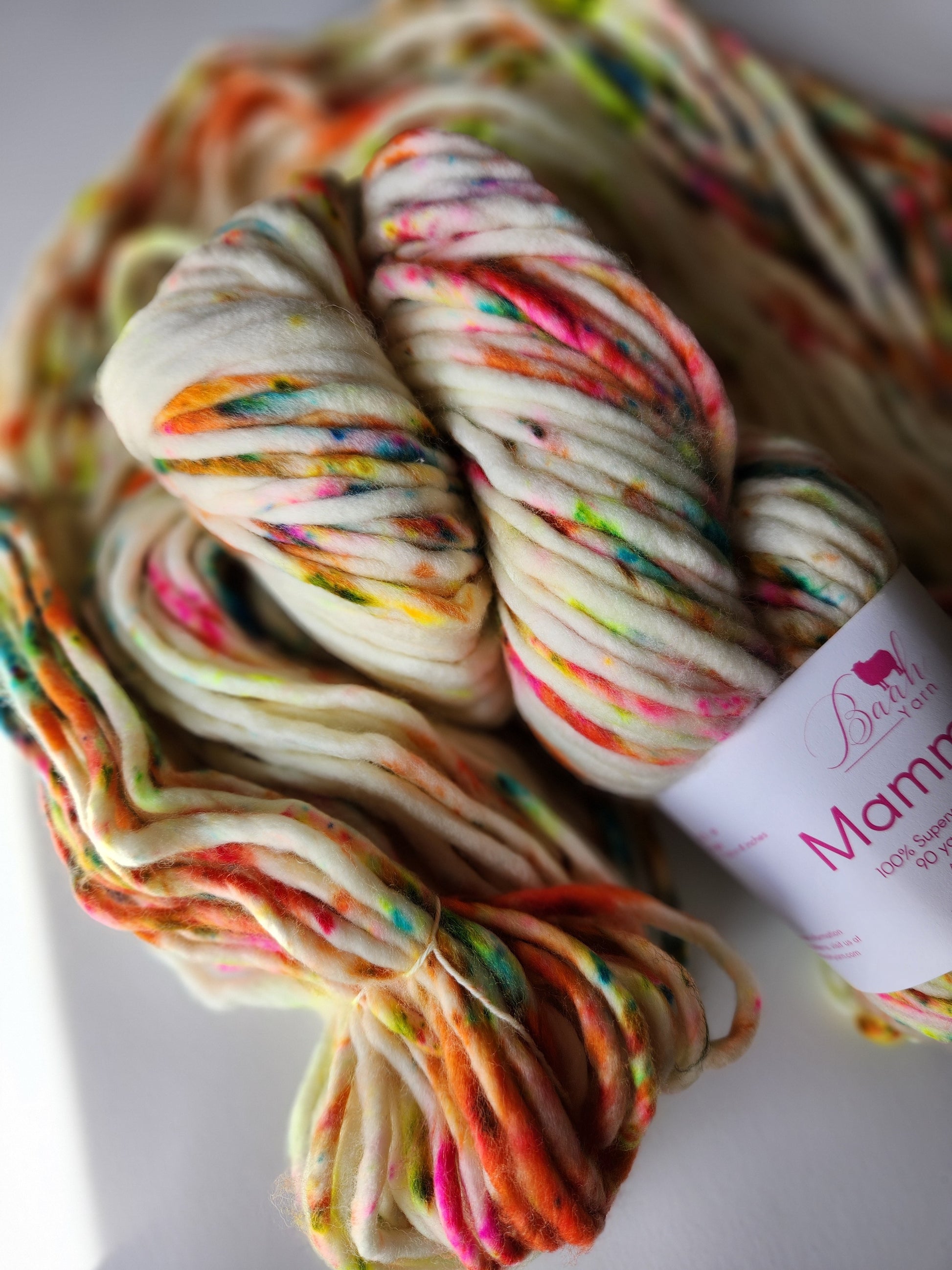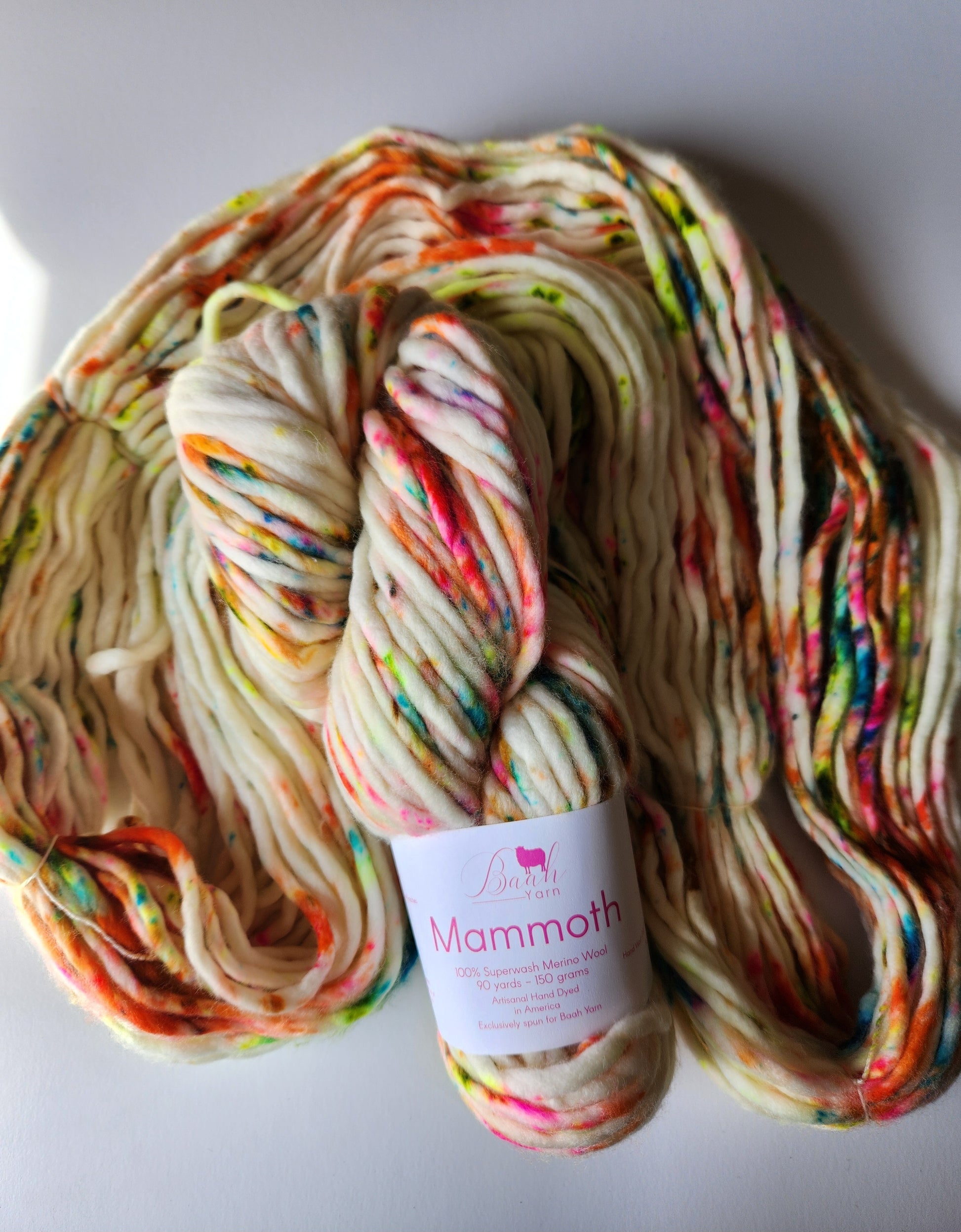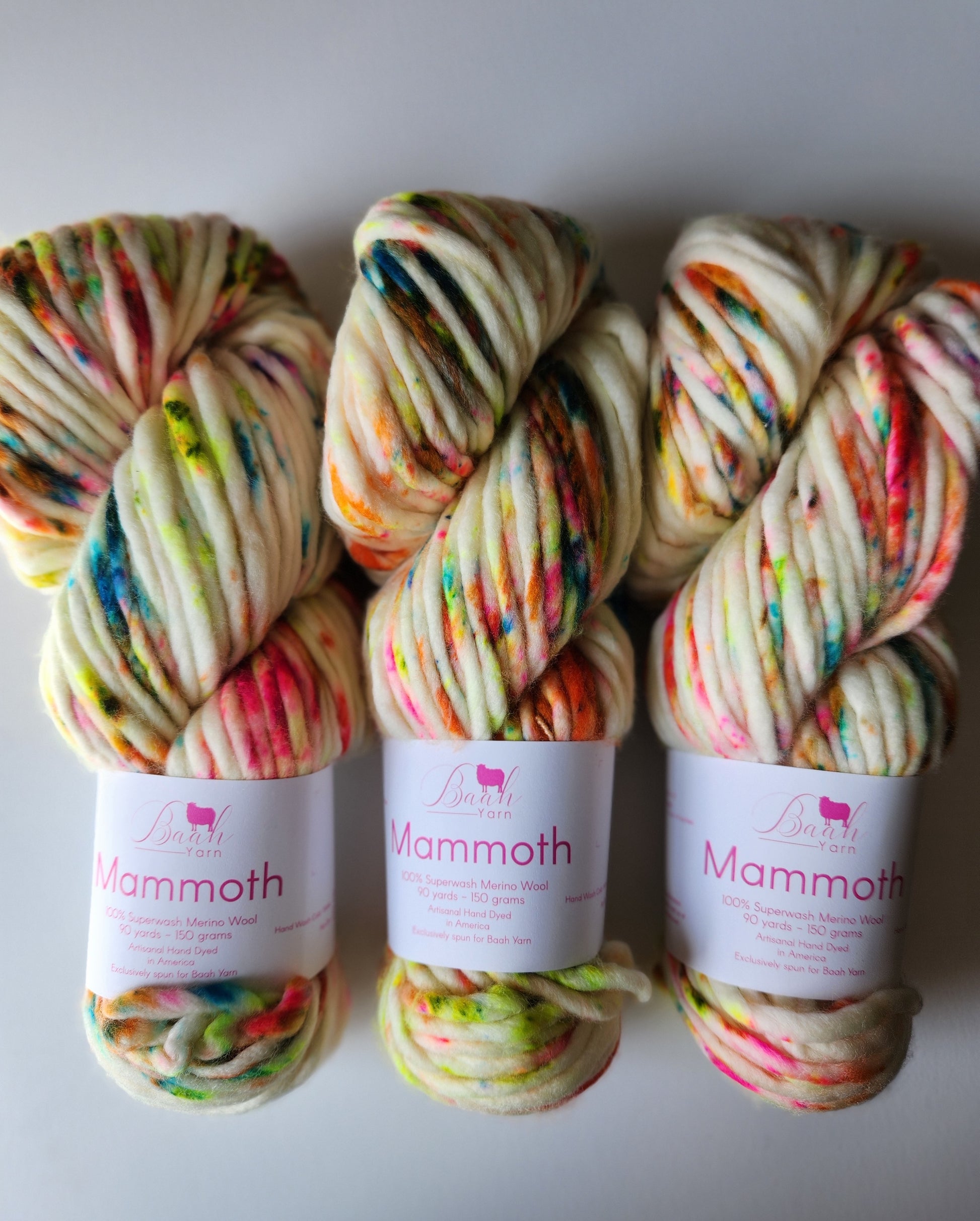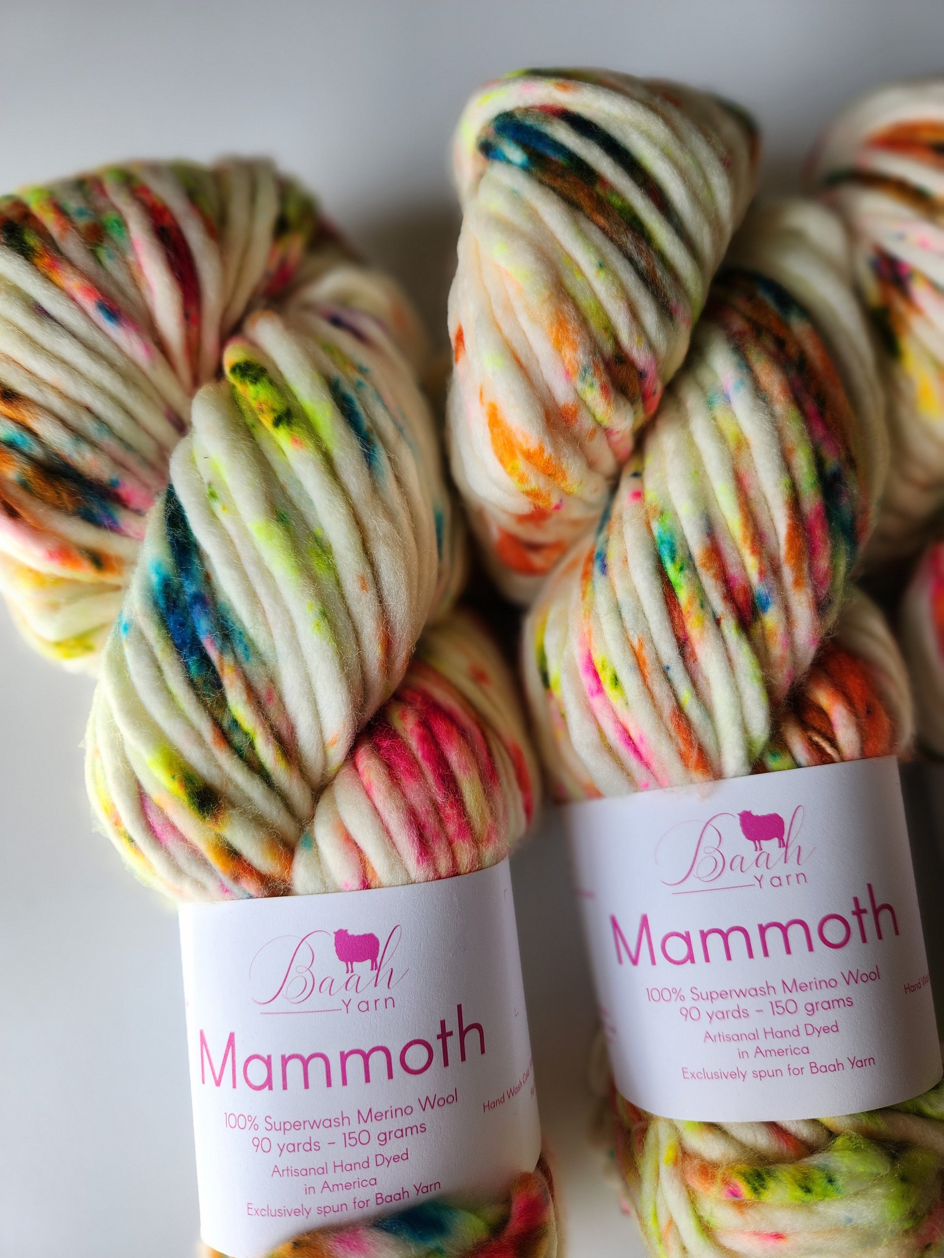 Baah Mammoth 100% superwash single ply merino wool. Each skein is 90 yards of hand-dyed squishy beauty, perfect for plump, quick knit or crochet projects.