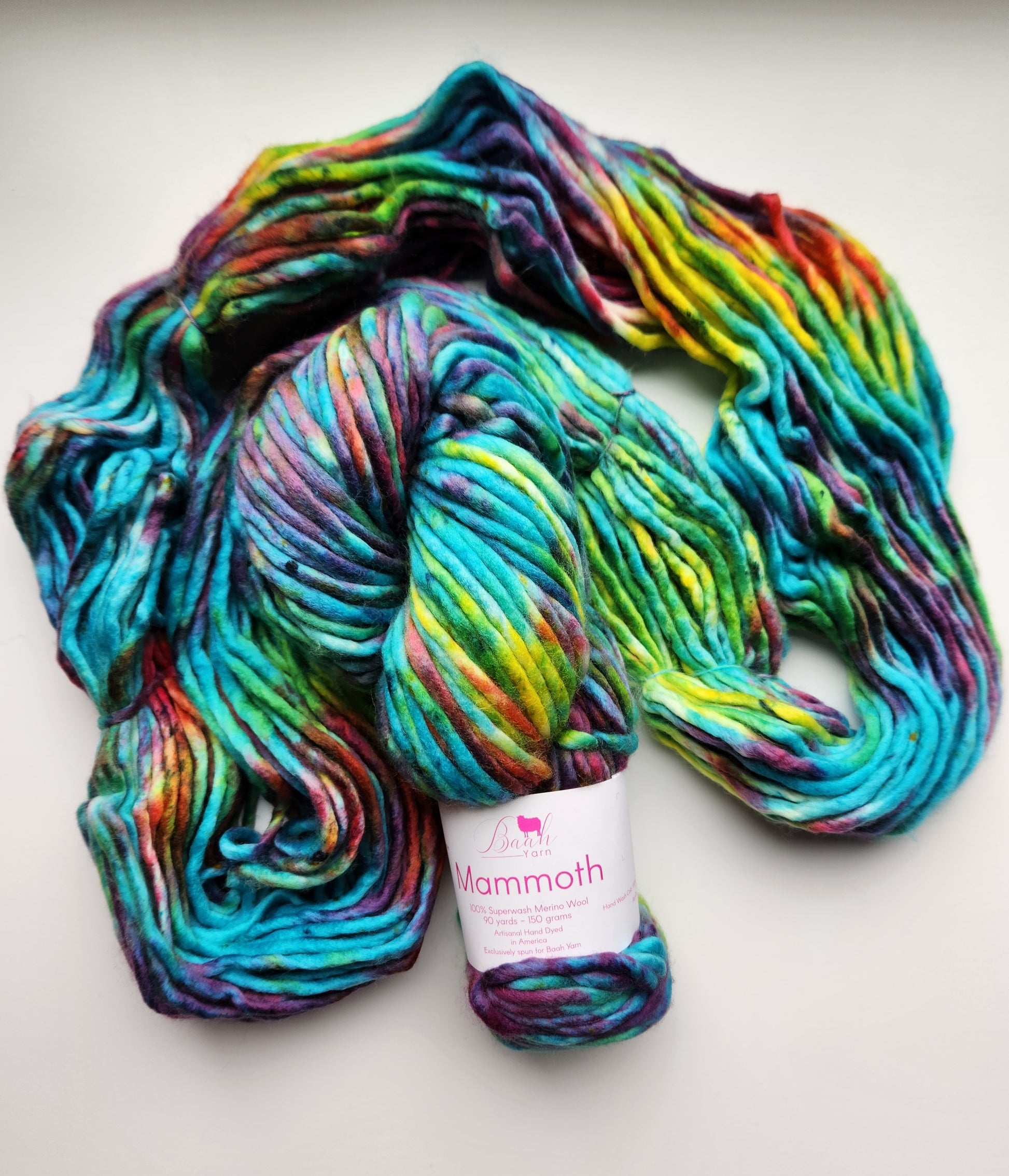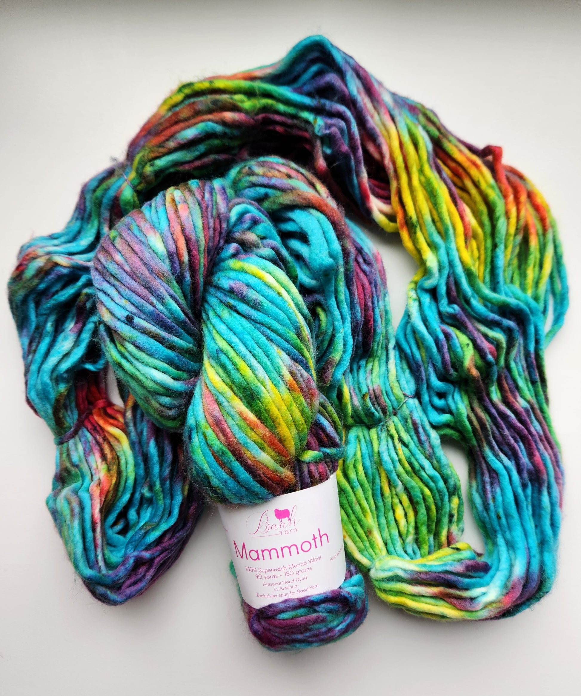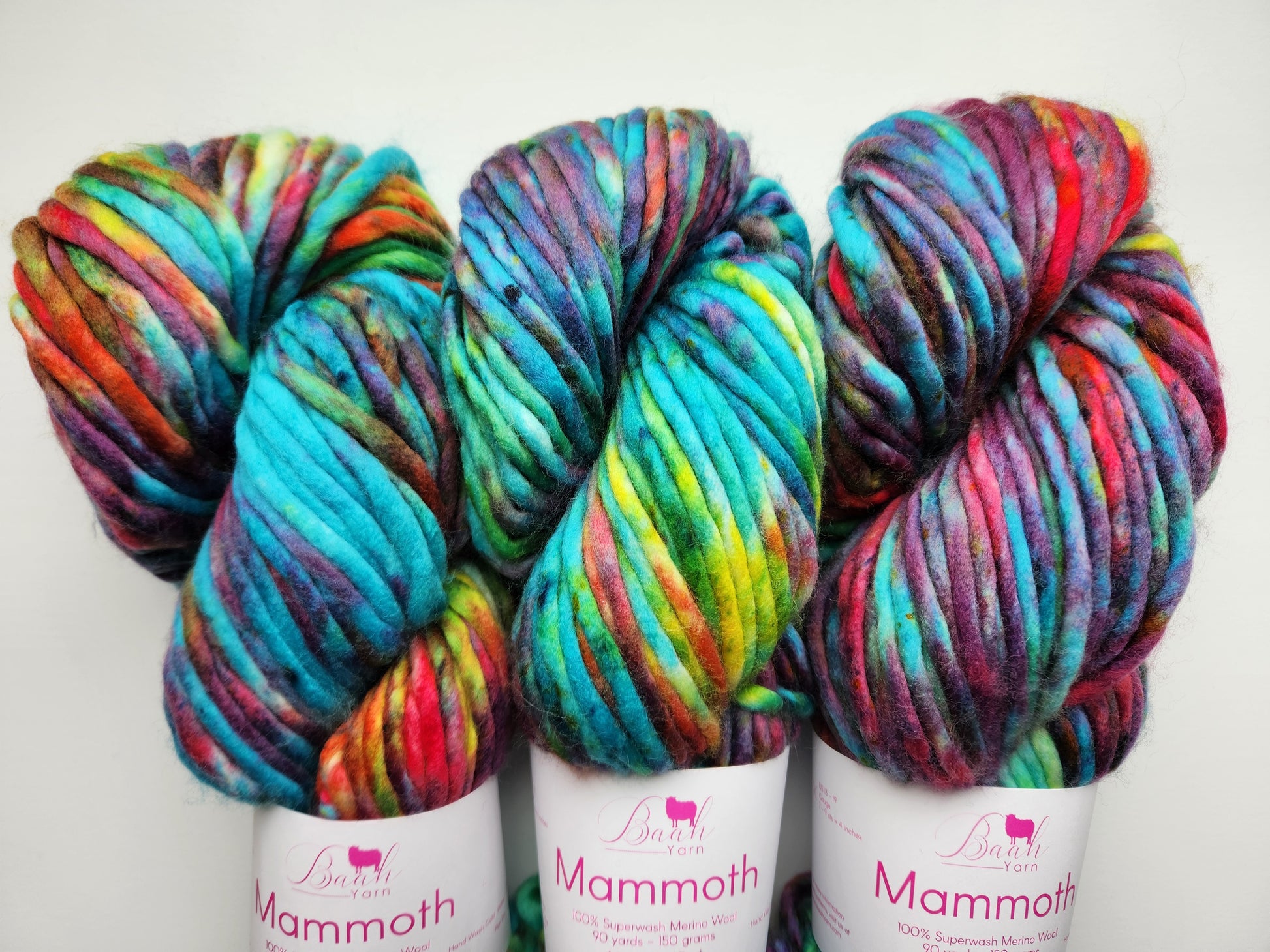 Baah Mammoth 100% superwash single ply merino wool. Each skein is 90 yards of hand-dyed squishy beauty, perfect for plump, quick knit or crochet projects.