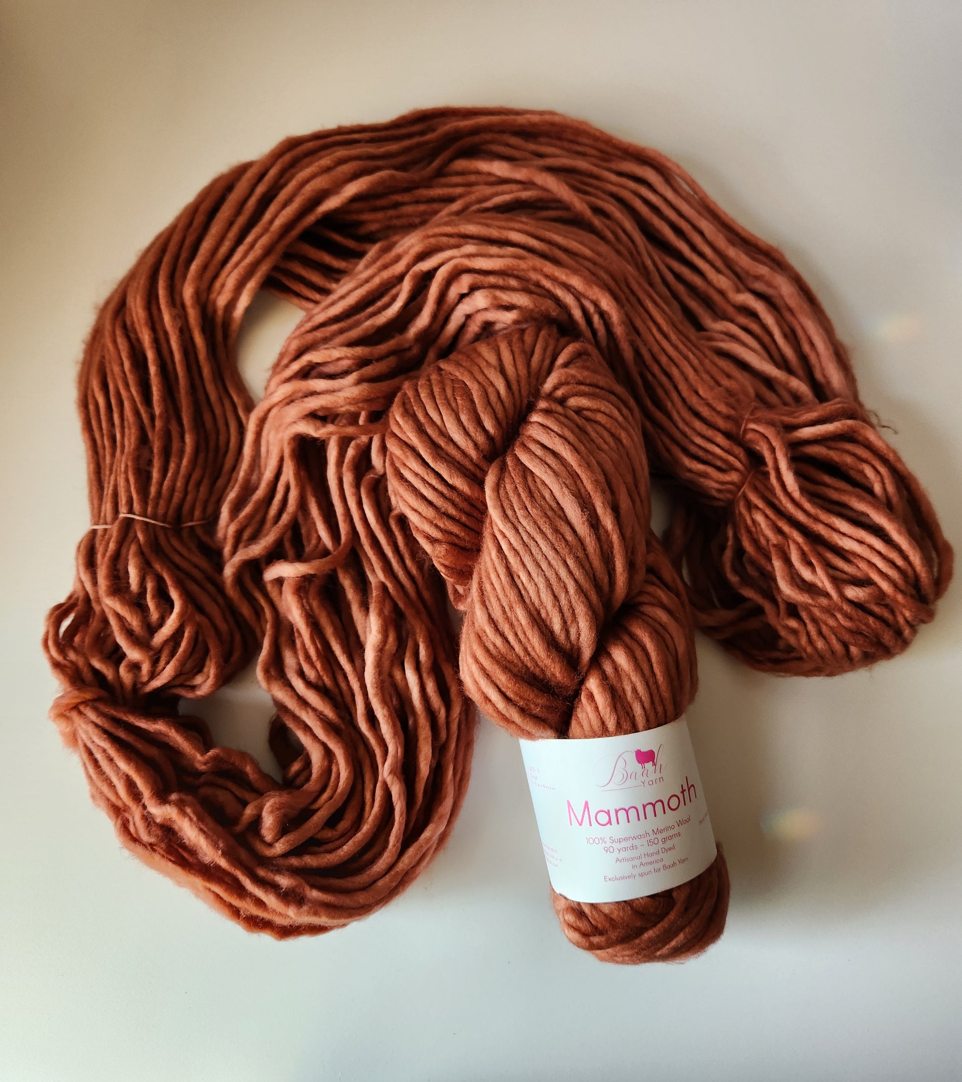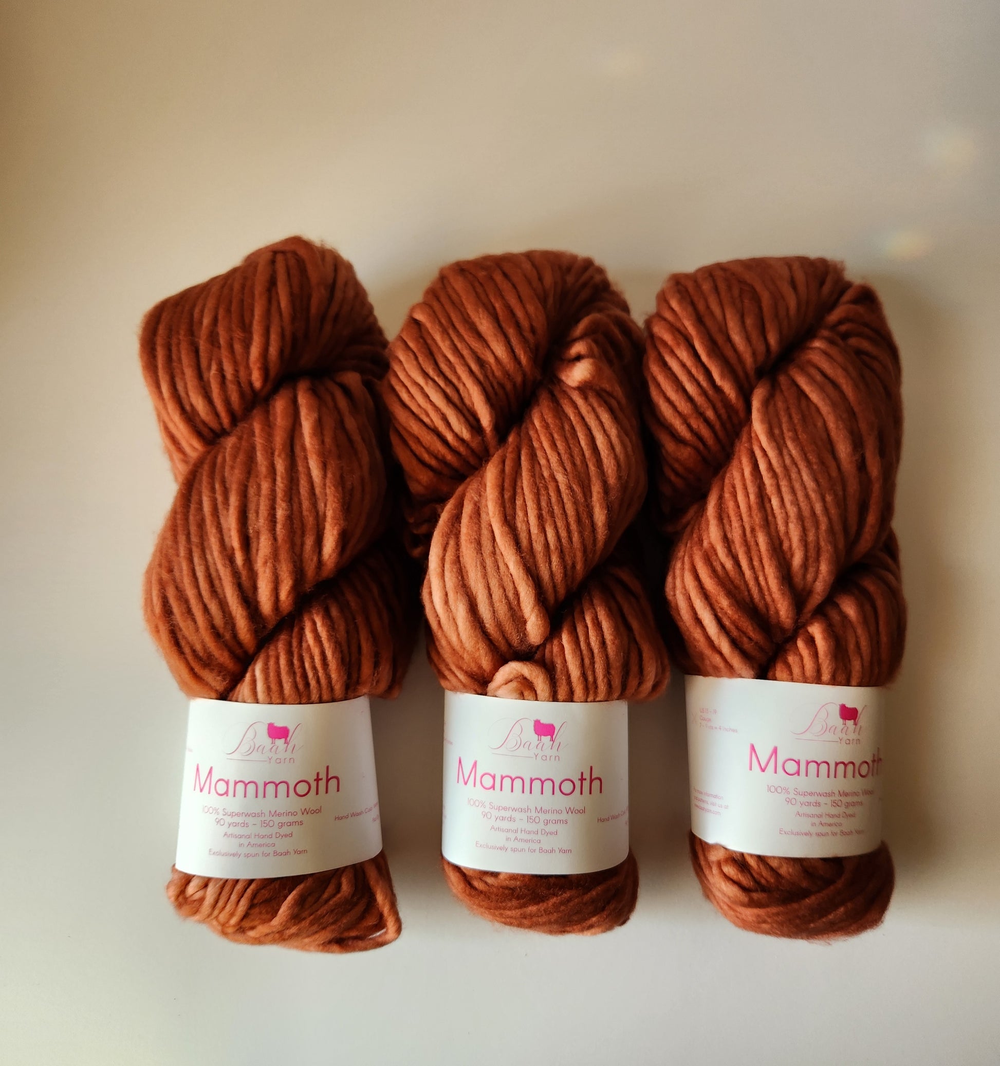 Baah Mammoth 100% superwash single ply merino wool. Each skein is 90 yards of hand-dyed squishy beauty, perfect for plump, quick knit or crochet projects.