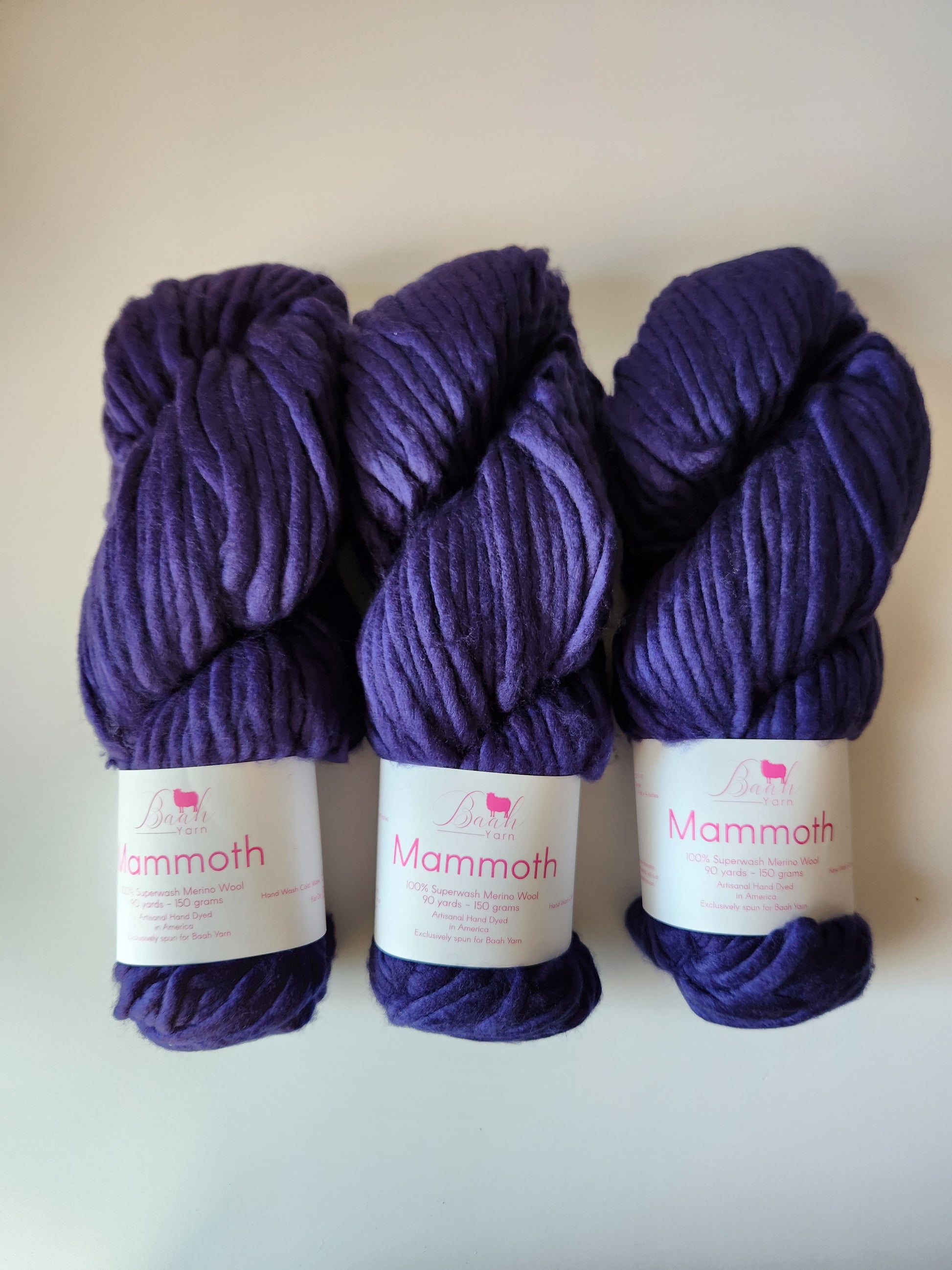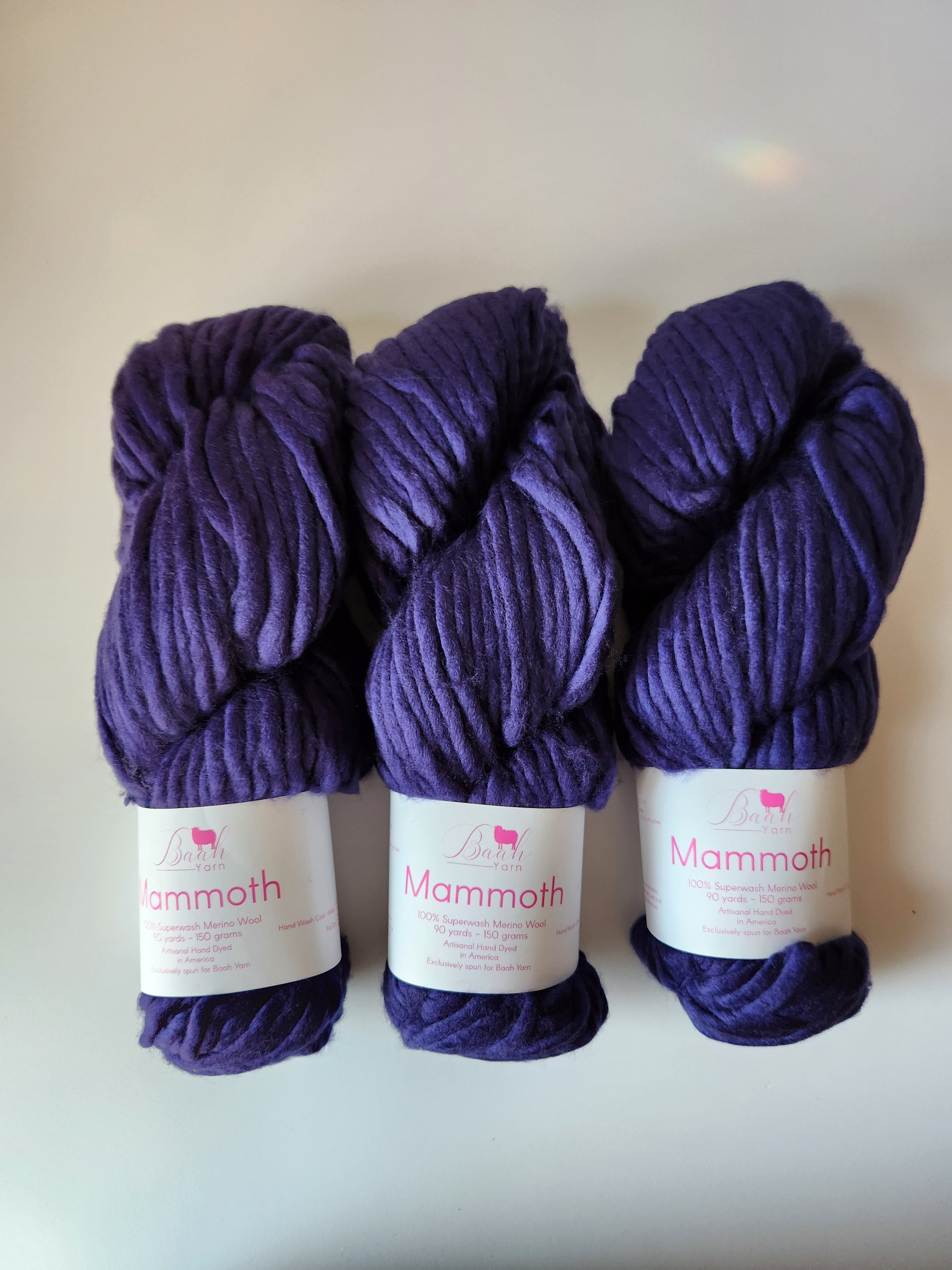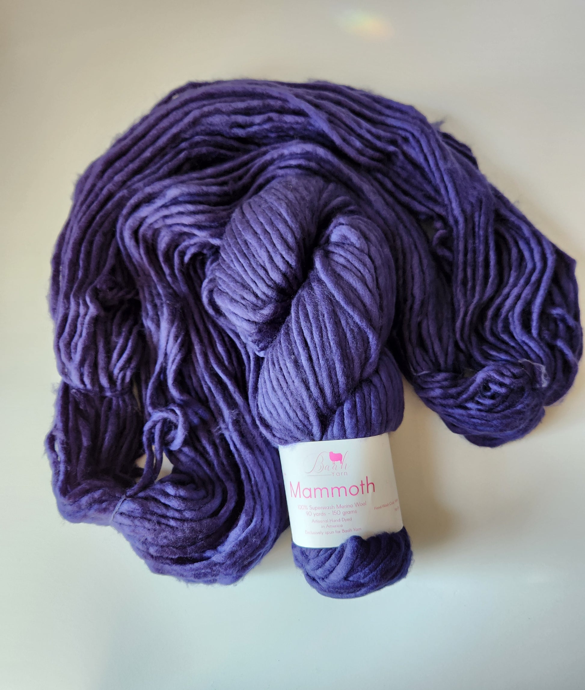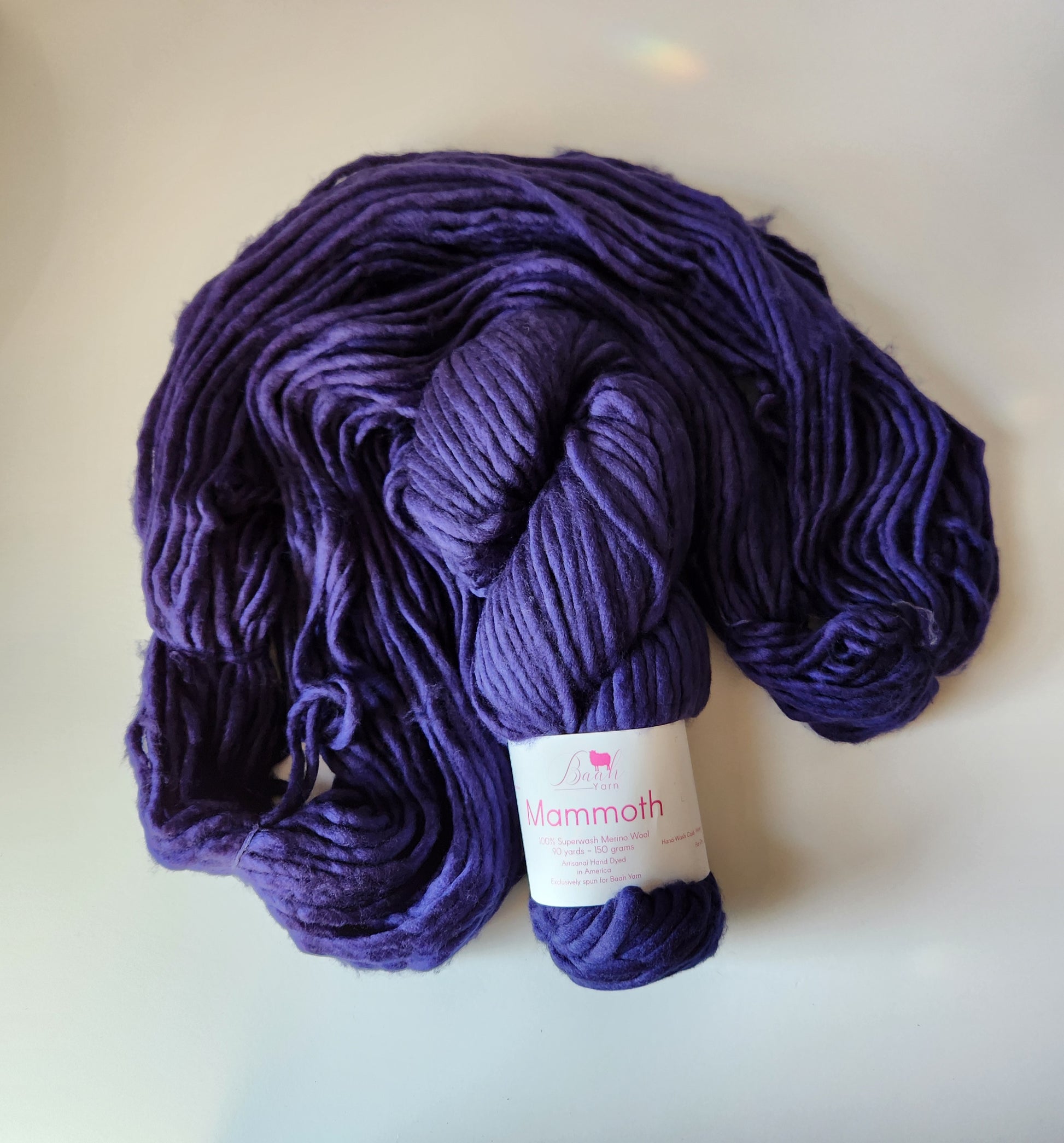 Baah Mammoth 100% superwash single ply merino wool. Each skein is 90 yards of hand-dyed squishy beauty, perfect for plump, quick knit or crochet projects.