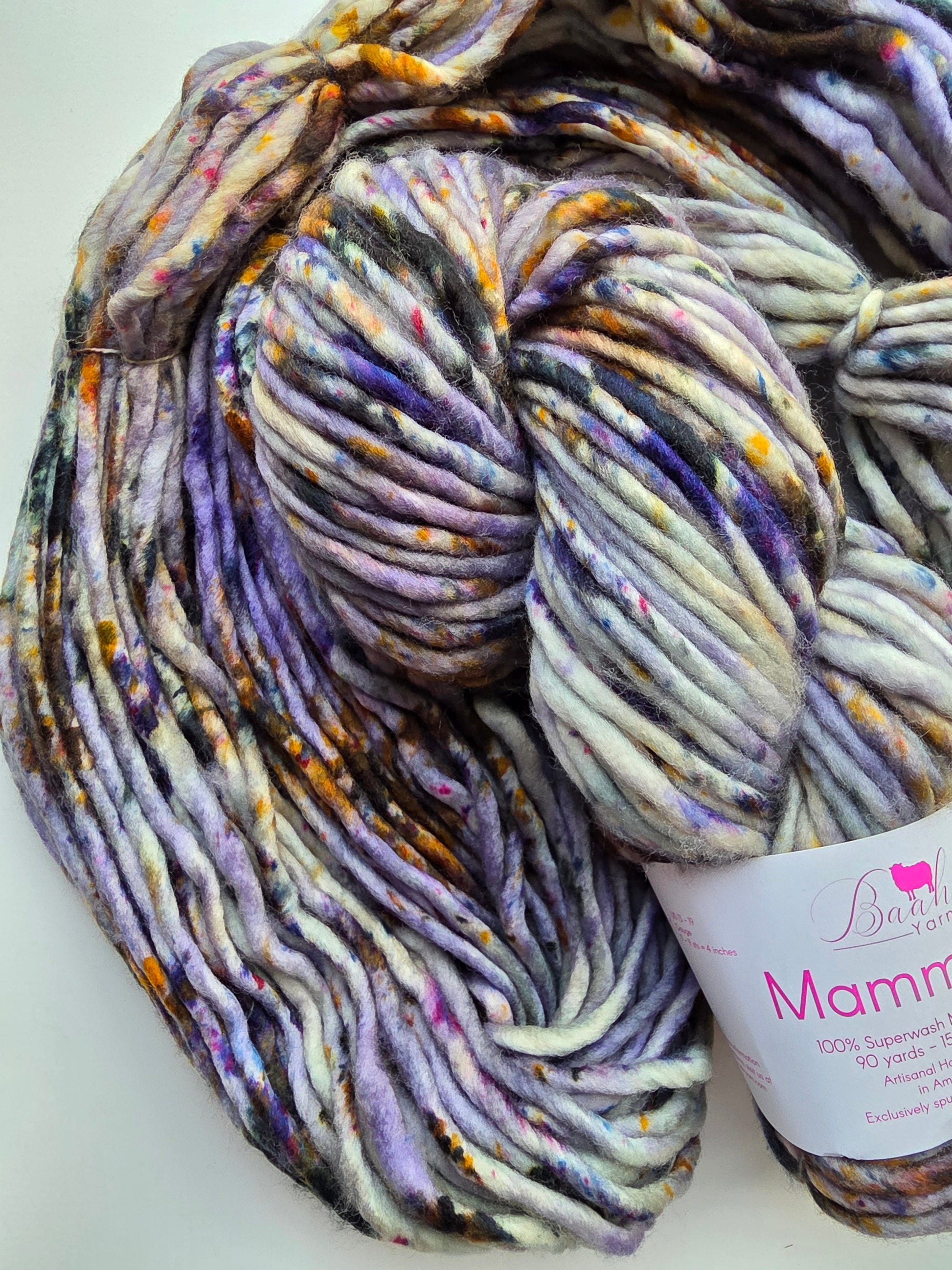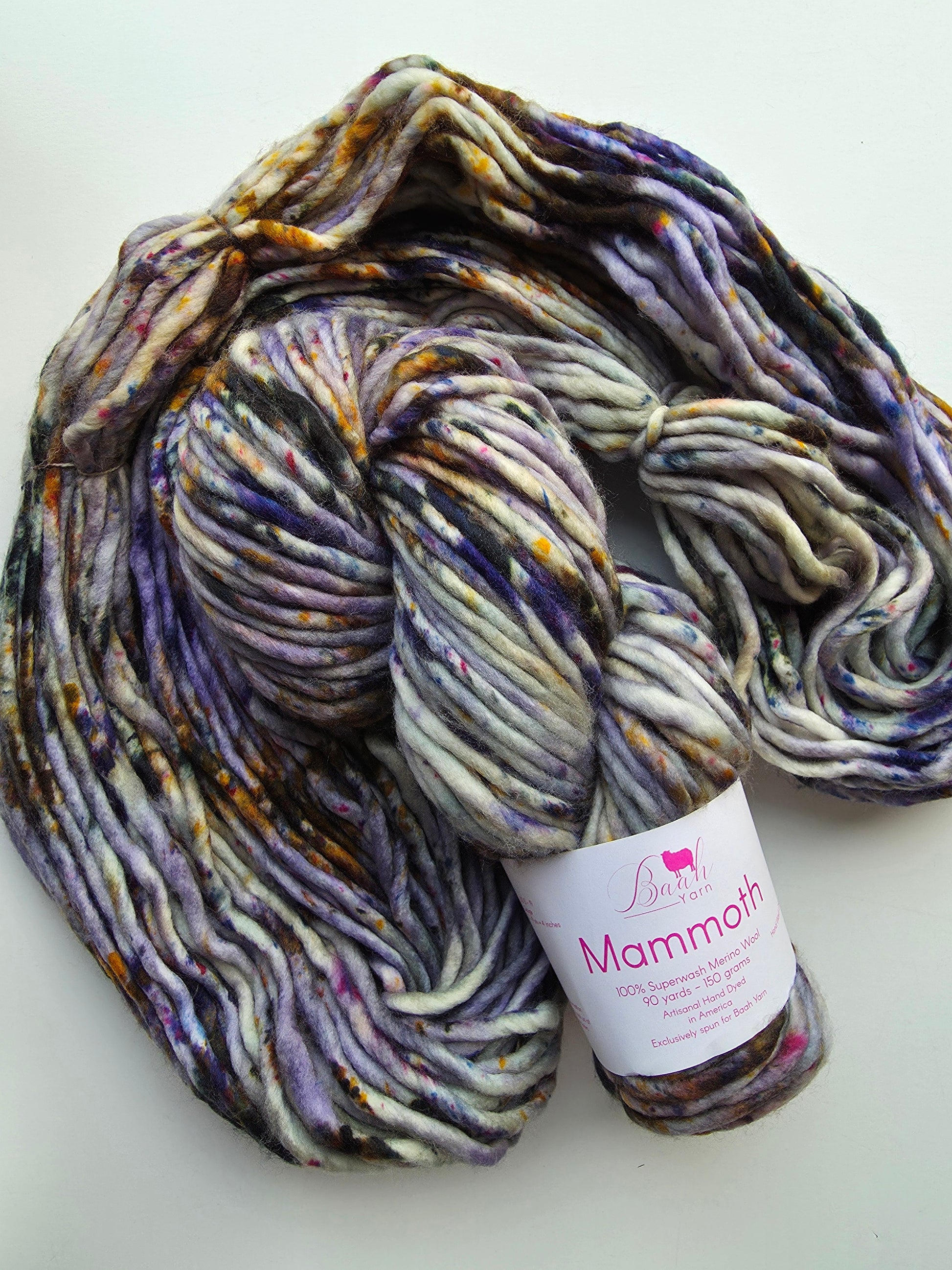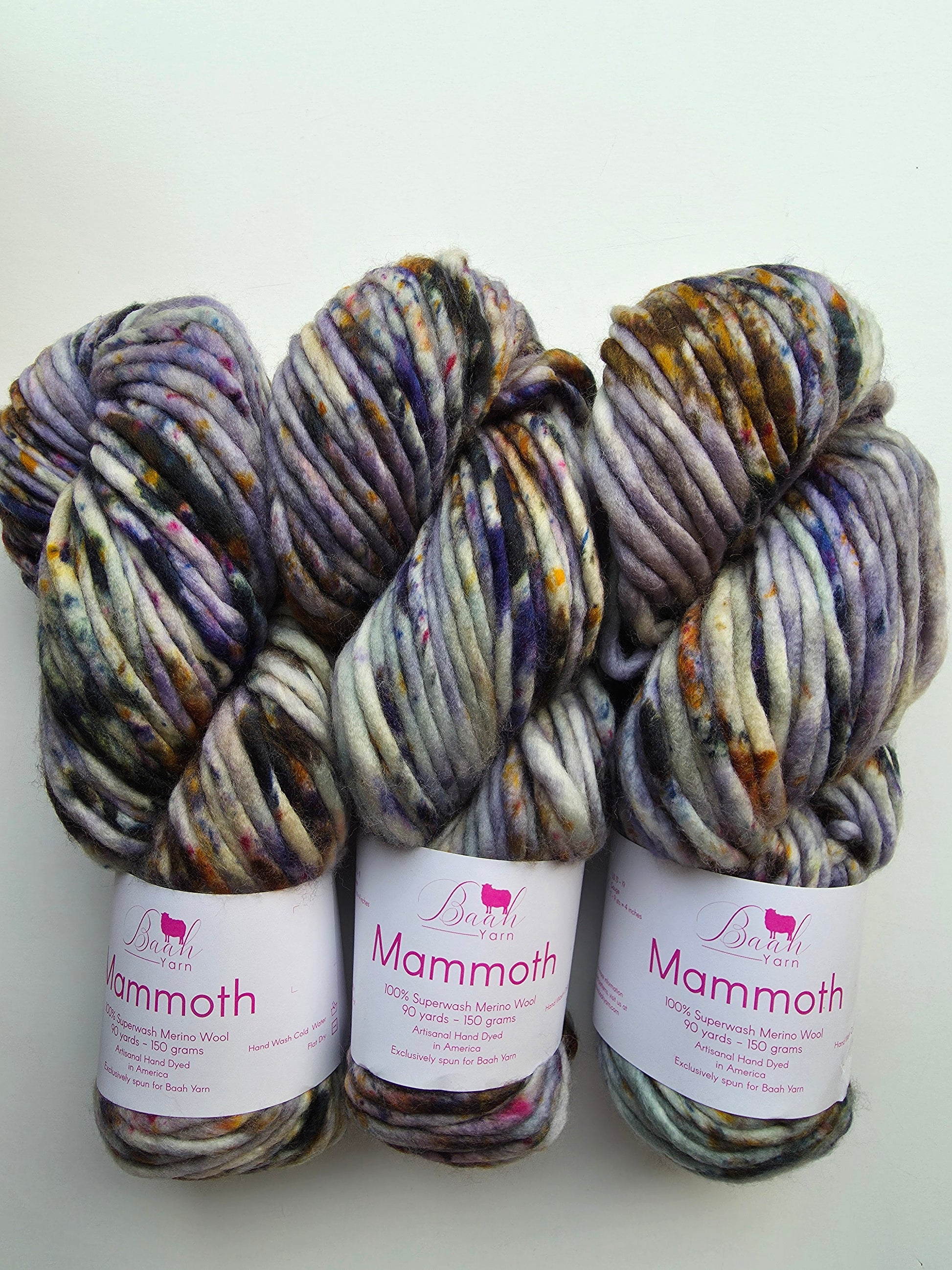 Baah Mammoth 100% superwash single ply merino wool. Each skein is 90 yards of hand-dyed squishy beauty, perfect for plump, quick knit or crochet projects.