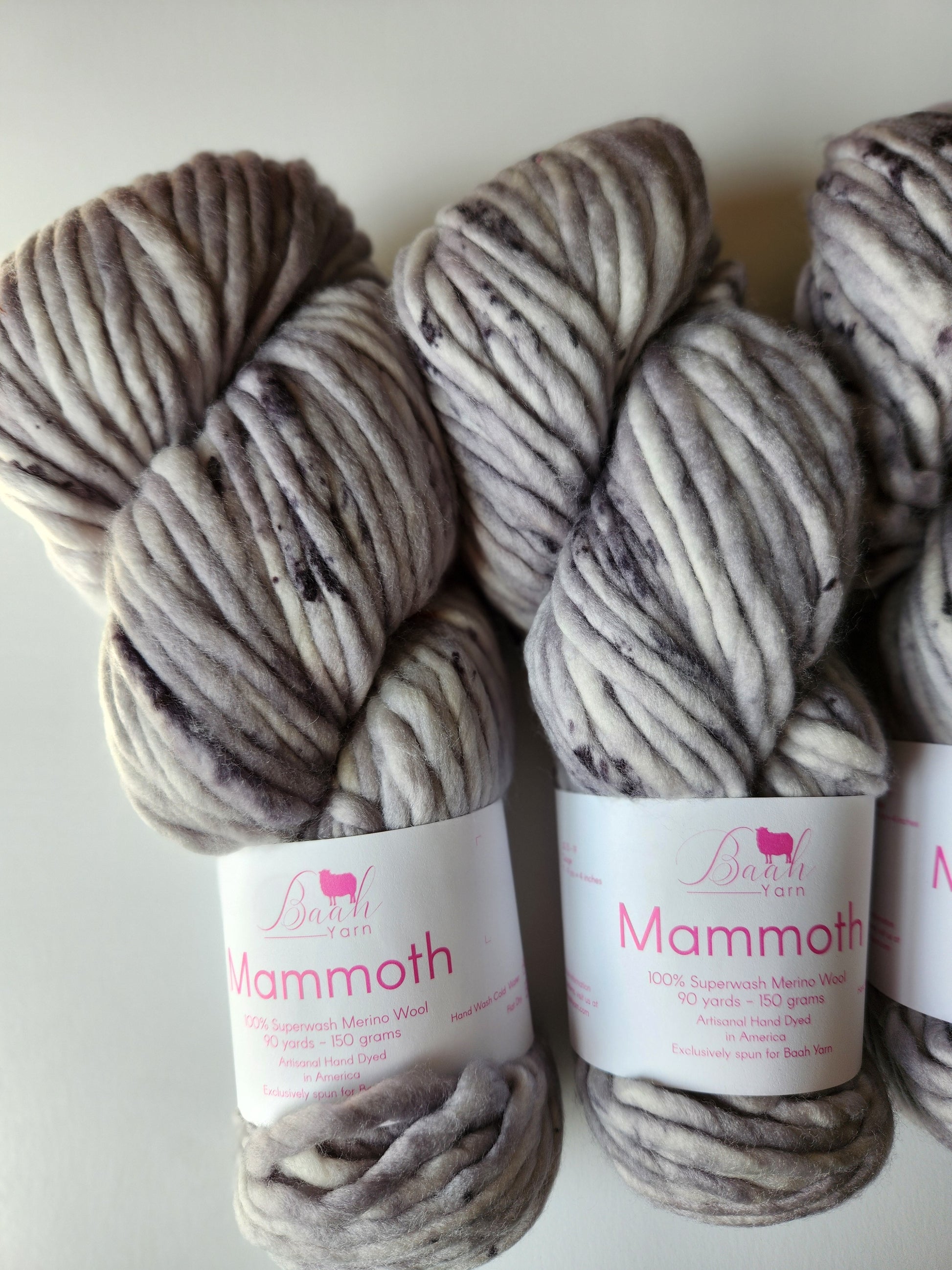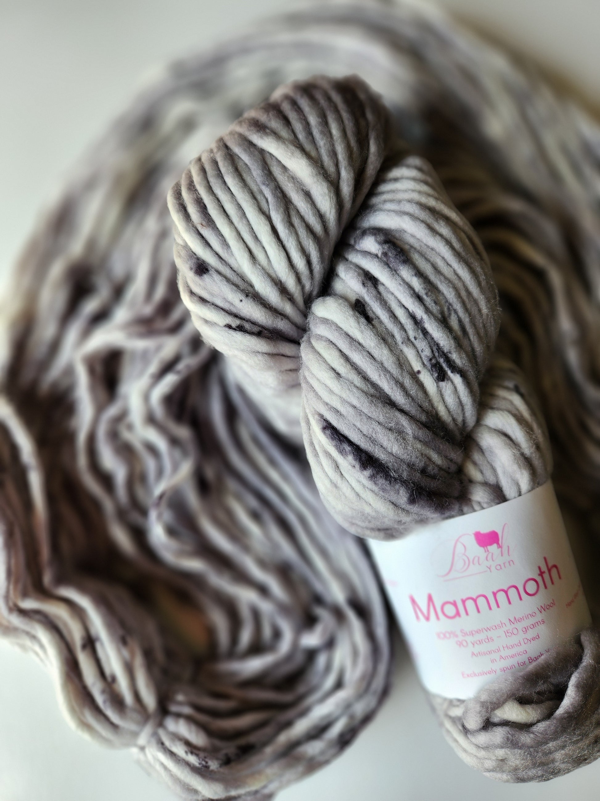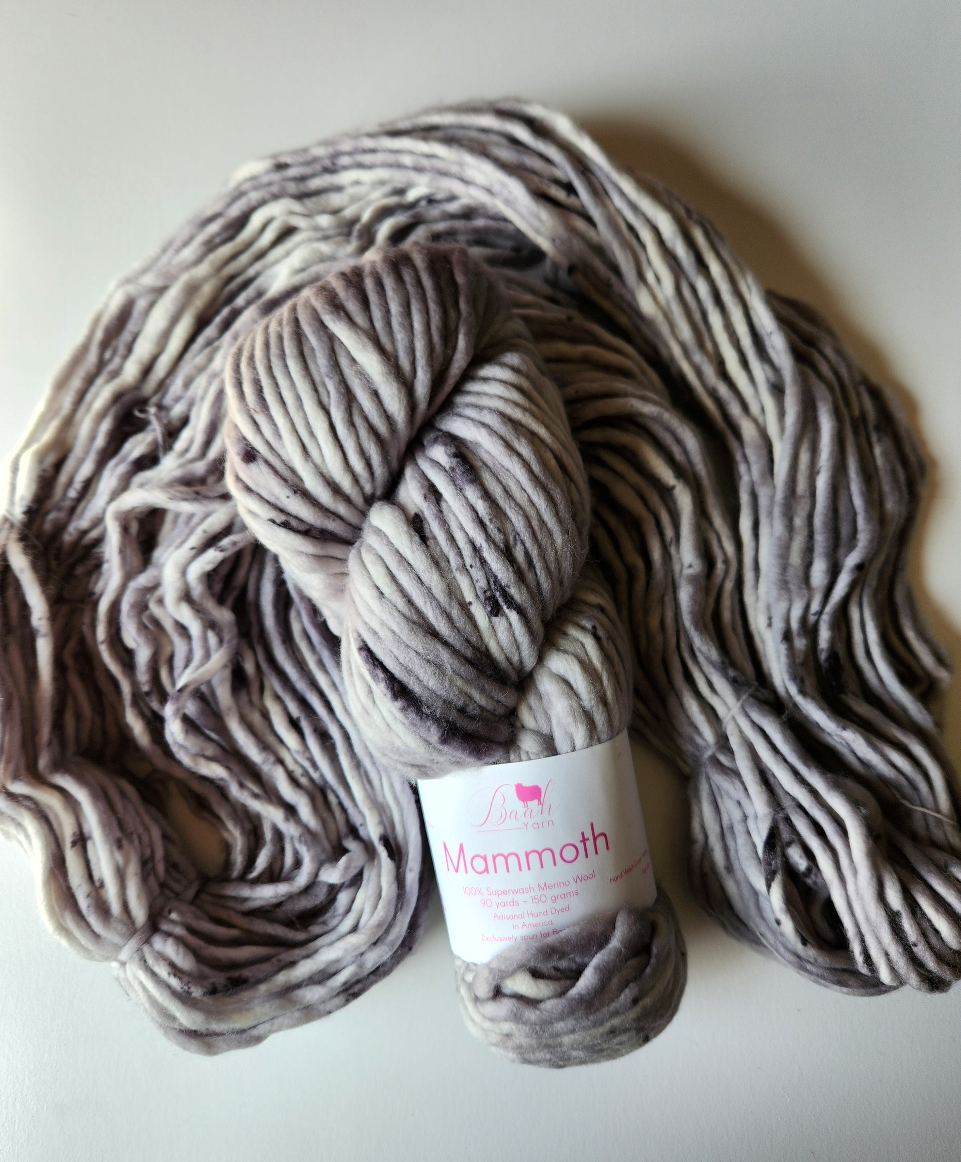 Baah Mammoth 100% superwash single ply merino wool. Each skein is 90 yards of hand-dyed squishy beauty, perfect for plump, quick knit or crochet projects.