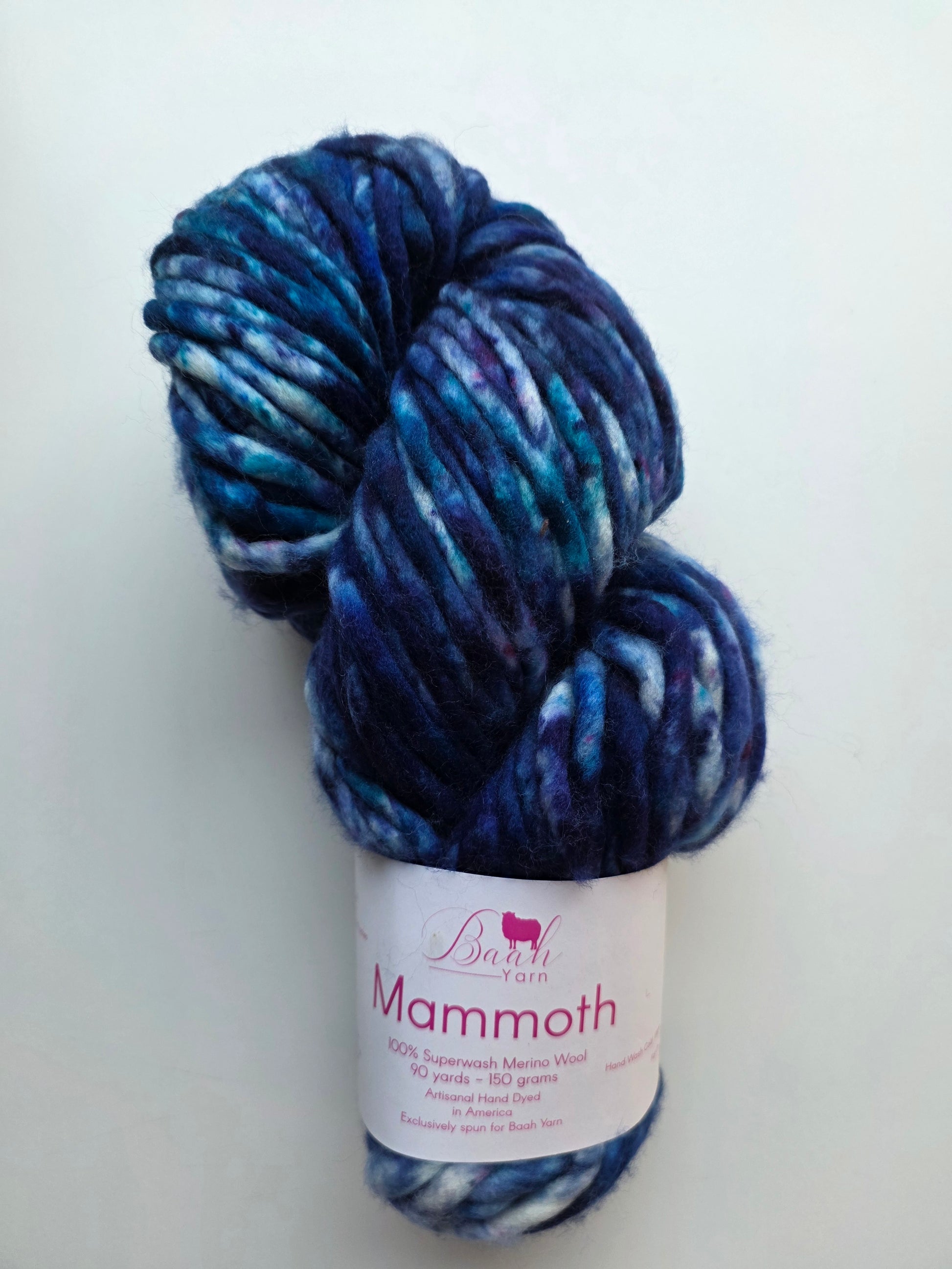 Baah Mammoth 100% superwash single ply merino wool. Each skein is 90 yards of hand-dyed squishy beauty, perfect for plump, quick knit or crochet projects.