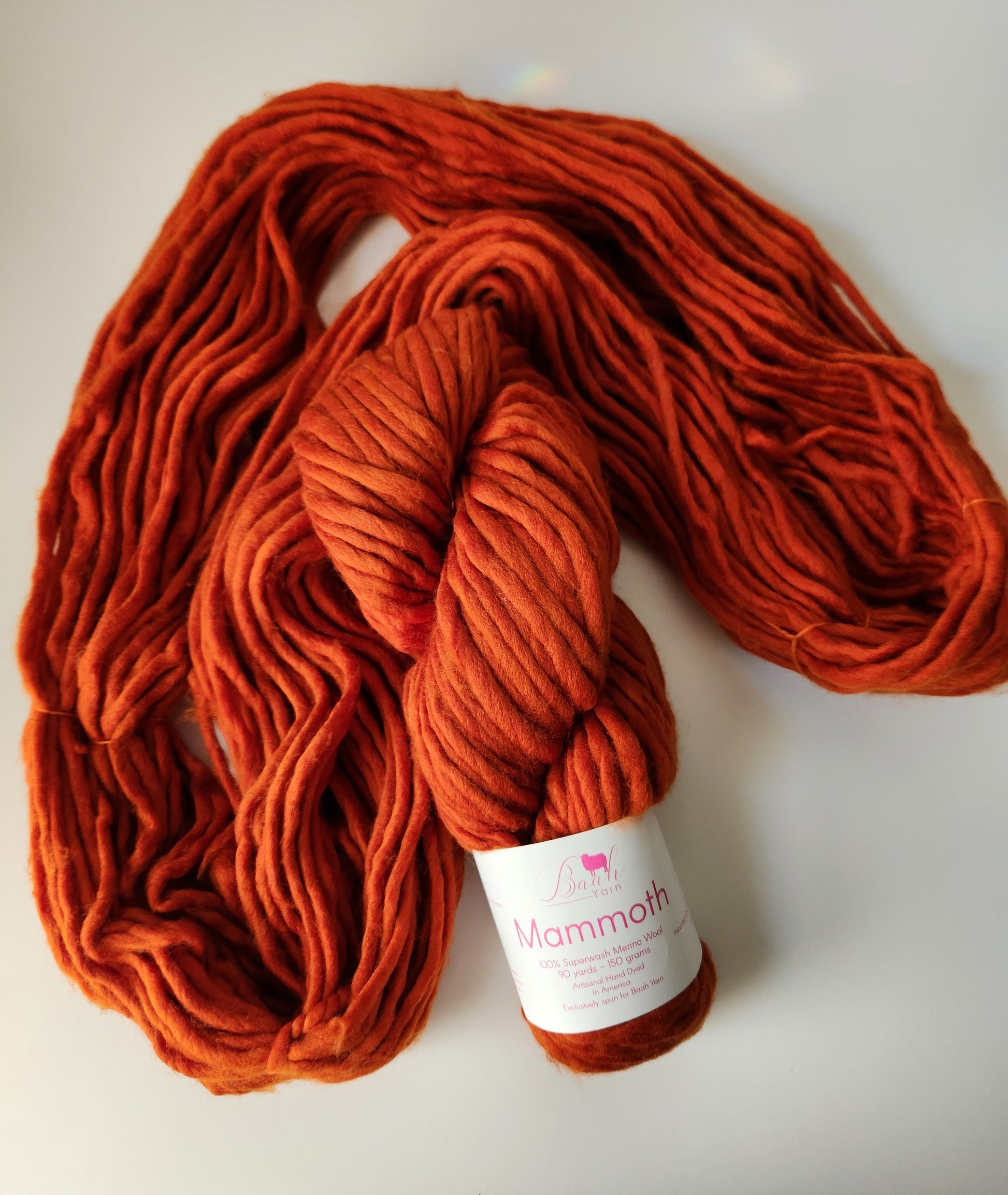 Baah Mammoth 100% superwash single ply merino wool. Each skein is 90 yards of hand-dyed squishy beauty, perfect for plump, quick knit or crochet projects.