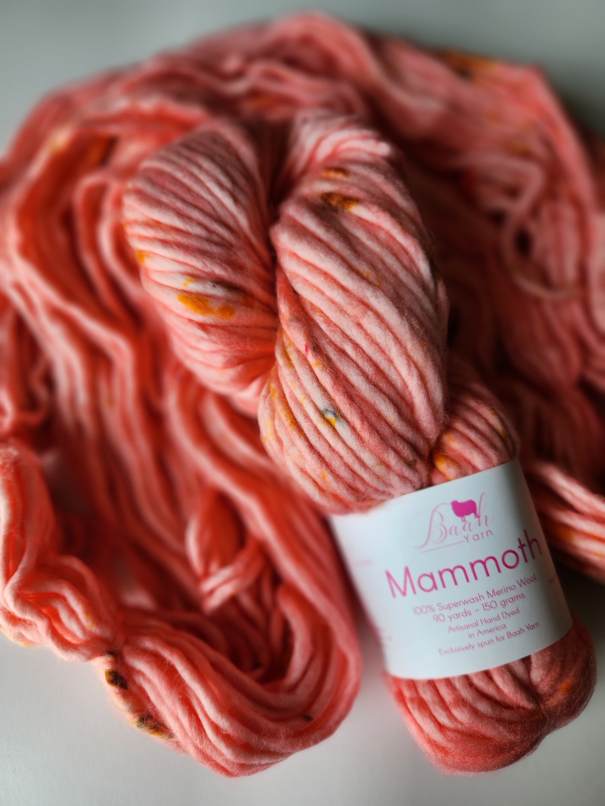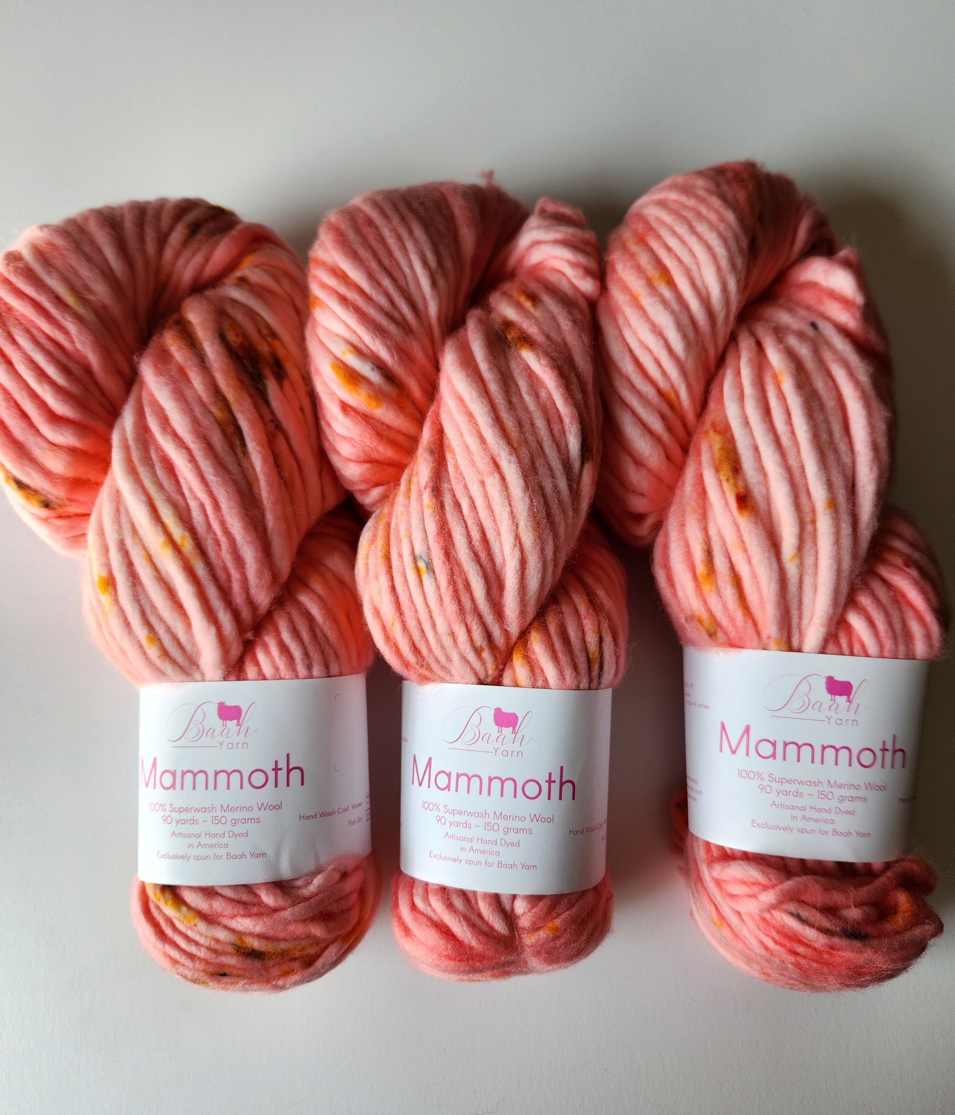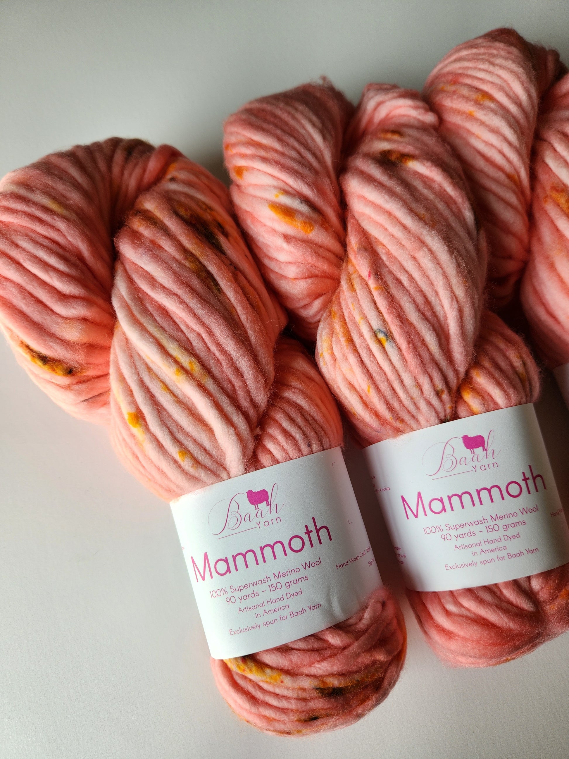 Baah Mammoth 100% superwash single ply merino wool. Each skein is 90 yards of hand-dyed squishy beauty, perfect for plump, quick knit or crochet projects.