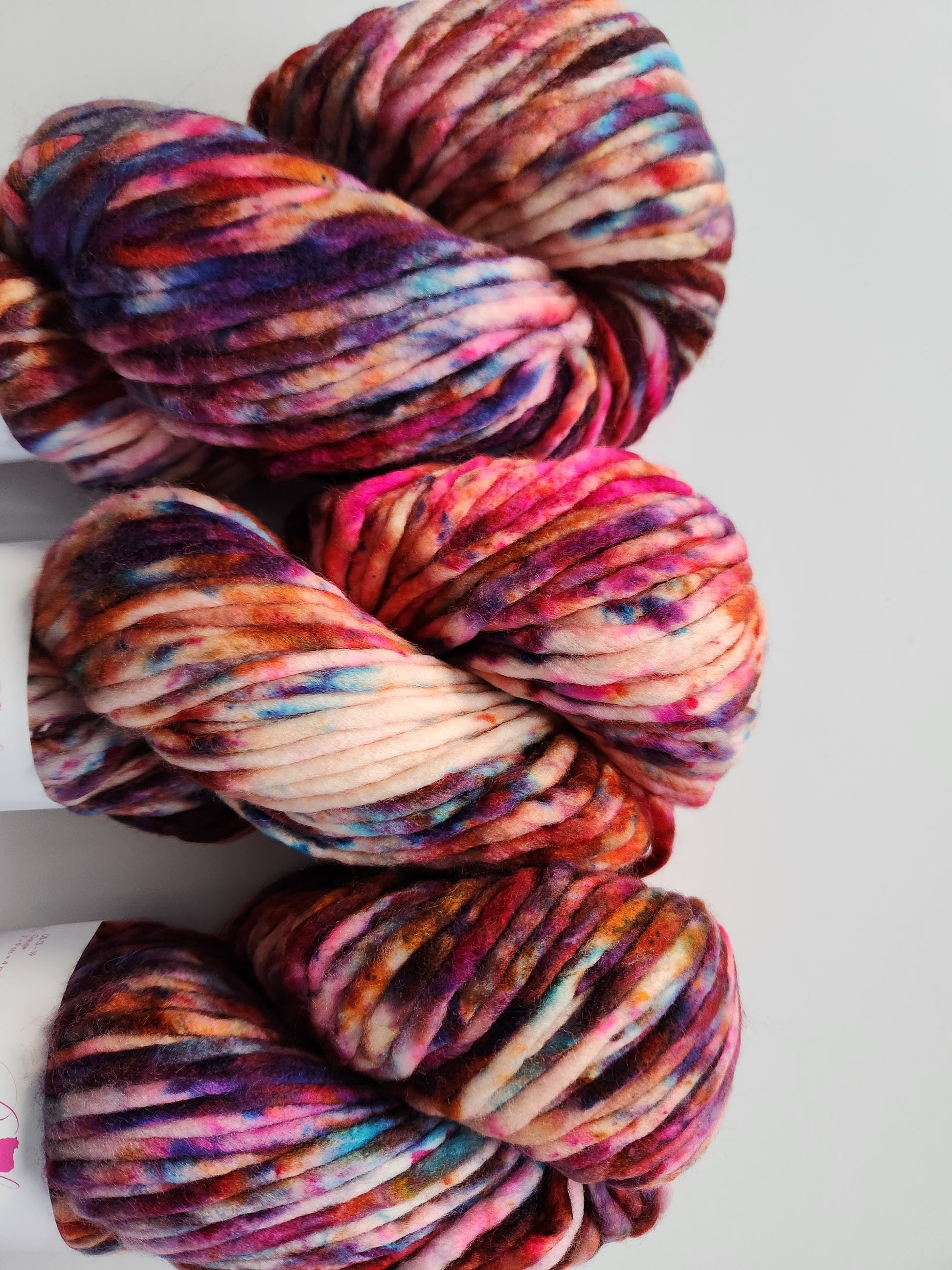 Baah Mammoth 100% superwash single ply merino wool. Each skein is 90 yards of hand-dyed squishy beauty, perfect for plump, quick knit or crochet projects.