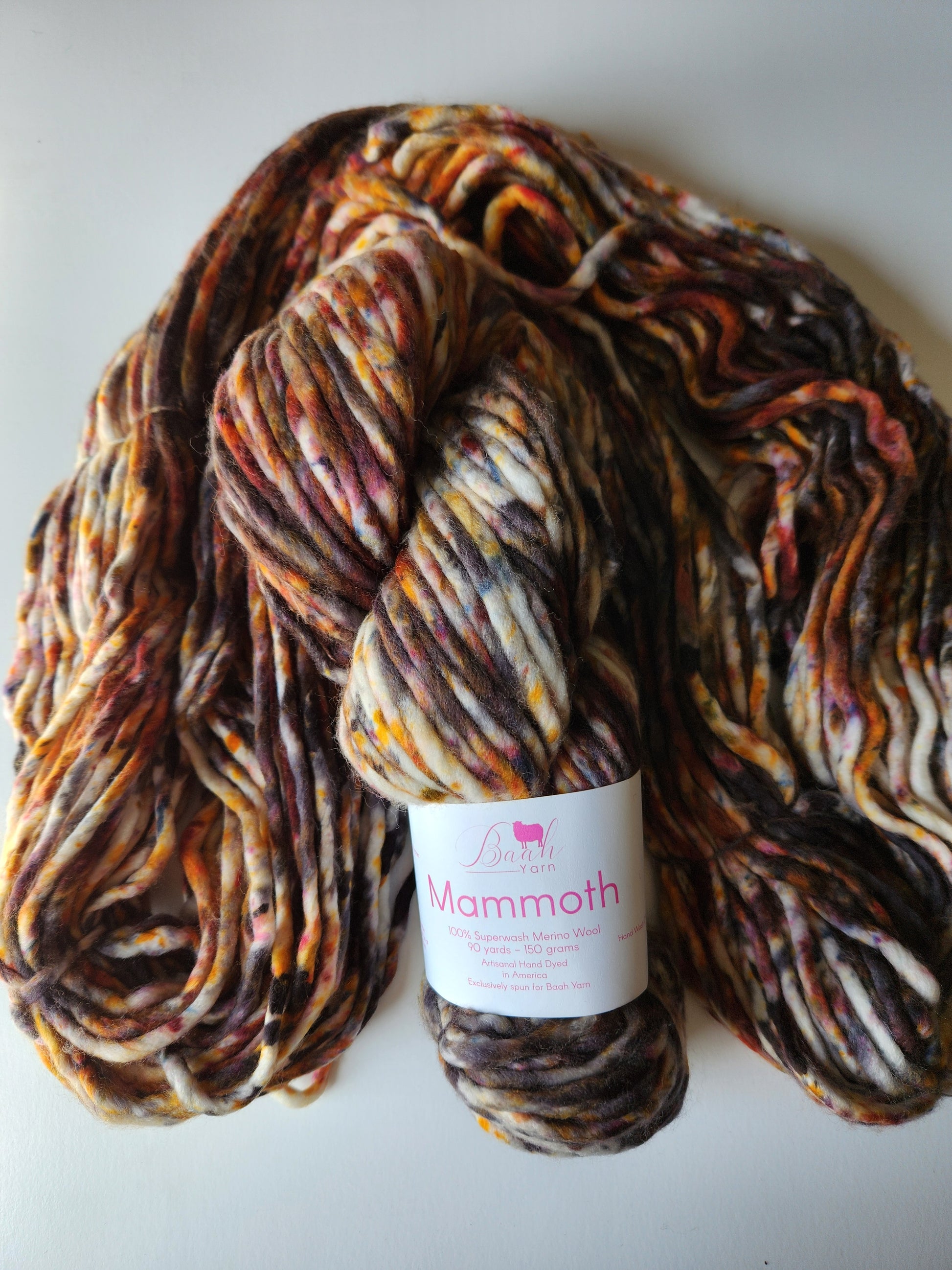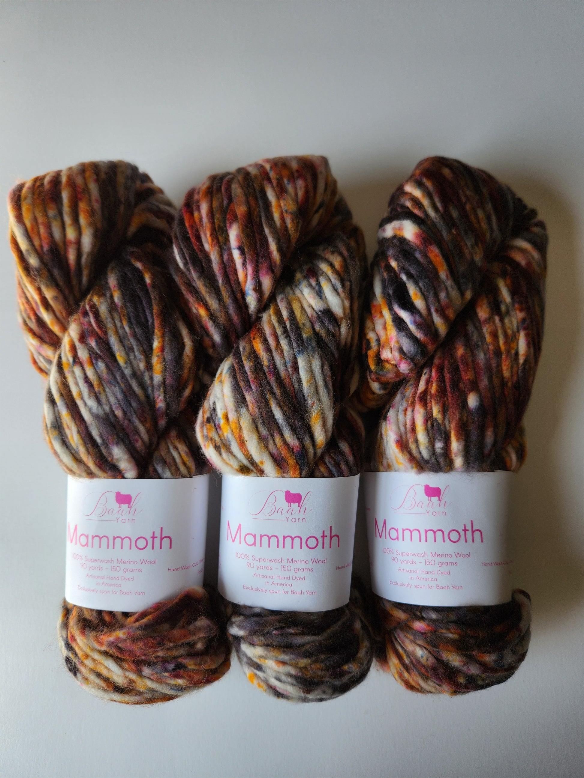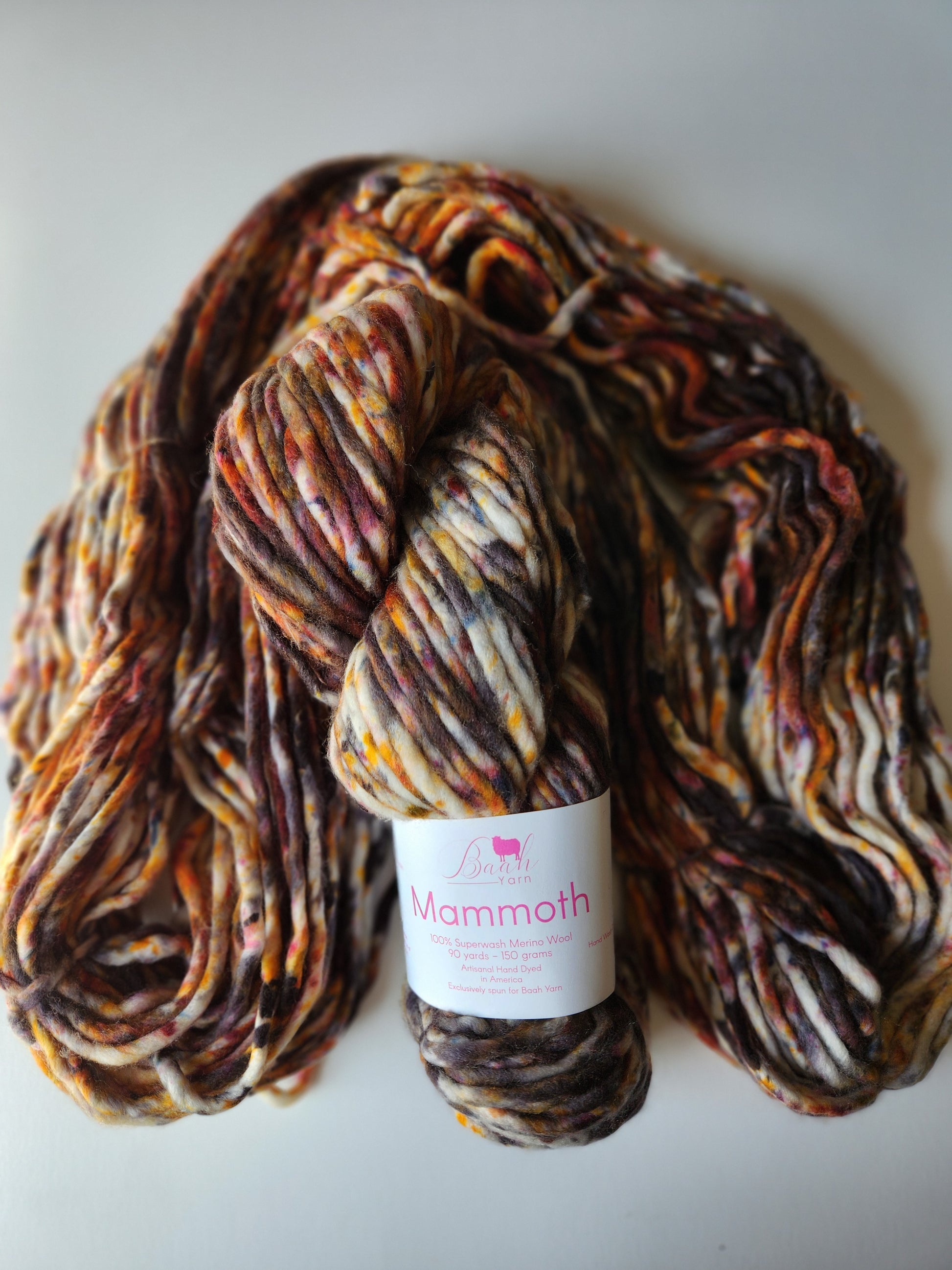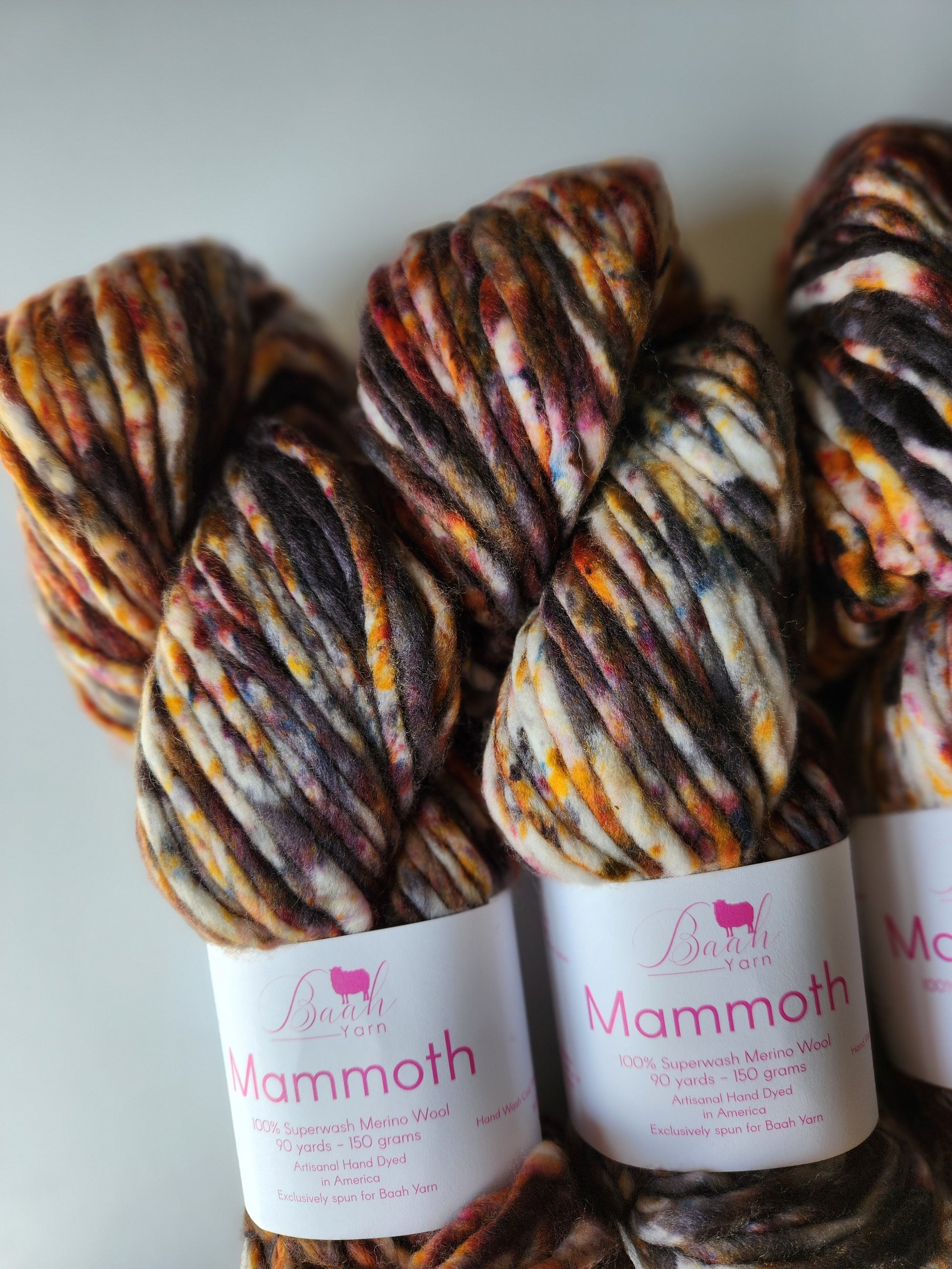 Baah Mammoth 100% superwash single ply merino wool. Each skein is 90 yards of hand-dyed squishy beauty, perfect for plump, quick knit or crochet projects.