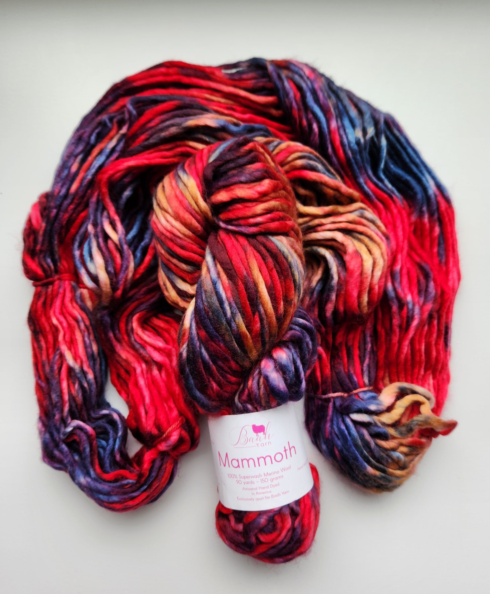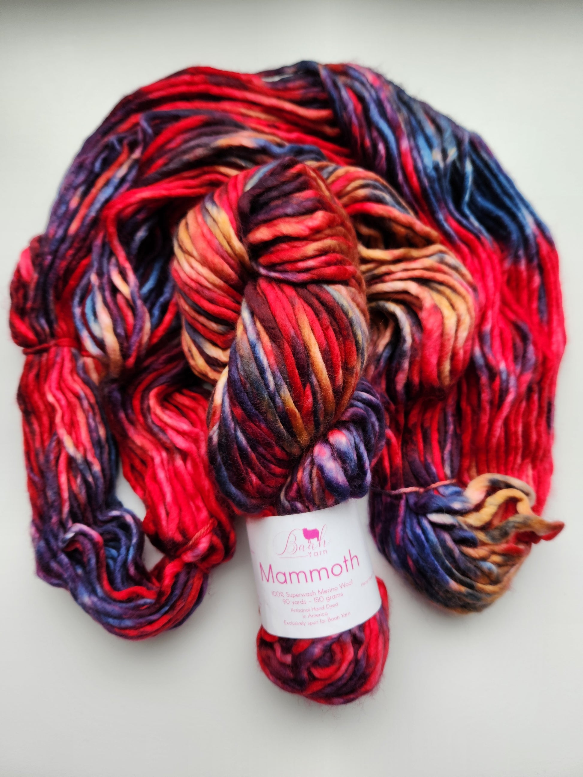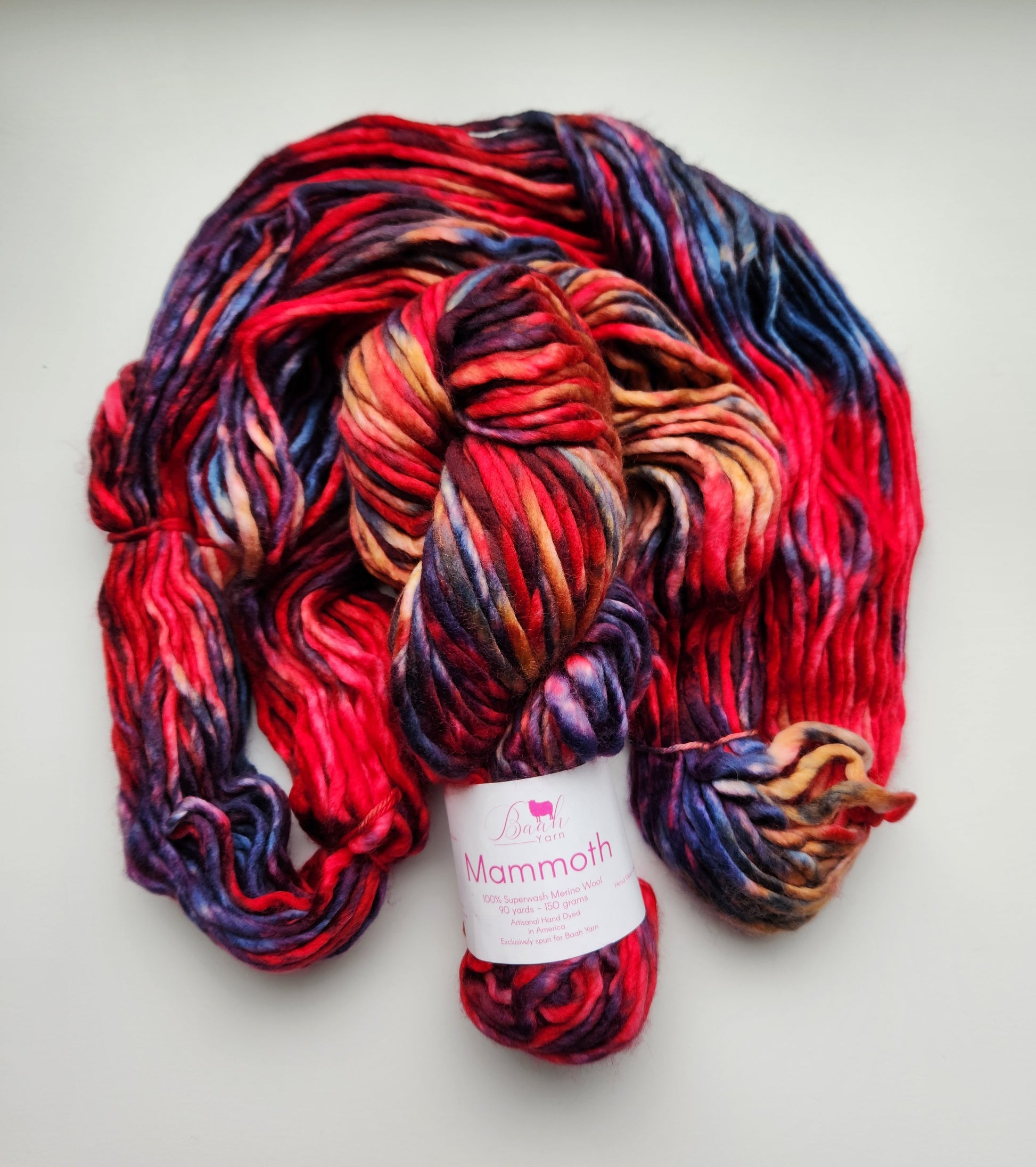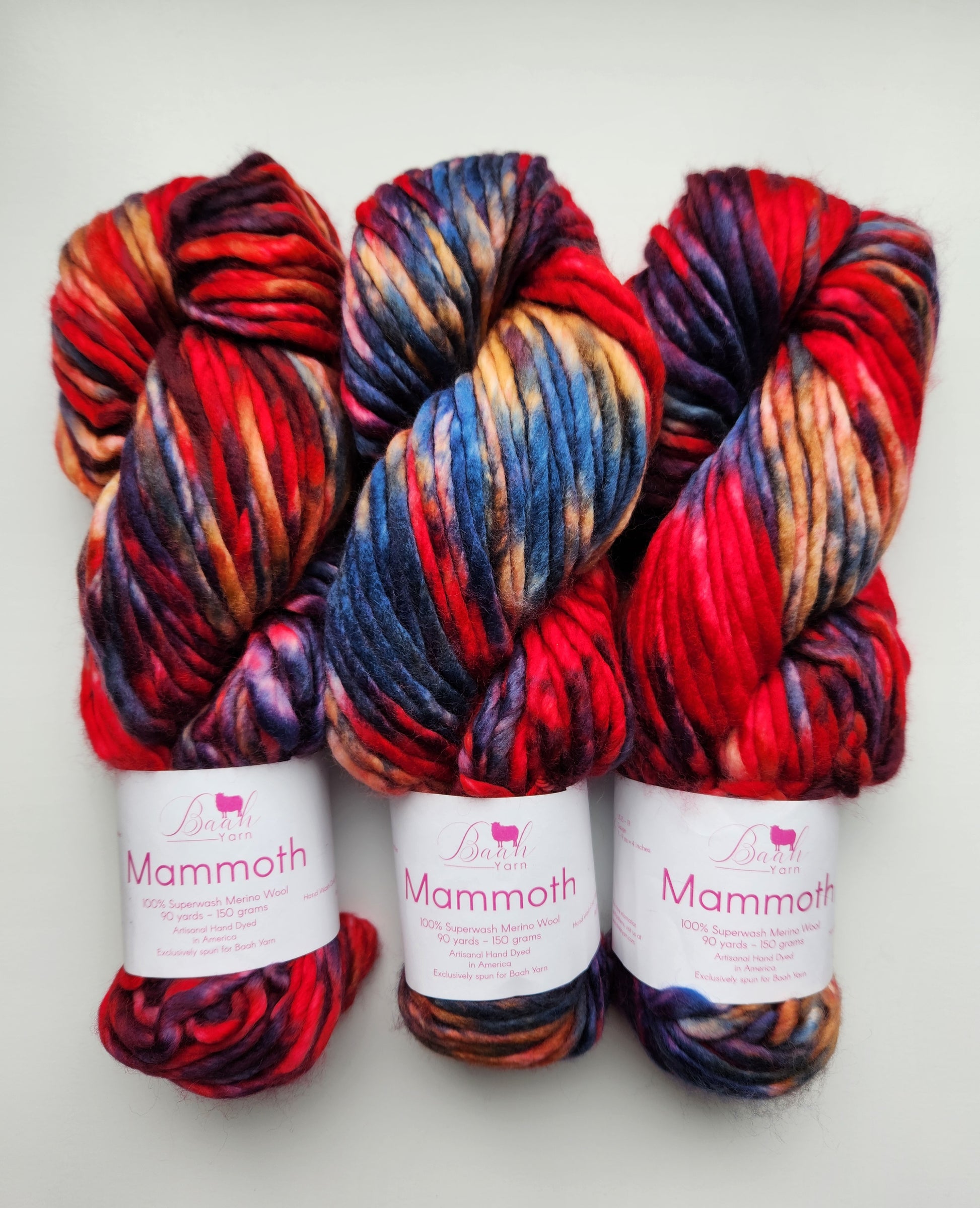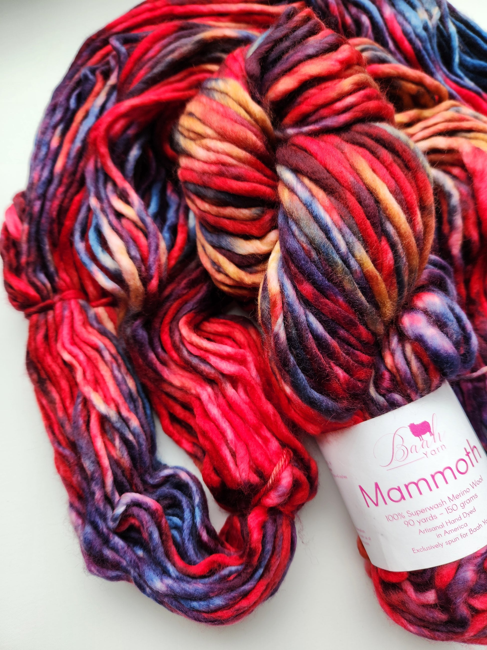 Baah Mammoth 100% superwash single ply merino wool. Each skein is 90 yards of hand-dyed squishy beauty, perfect for plump, quick knit or crochet projects.