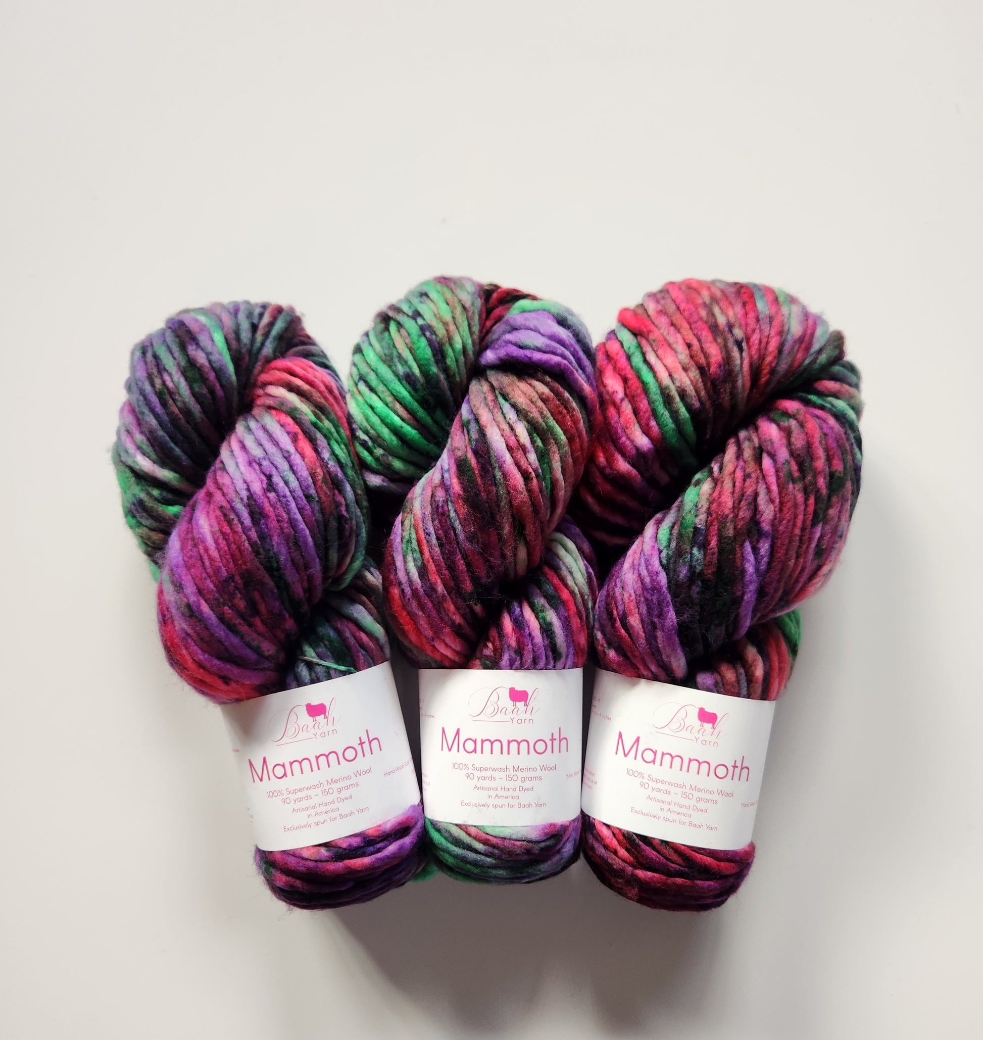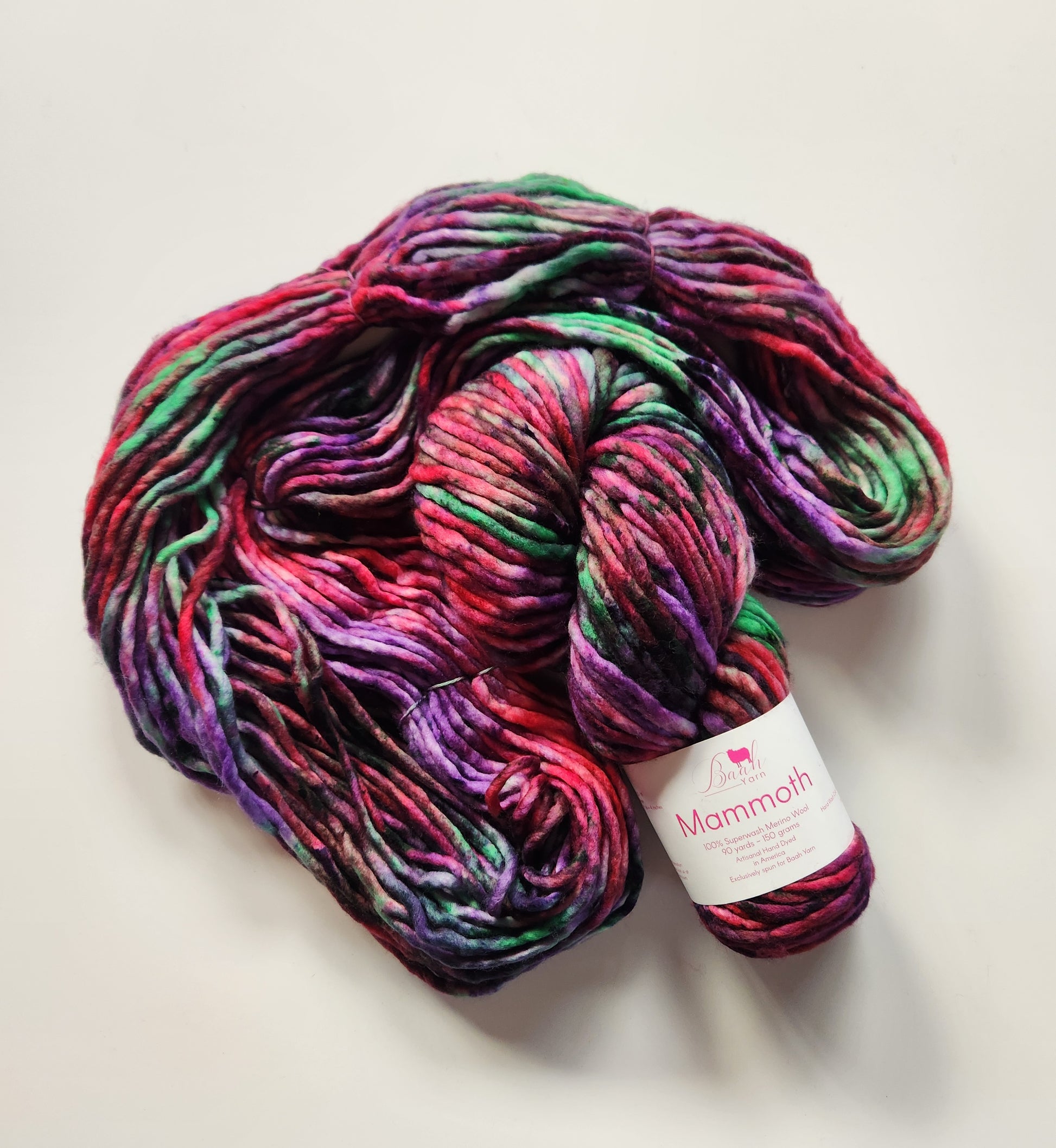 Baah Mammoth 100% superwash single ply merino wool. Each skein is 90 yards of hand-dyed squishy beauty, perfect for plump, quick knit or crochet projects.