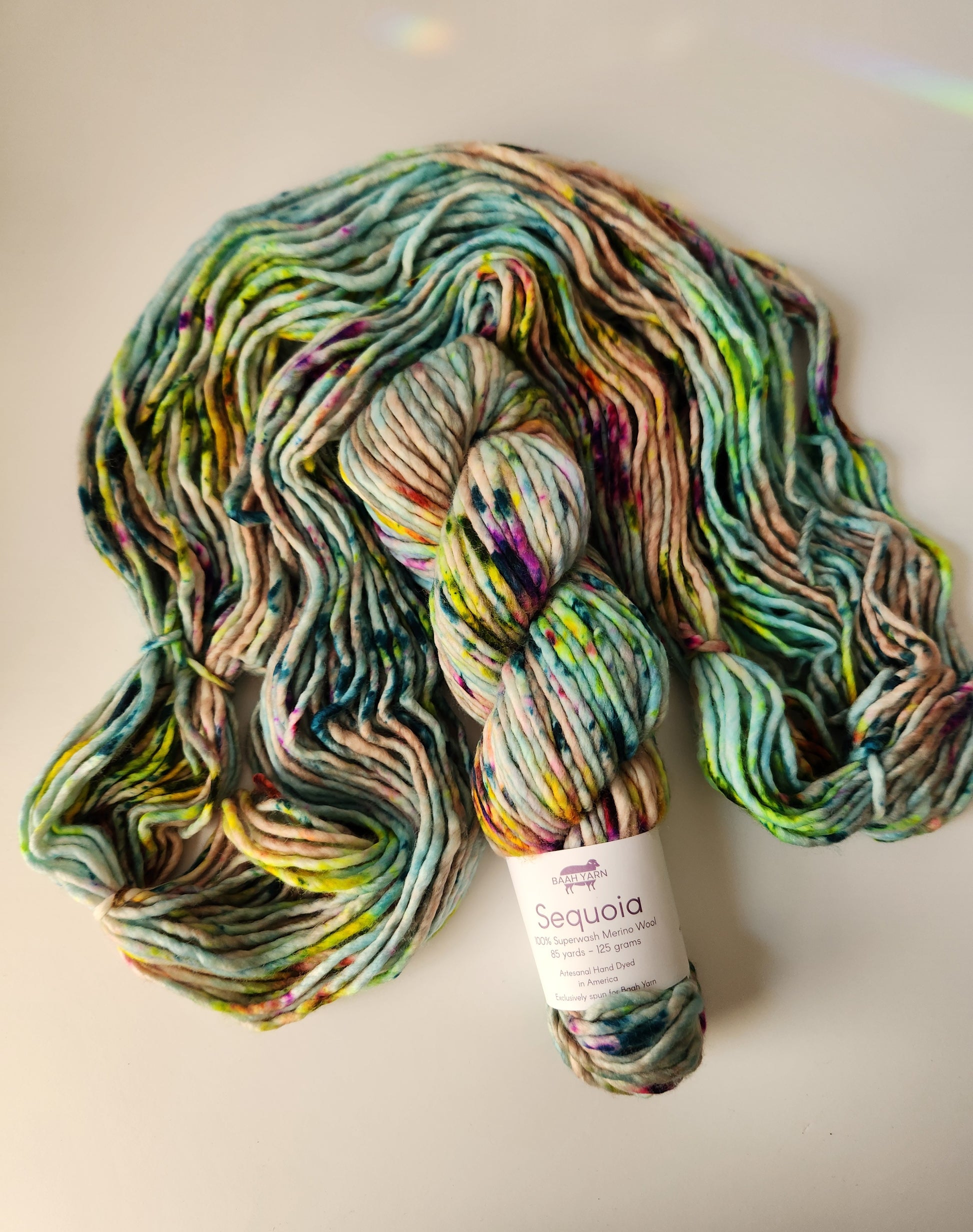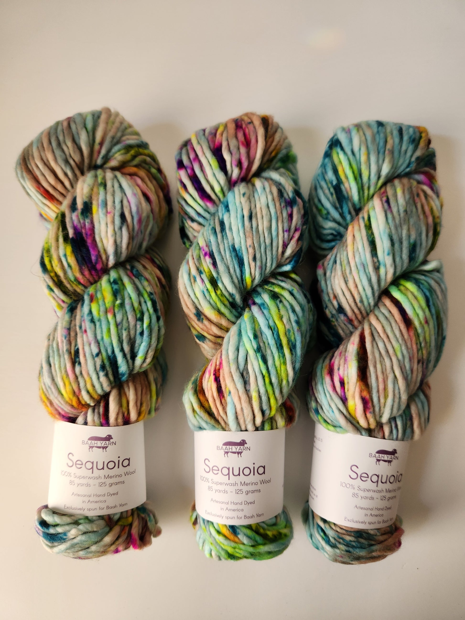 Baah Sequoia 100% superwash single ply merino wool. Each skein is 85 yards of hand-dyed squishy beauty, perfect for plump, quick knit or crochet projects.