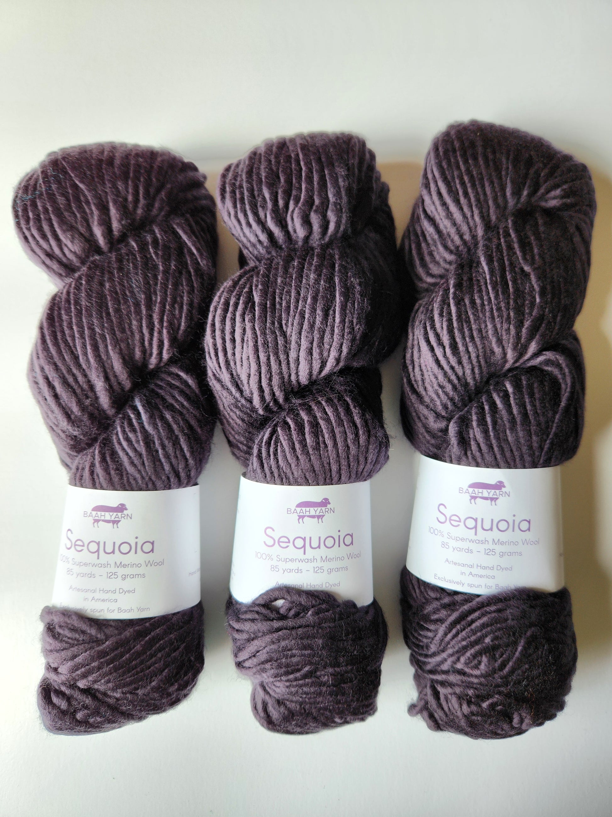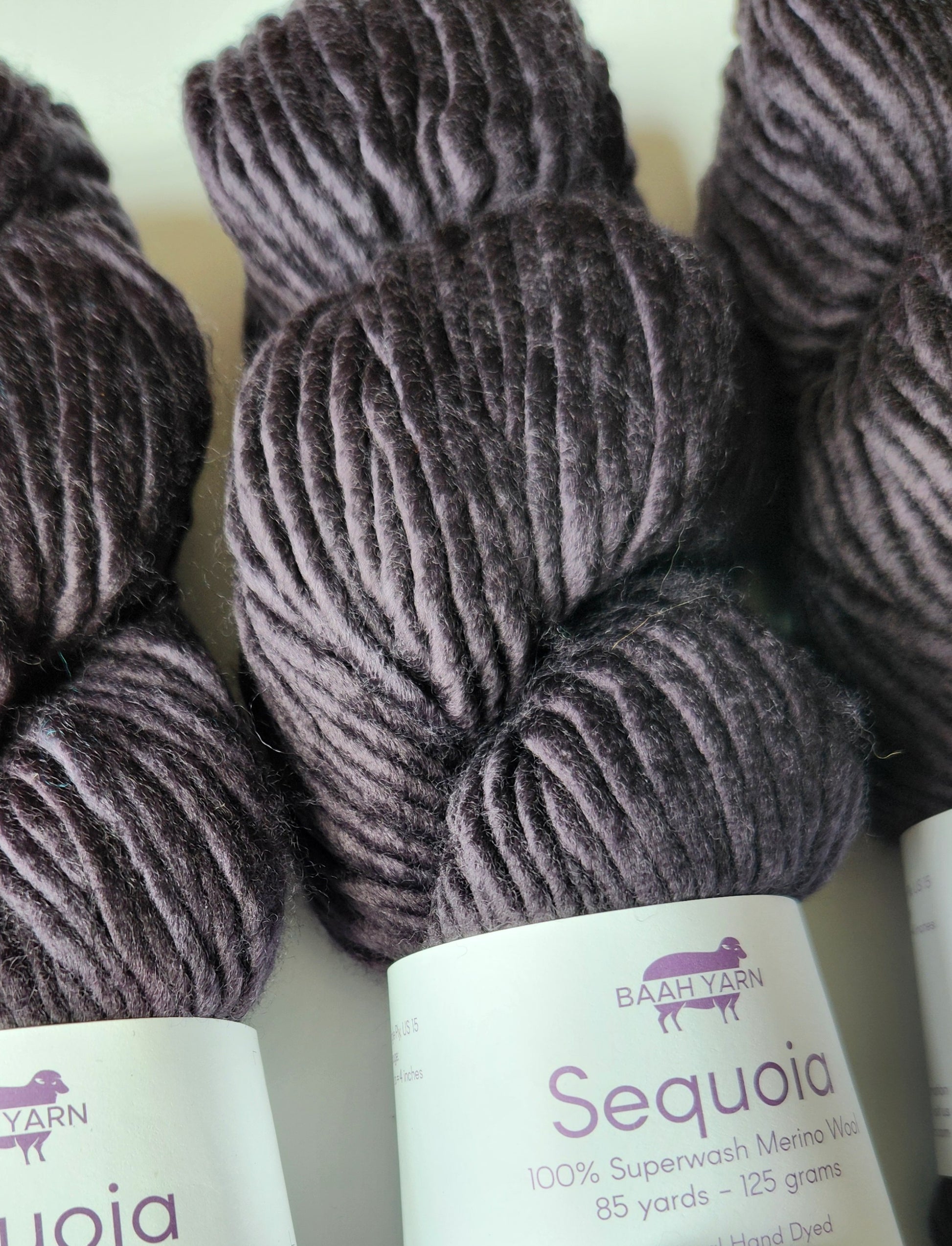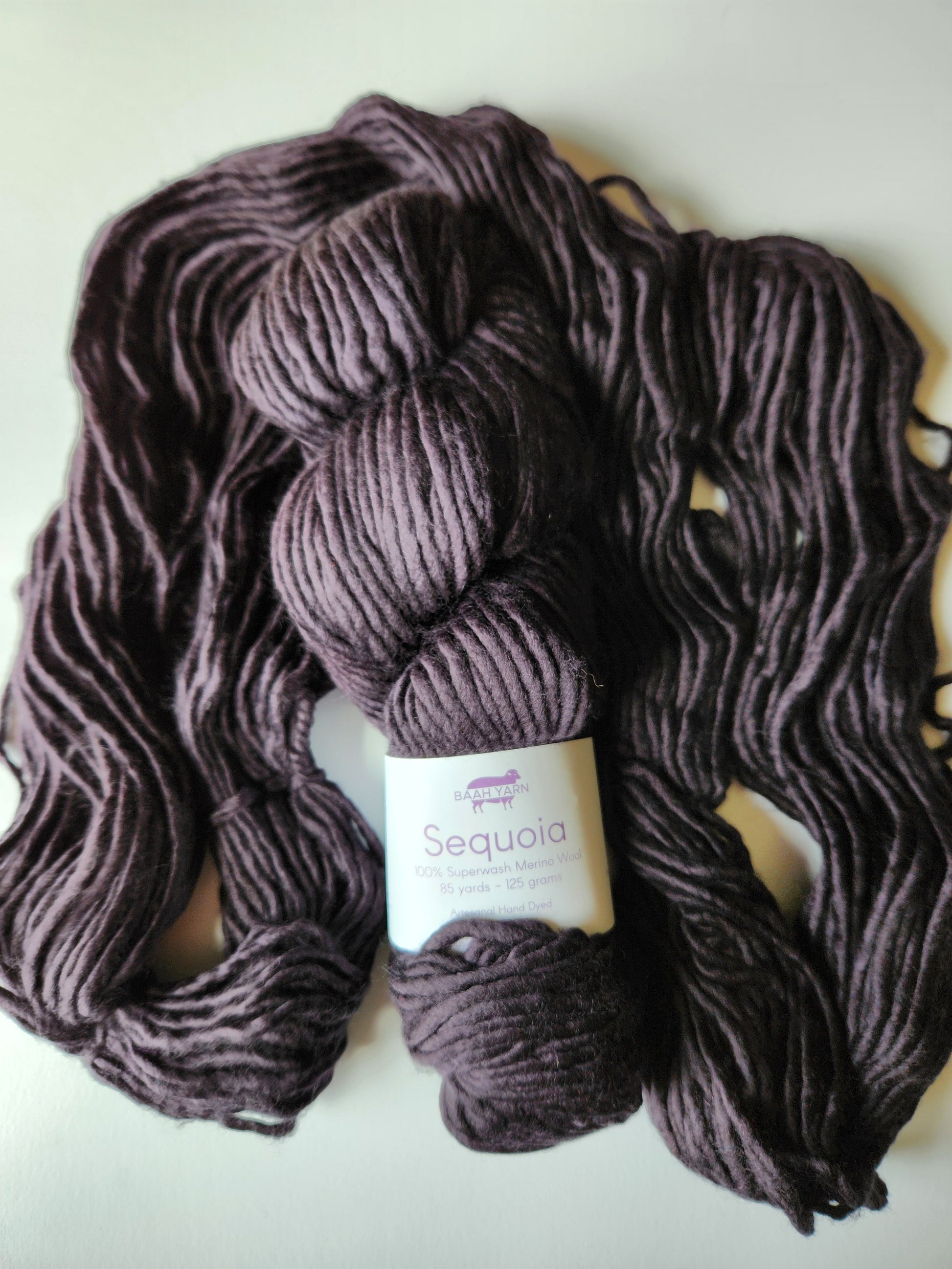 Baah Sequoia 100% superwash single ply merino wool. Each skein is 85 yards of hand-dyed squishy beauty, perfect for plump, quick knit or crochet projects.