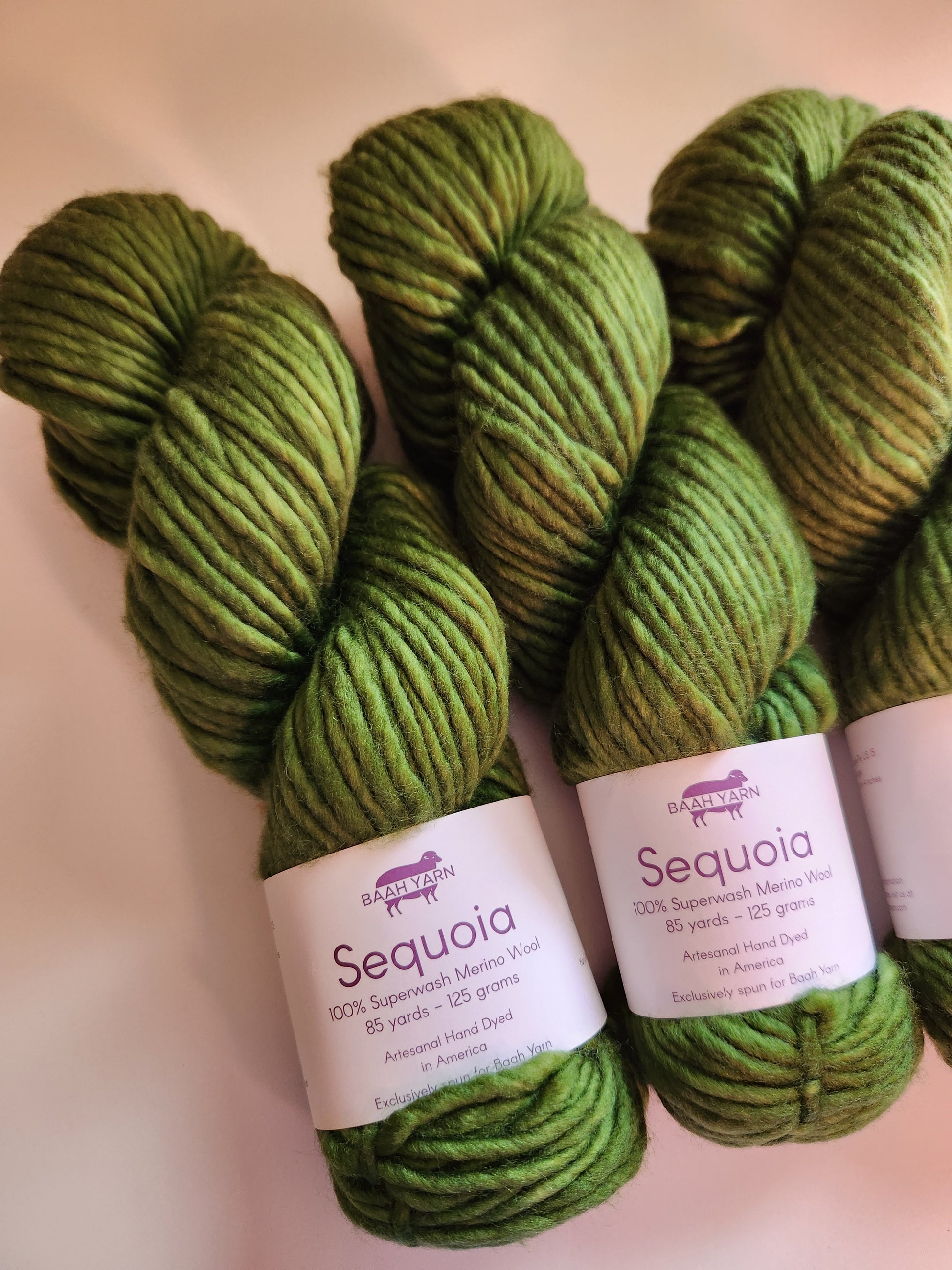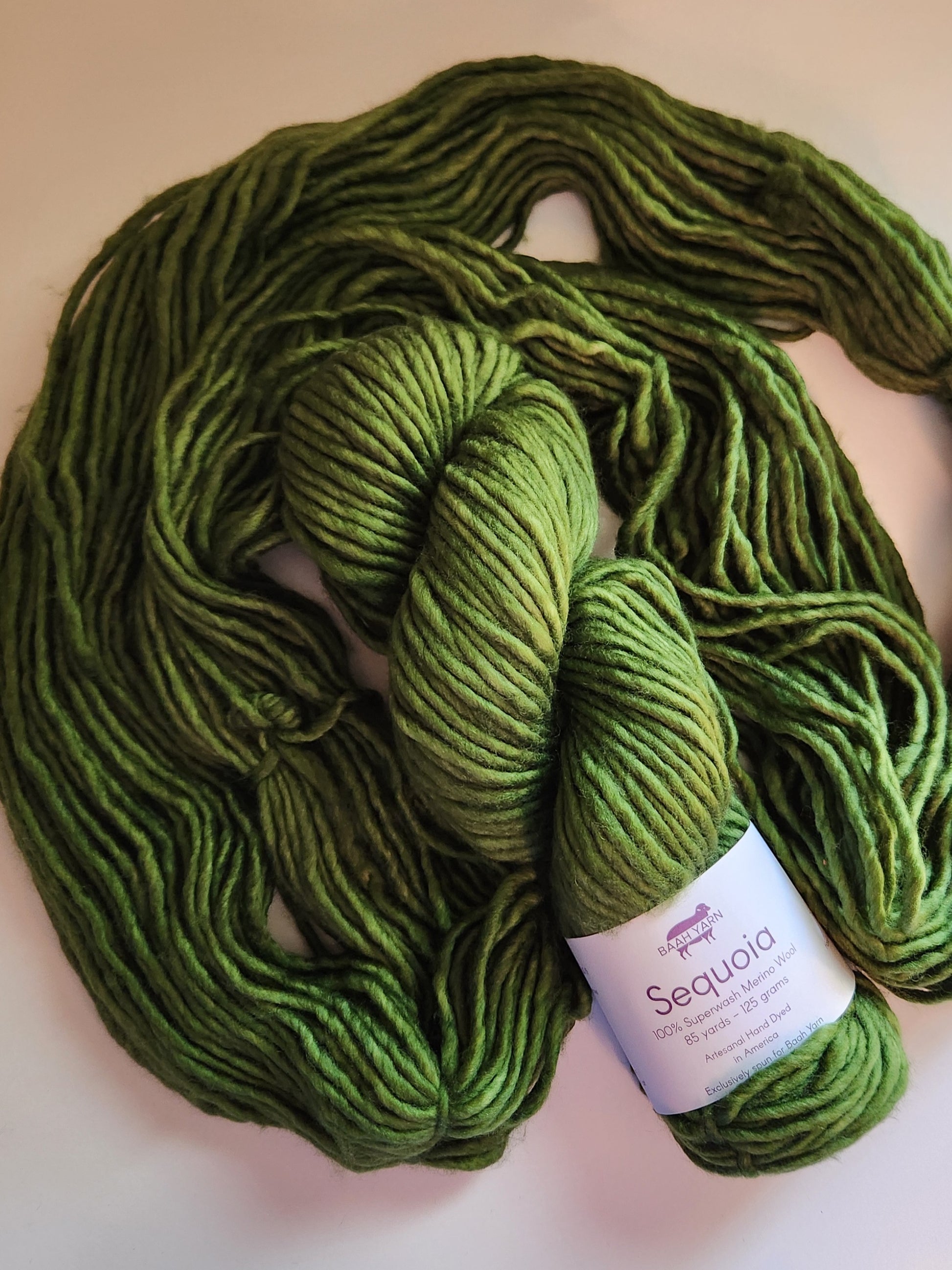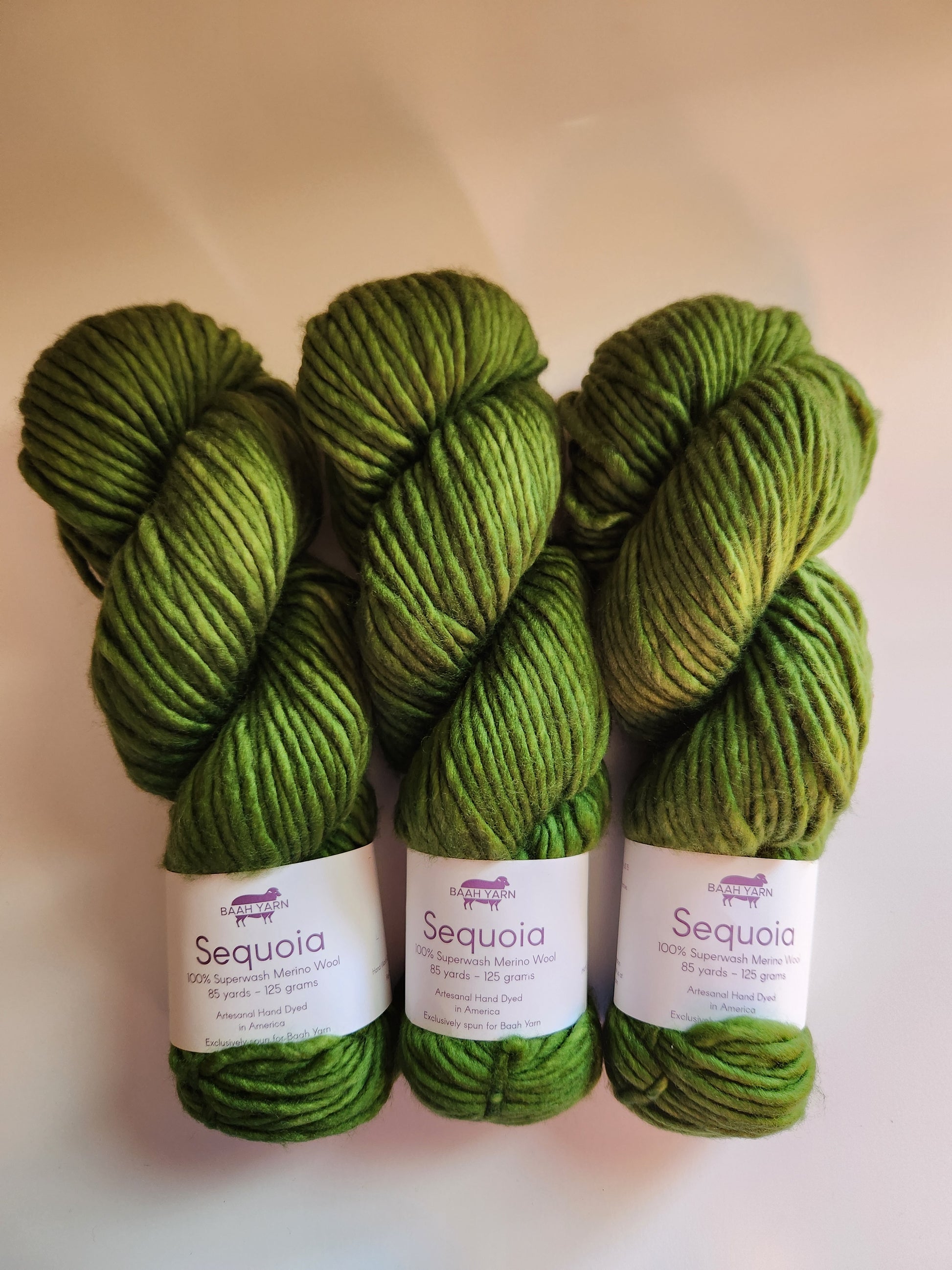 Baah Sequoia 100% superwash single ply merino wool. Each skein is 85 yards of hand-dyed squishy beauty, perfect for plump, quick knit or crochet projects.