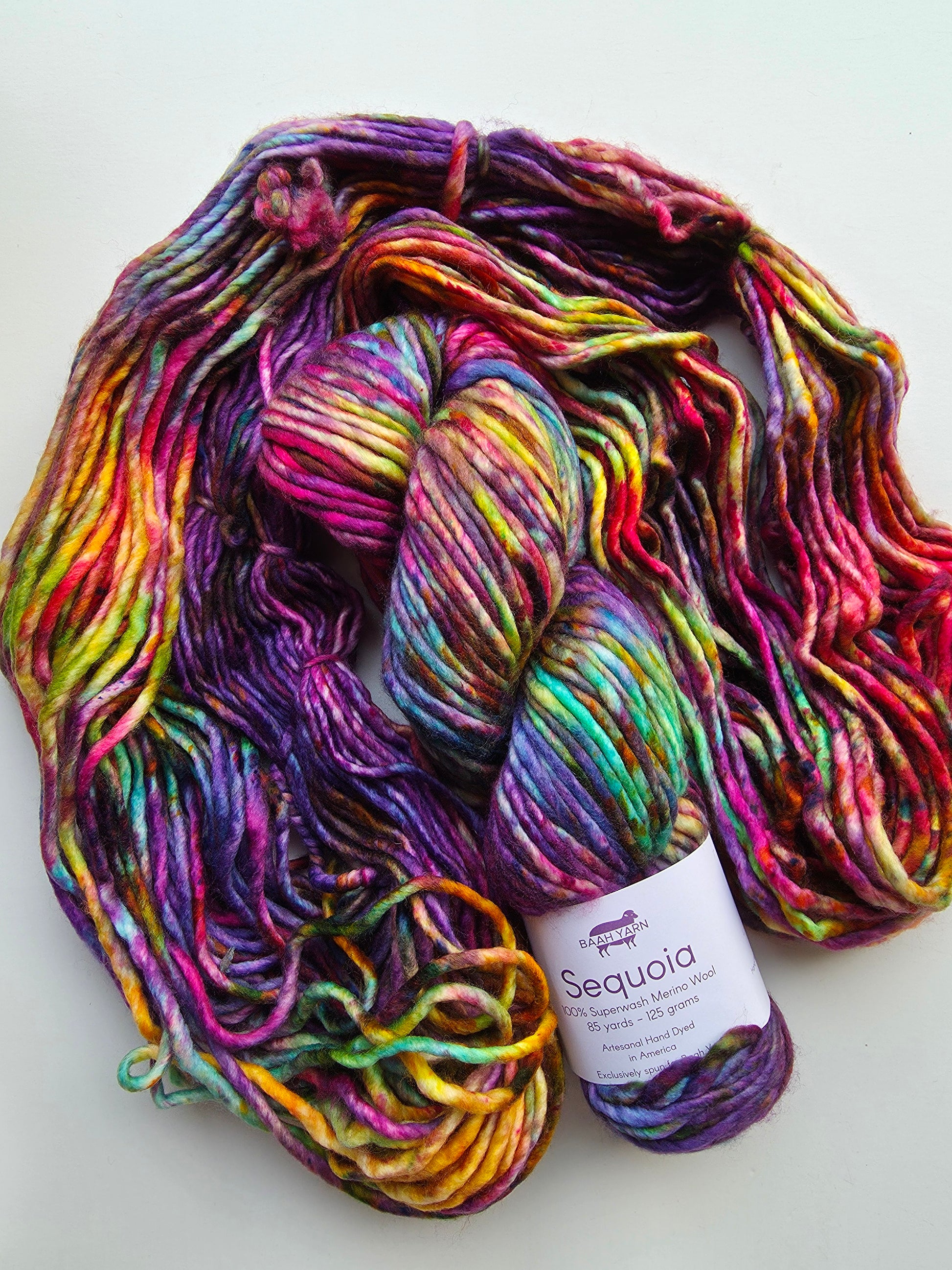 Baah Sequoia 100% superwash single ply merino wool. Each skein is 85 yards of hand-dyed squishy beauty, perfect for plump, quick knit or crochet projects.