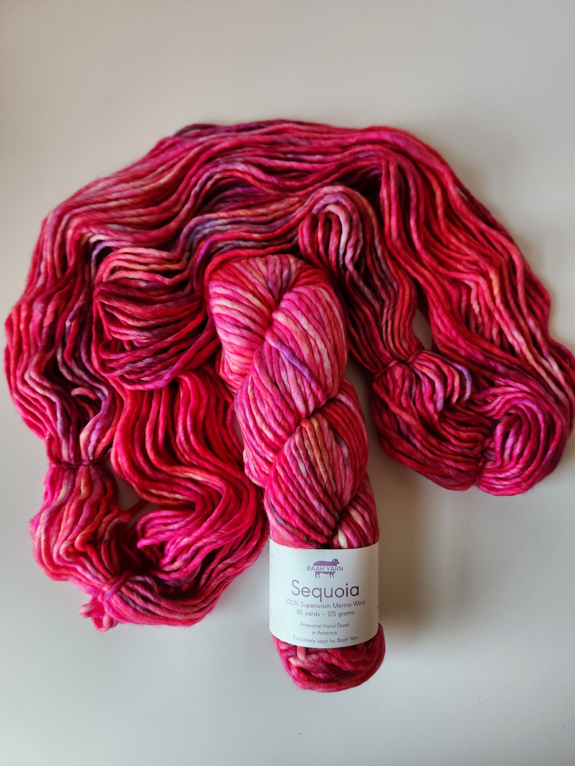 Baah Sequoia 100% superwash single ply merino wool. Each skein is 85 yards of hand-dyed squishy beauty, perfect for plump, quick knit or crochet projects.