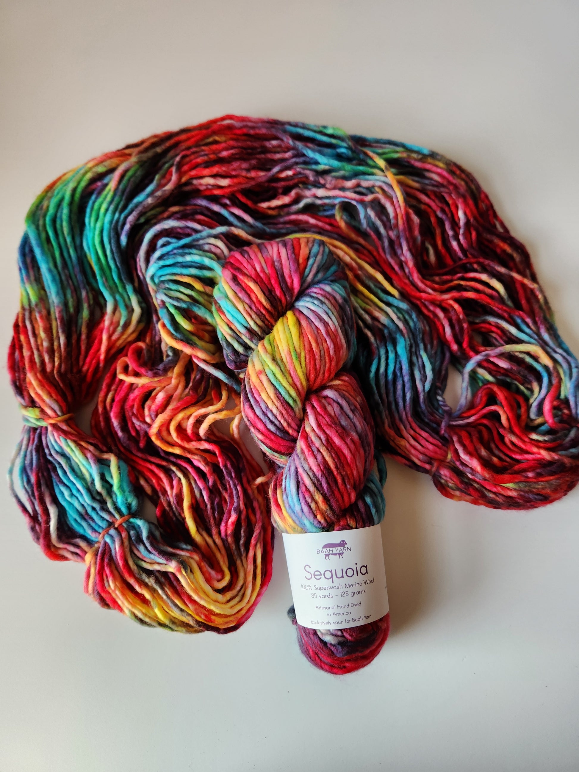 Baah Sequoia 100% superwash single ply merino wool. Each skein is 85 yards of hand-dyed squishy beauty, perfect for plump, quick knit or crochet projects.