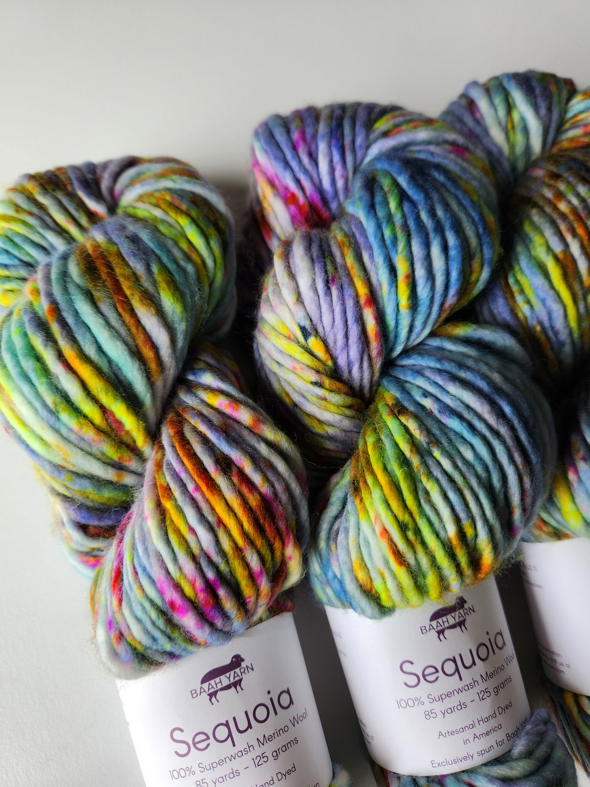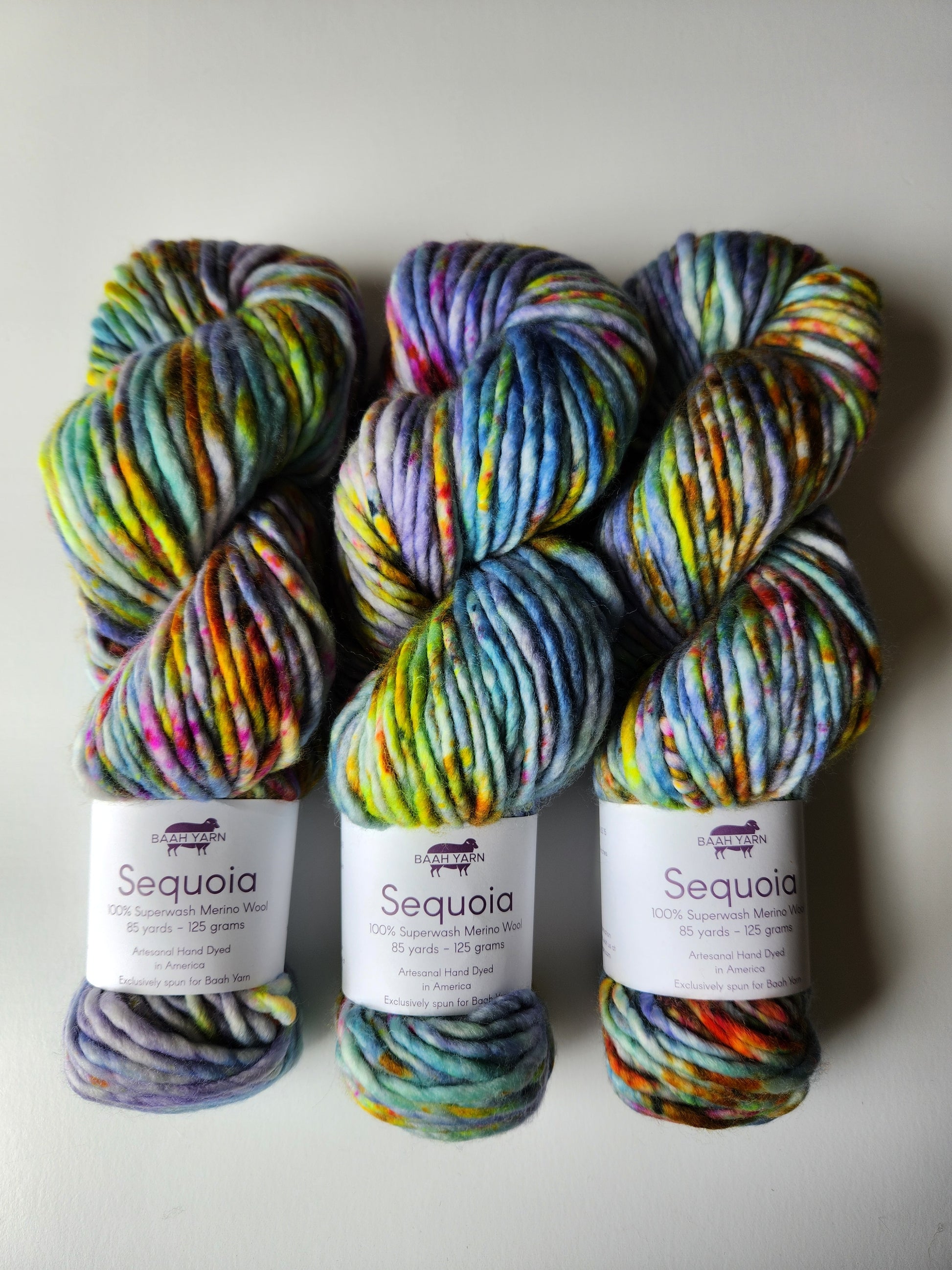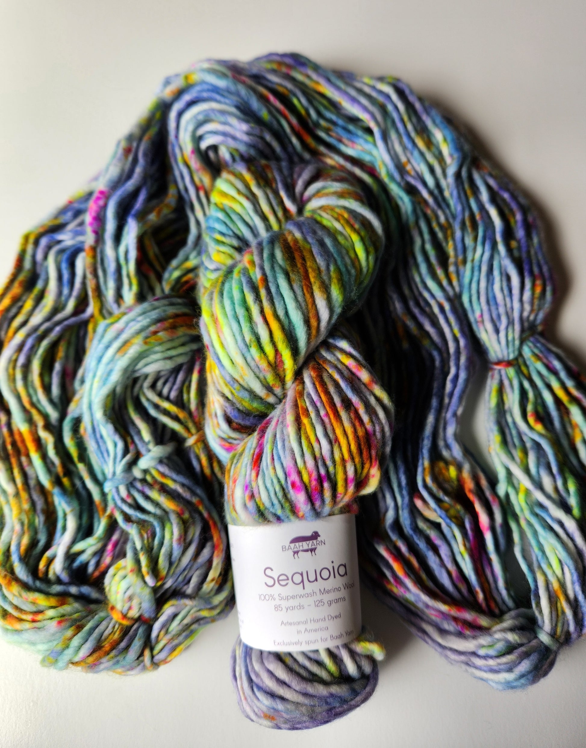 Baah Sequoia 100% superwash single ply merino wool. Each skein is 85 yards of hand-dyed squishy beauty, perfect for plump, quick knit or crochet projects.