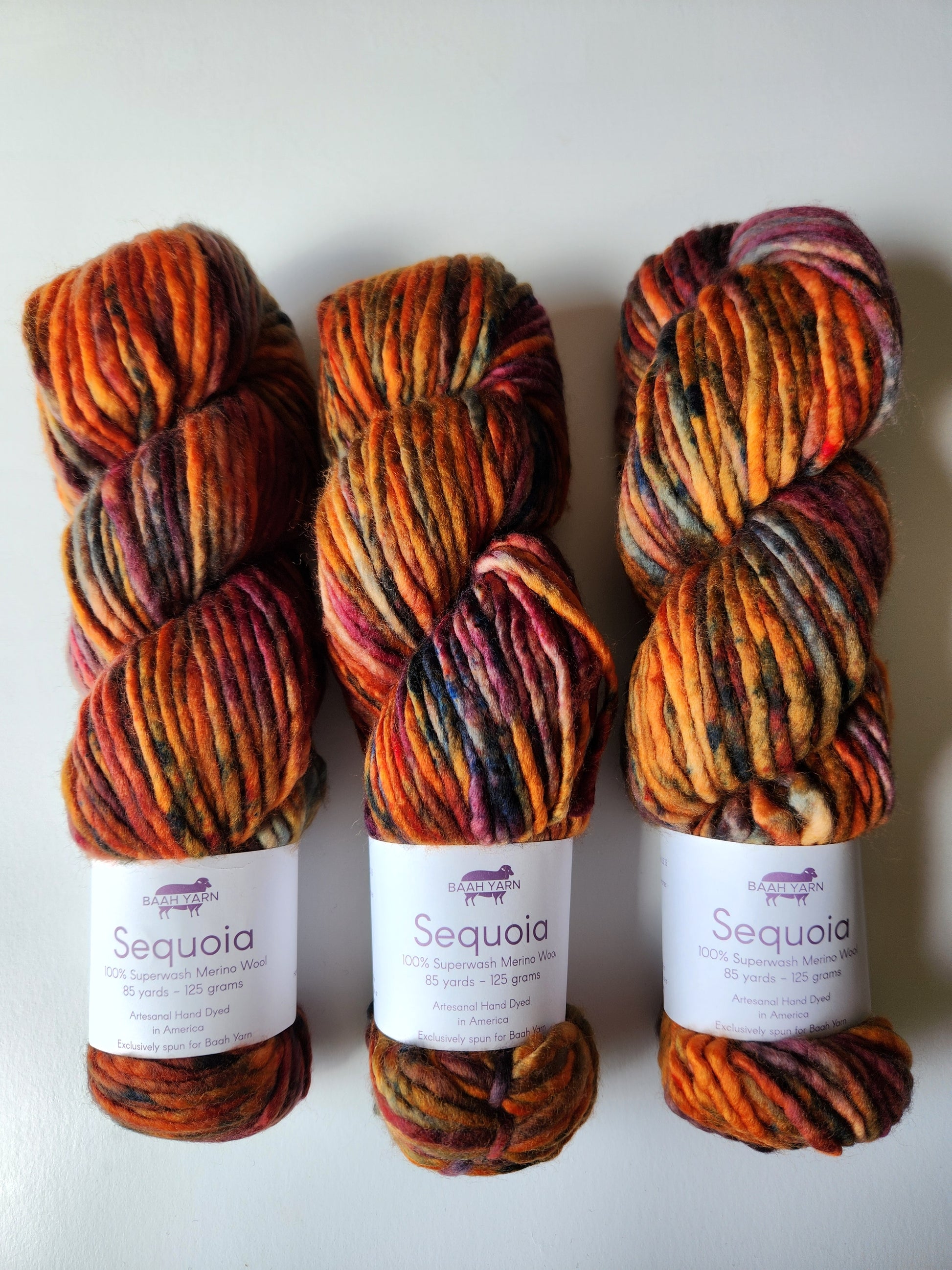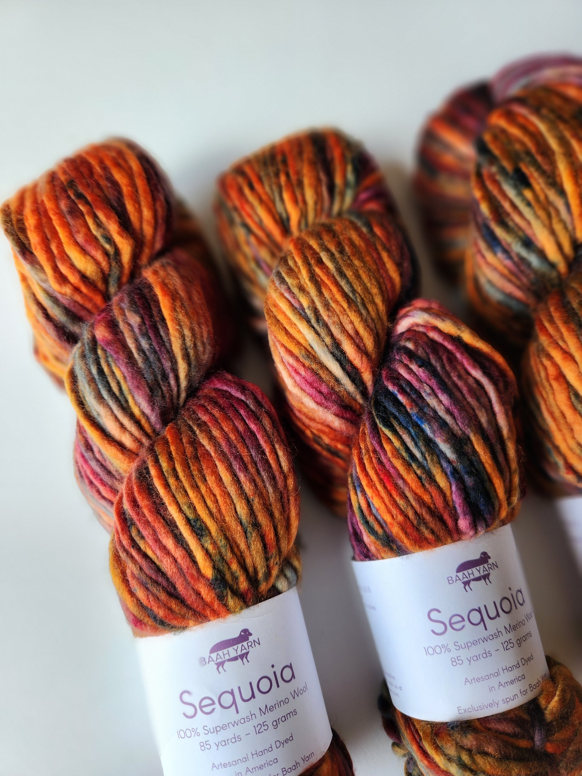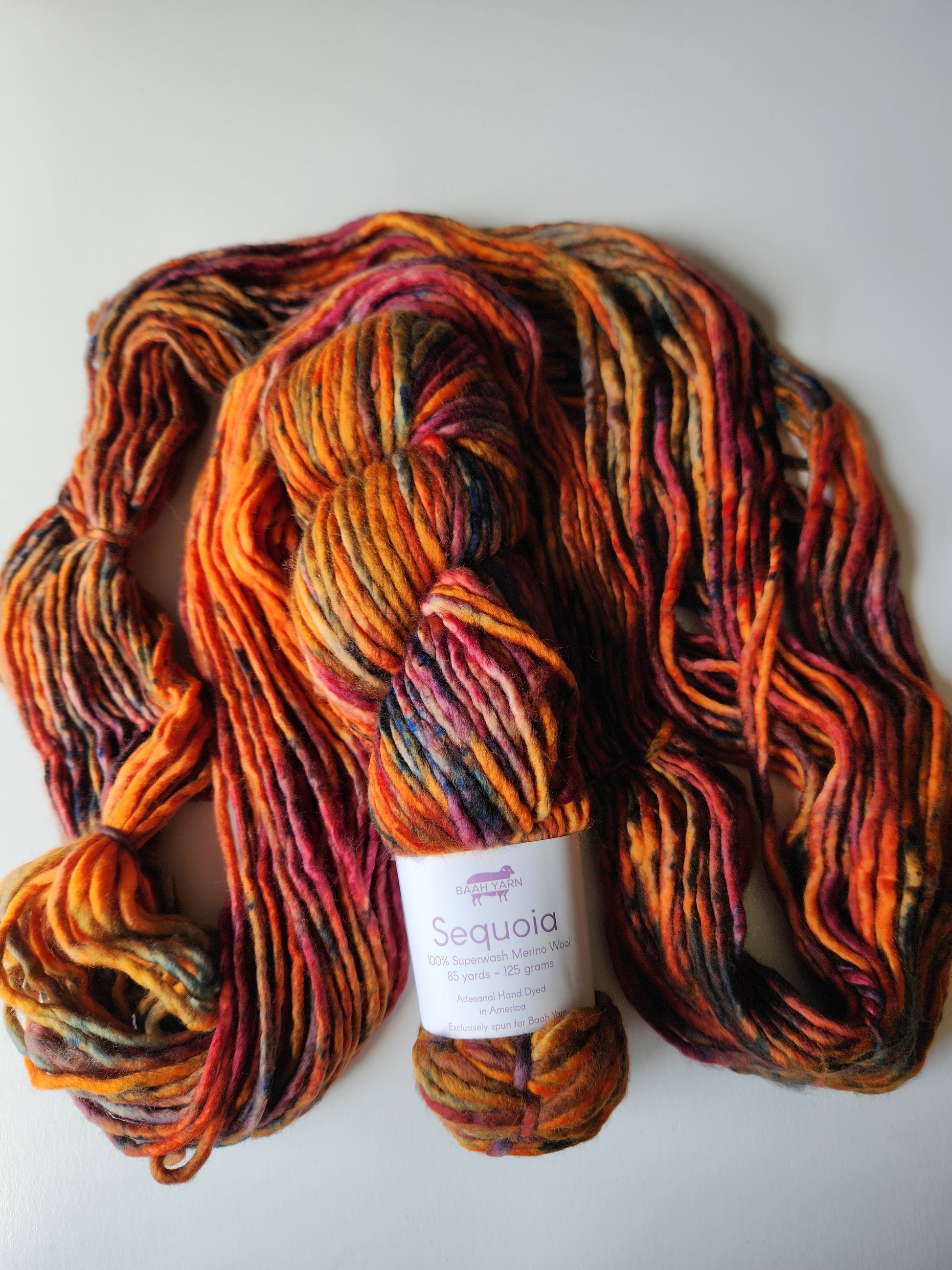 Baah Sequoia 100% superwash single ply merino wool. Each skein is 85 yards of hand-dyed squishy beauty, perfect for plump, quick knit or crochet projects.
