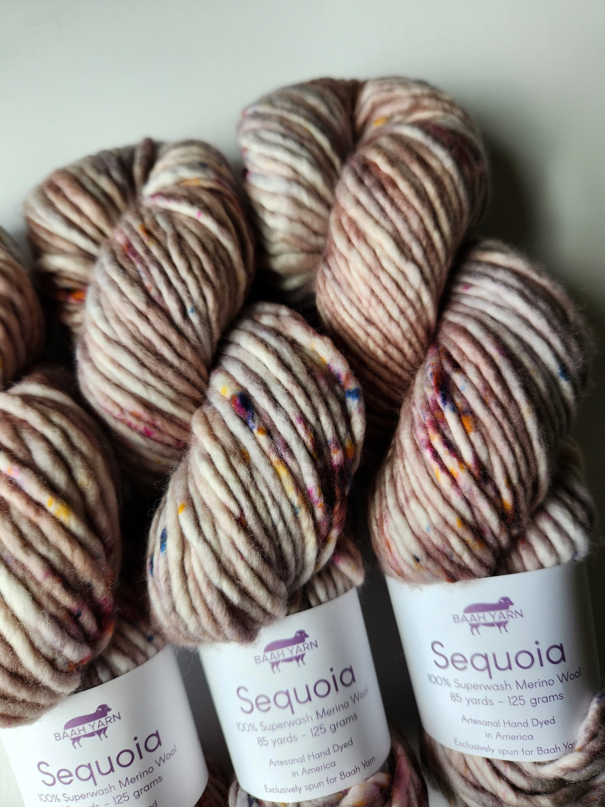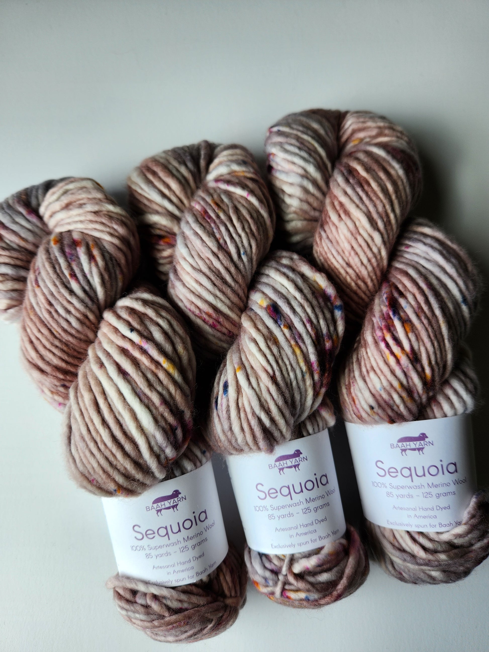 Baah Sequoia 100% superwash single ply merino wool. Each skein is 85 yards of hand-dyed squishy beauty, perfect for plump, quick knit or crochet projects.