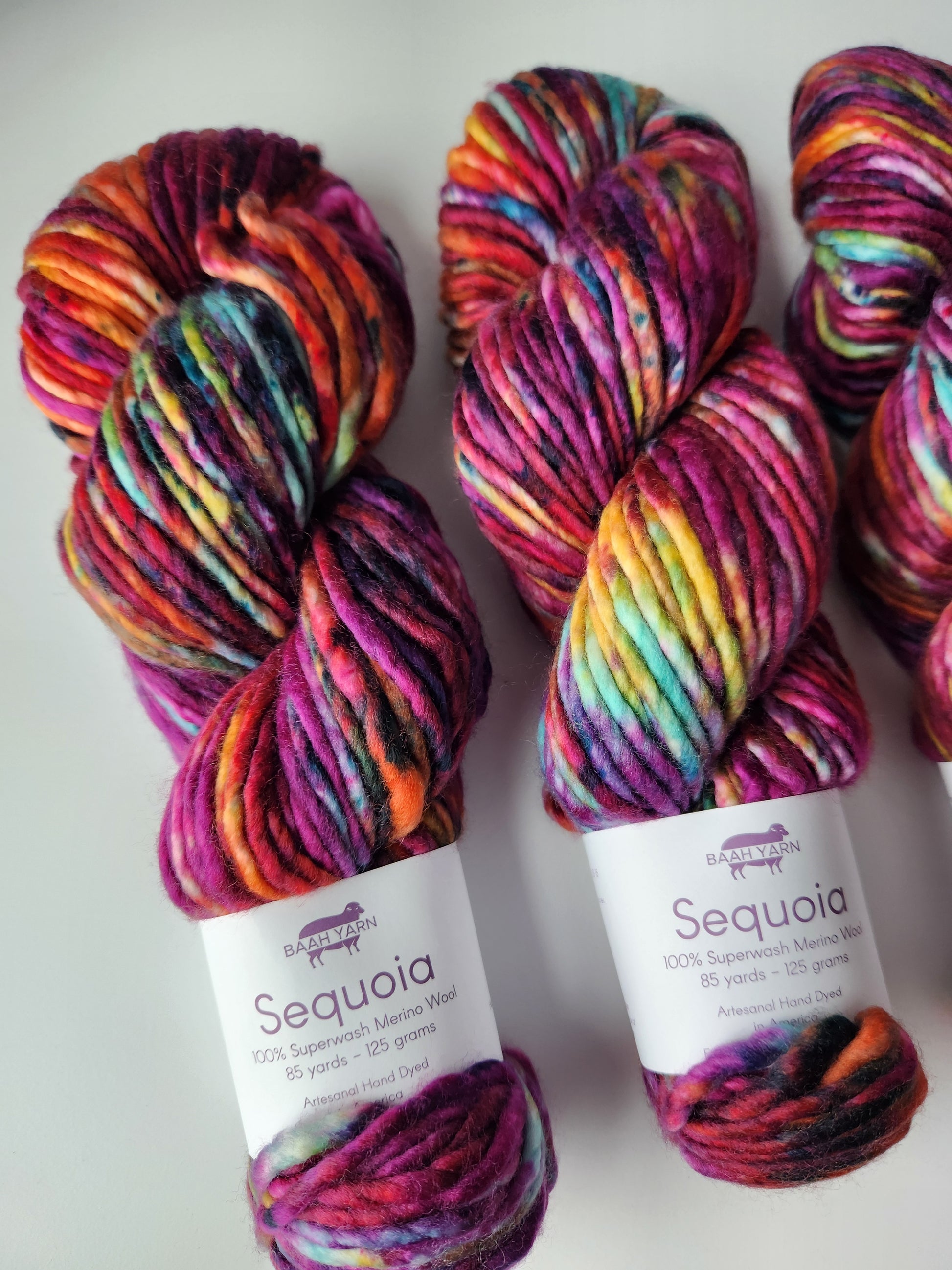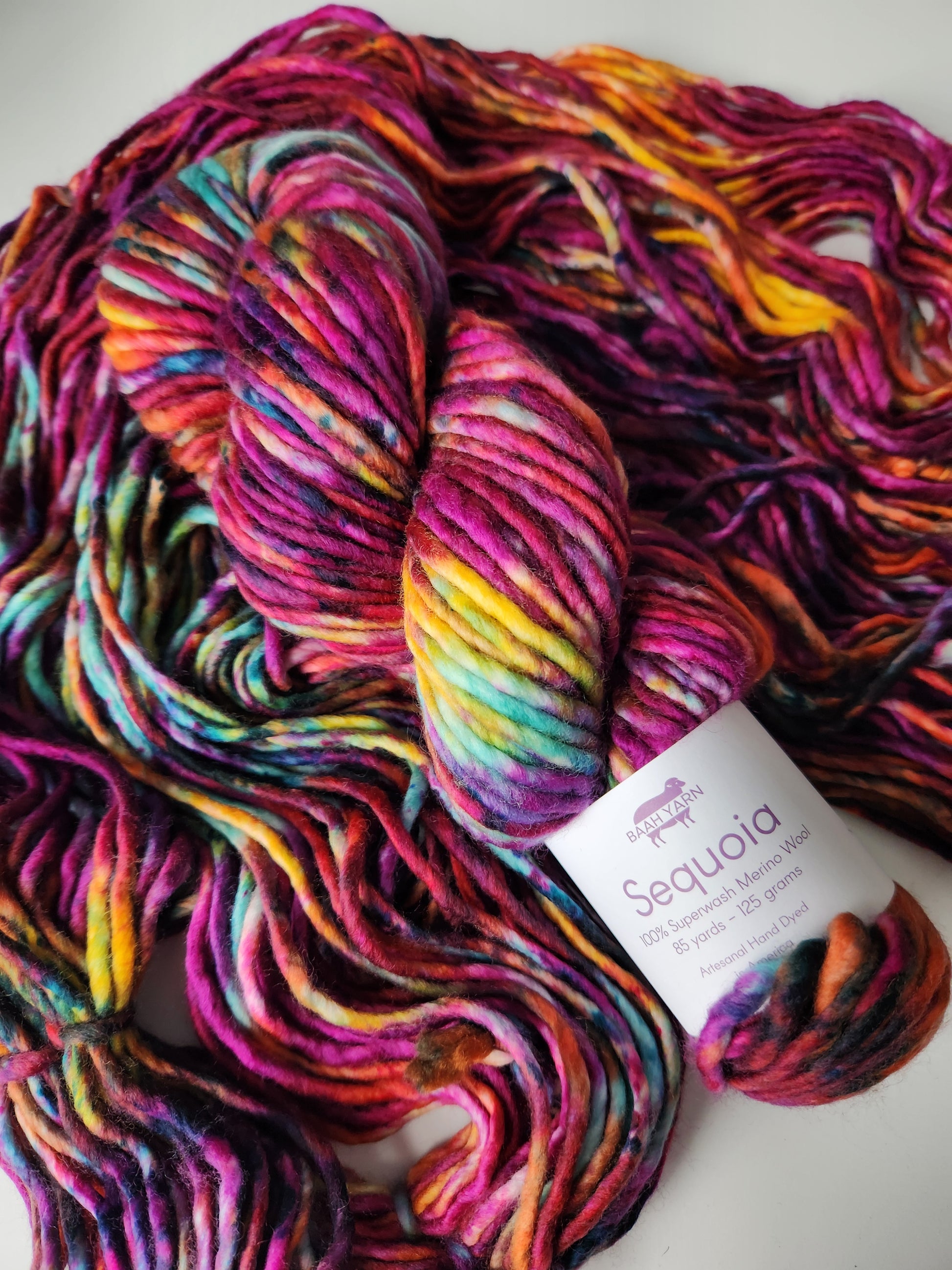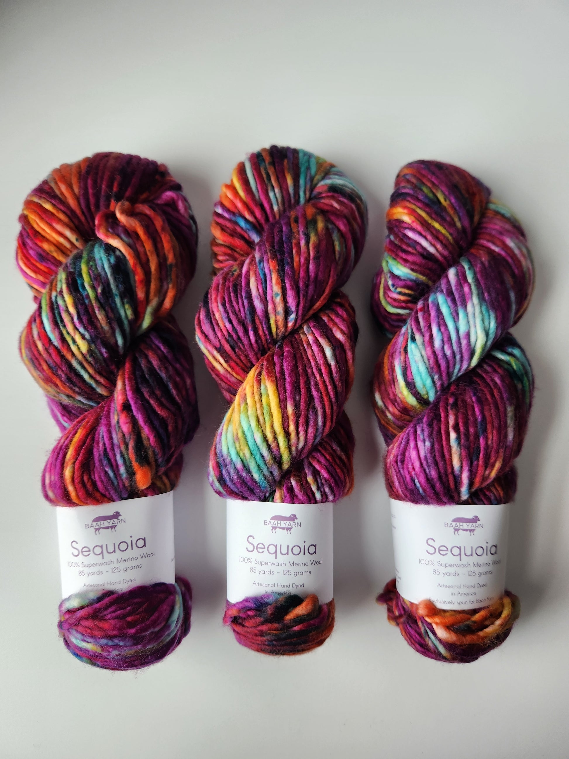 Baah Sequoia 100% superwash single ply merino wool. Each skein is 85 yards of hand-dyed squishy beauty, perfect for plump, quick knit or crochet projects.