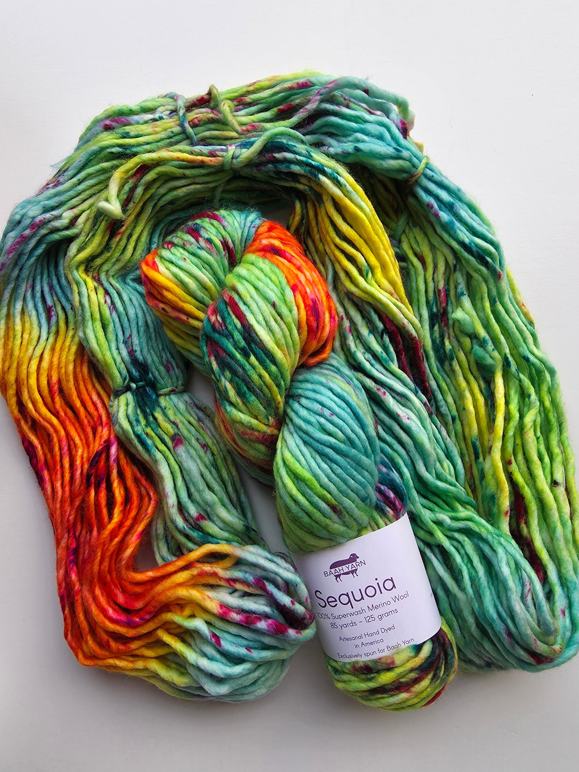 Baah Sequoia 100% superwash single ply merino wool. Each skein is 85 yards of hand-dyed squishy beauty, perfect for plump, quick knit or crochet projects.