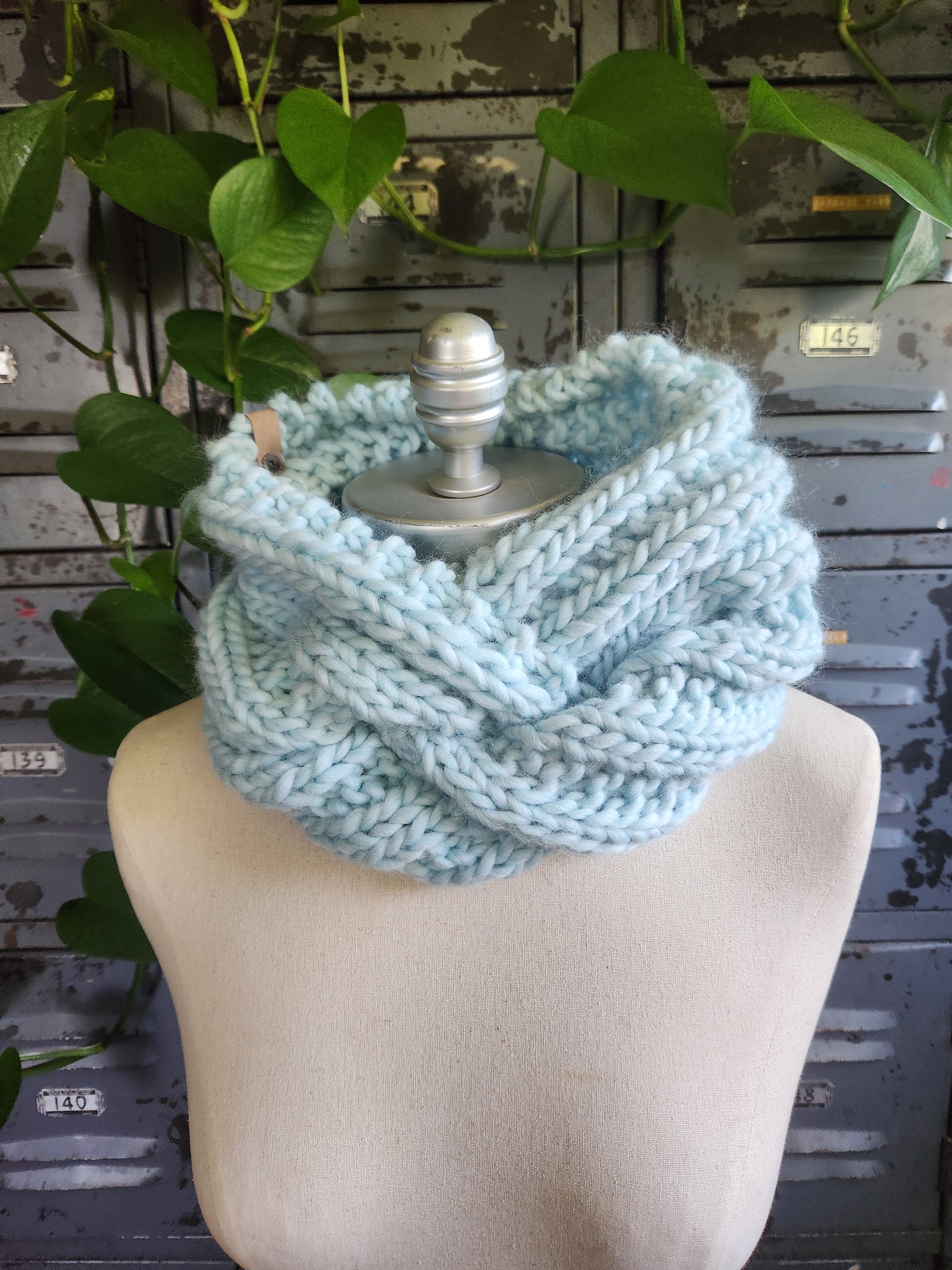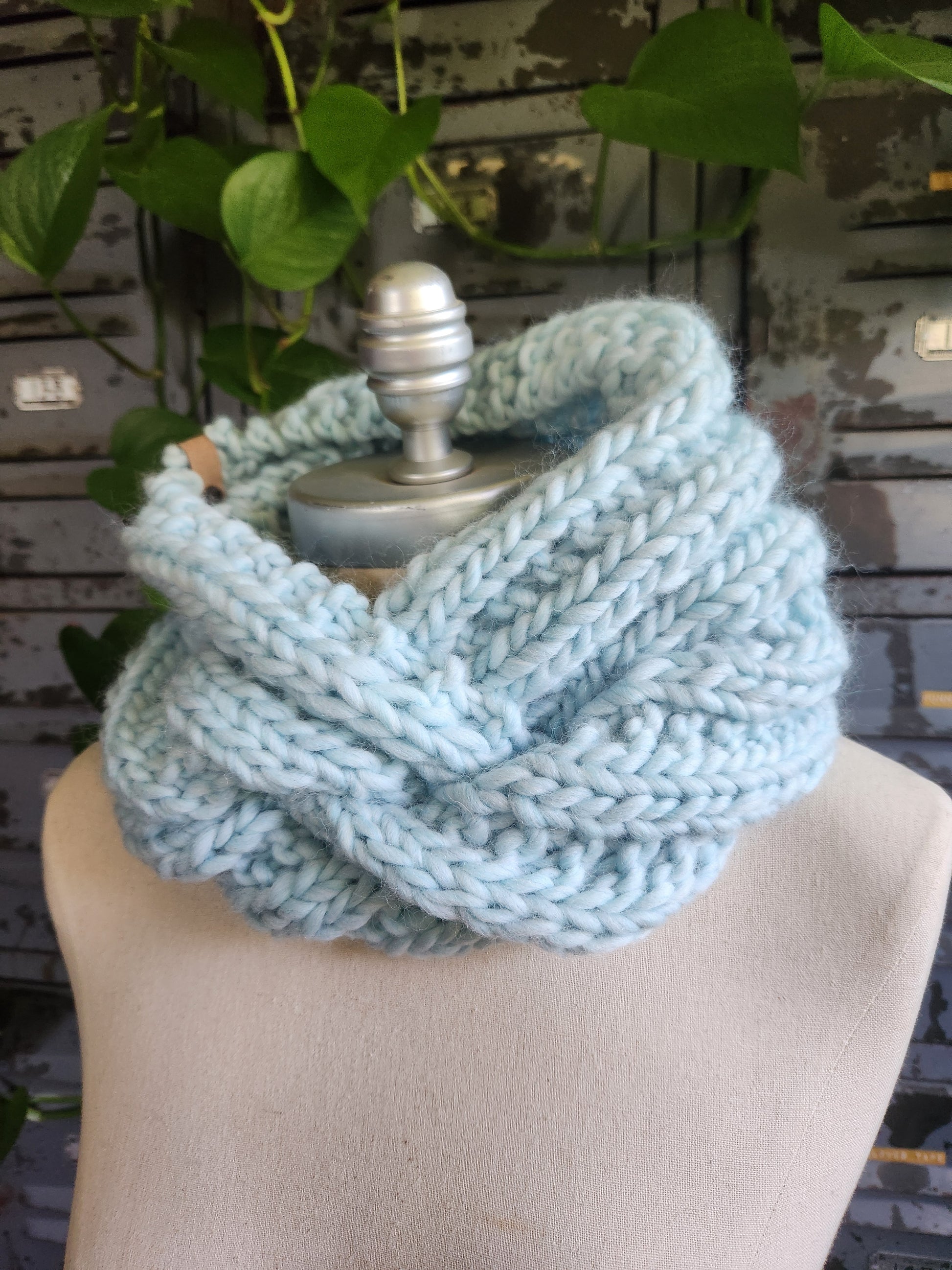 The cowl is made from highland wool fibers. Fits most average adults. Cowl measures approximately 12" wide and 10" tall. Makes a 25" loop.