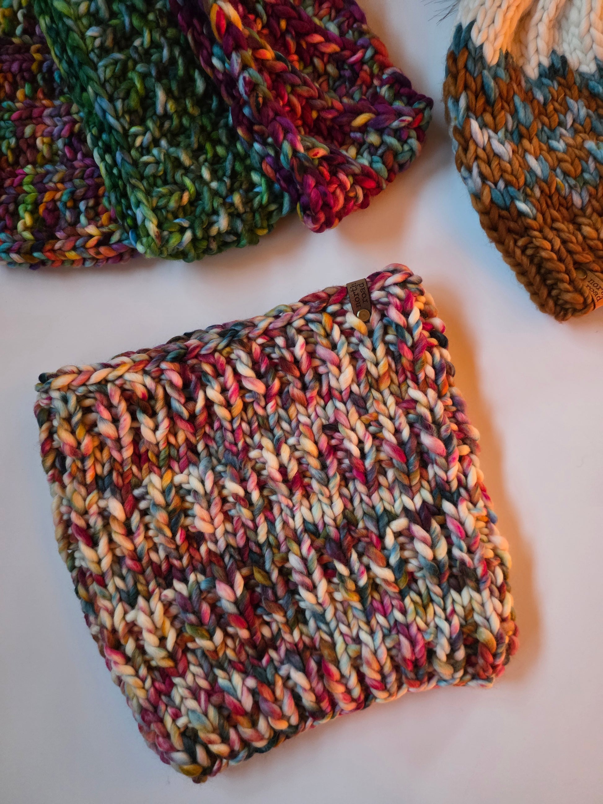 The cowl is made from a blend of fibers. Fits most average adults. Cowl measures approximately 12" wide and 13" tall. Makes a 25" loop.