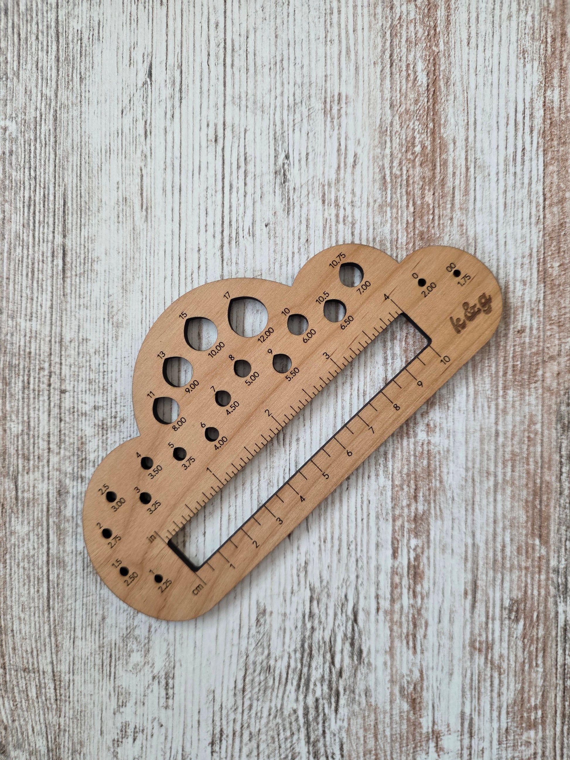 A multifunctional gauge tool that has knitting needle and crochet hook measuring "rain drops" and a 4 inch project gauge window across. This gauge tool has purpose and a fun original design! Measure knitting needles and crochet hooks with sizes starting at 1.75 mm up to 12 mm. Designed and made in Minnesota, now in toasty alder wood and sealed with natural wood oil for lasting quality. A must have for every project bag or fiber tool kit.
