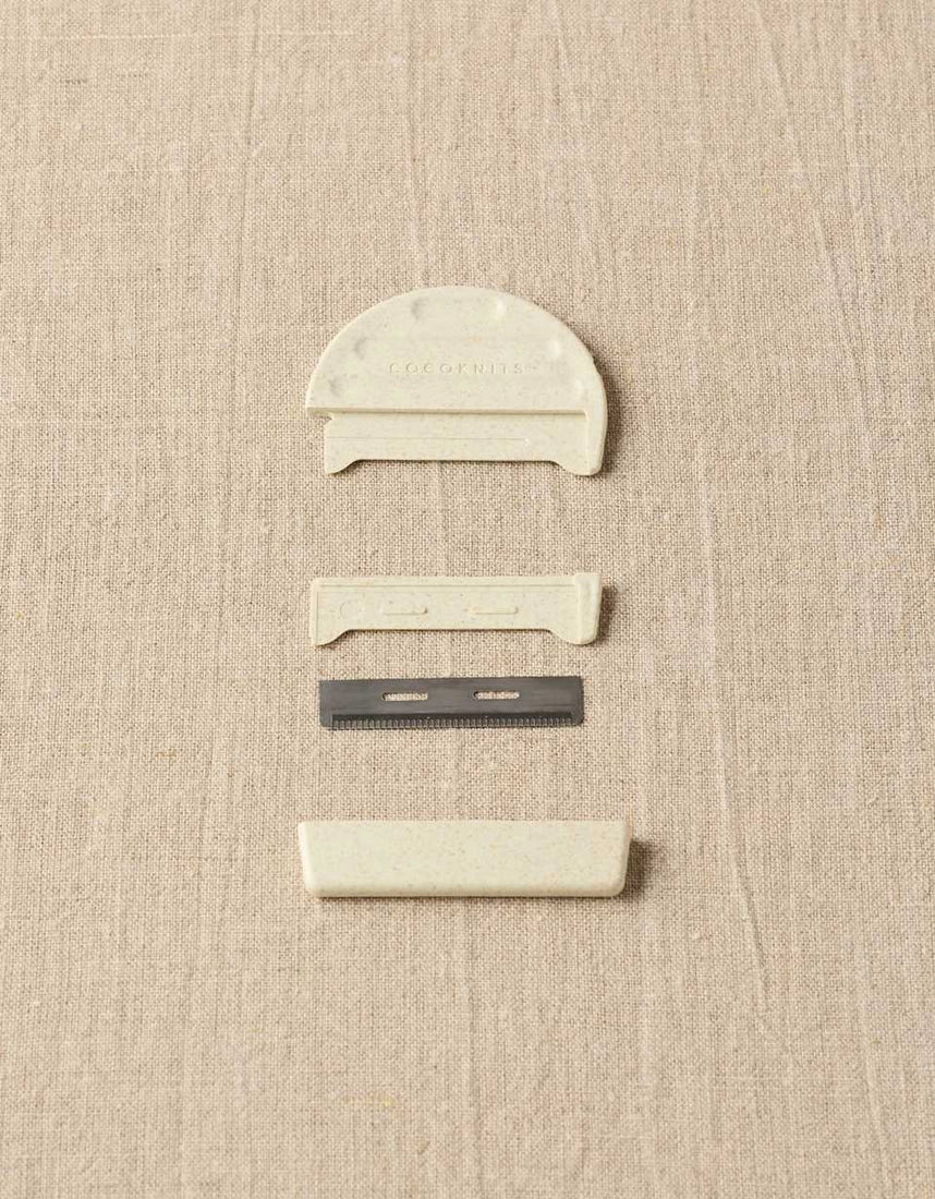 Keep your garments looking fresh and pill-free with this gentle steel comb, which efficiently removes fiber fuzz buildup. This updated design is easier to hold and has a cover that clicks into place. The steel comb is still replaceable and works with the same Cocoknits comb refills. The body is 100% biodegradable PLA, made from plant fiber.