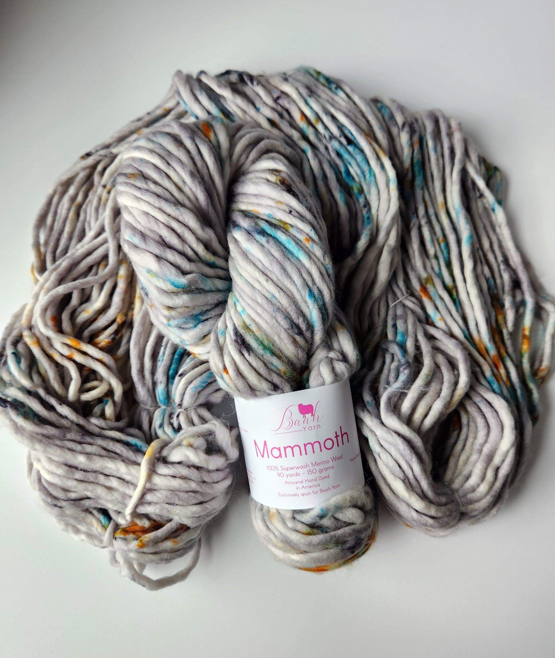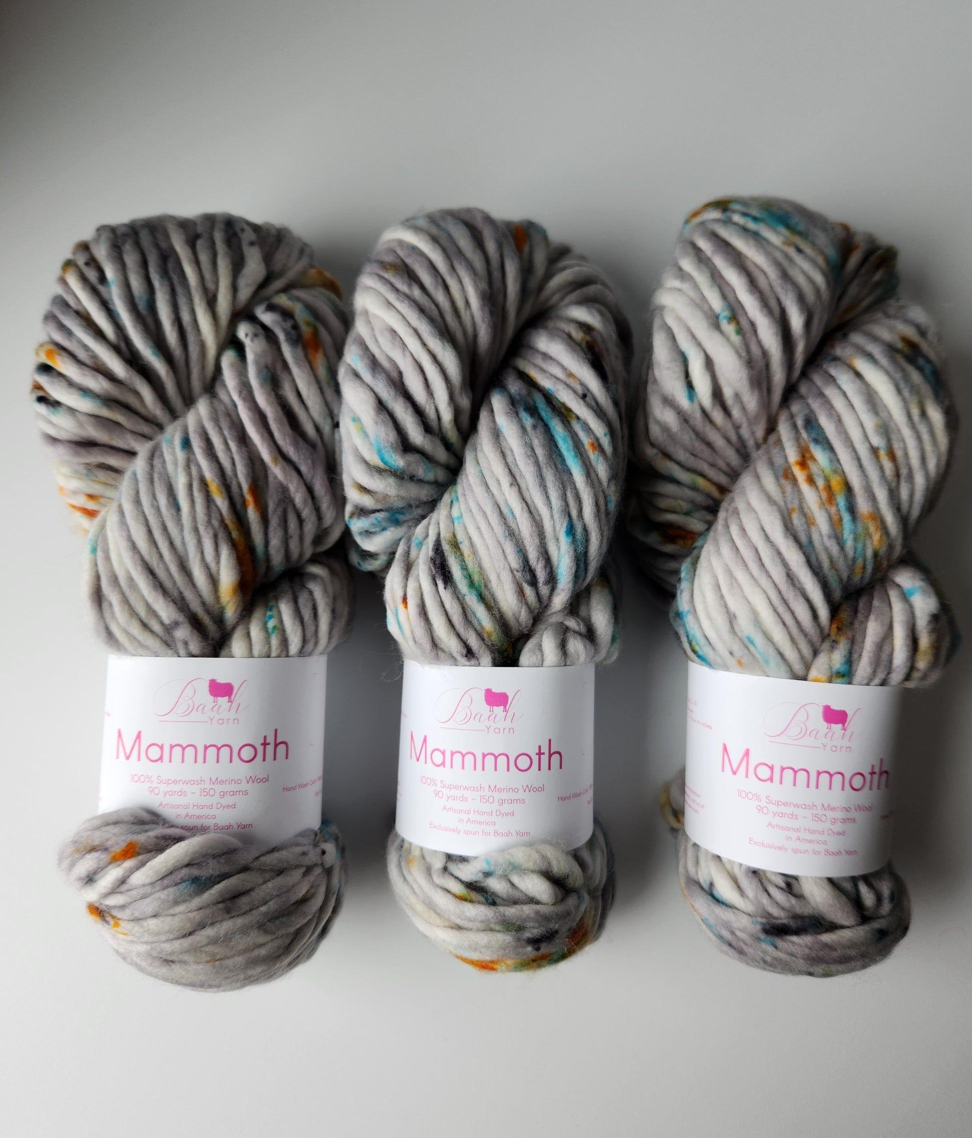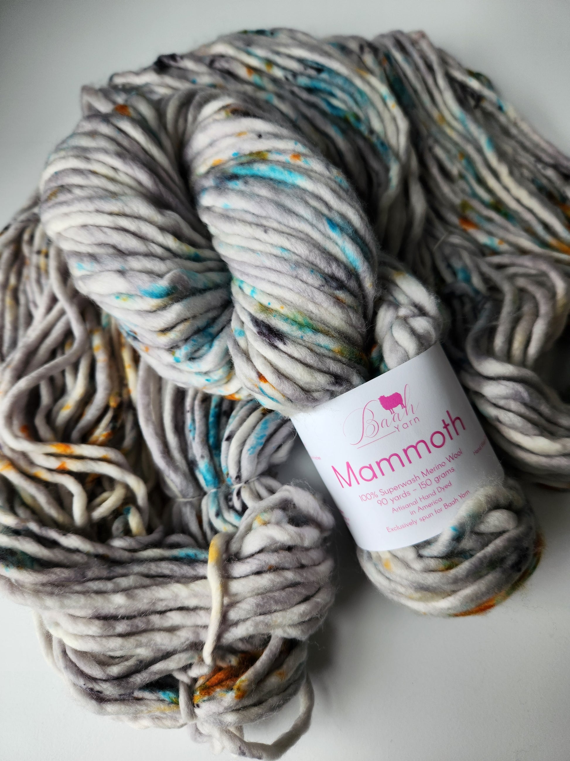 Baah Mammoth 100% superwash single ply merino wool. Each skein is 90 yards of hand-dyed squishy beauty, perfect for plump, quick knit or crochet projects.
