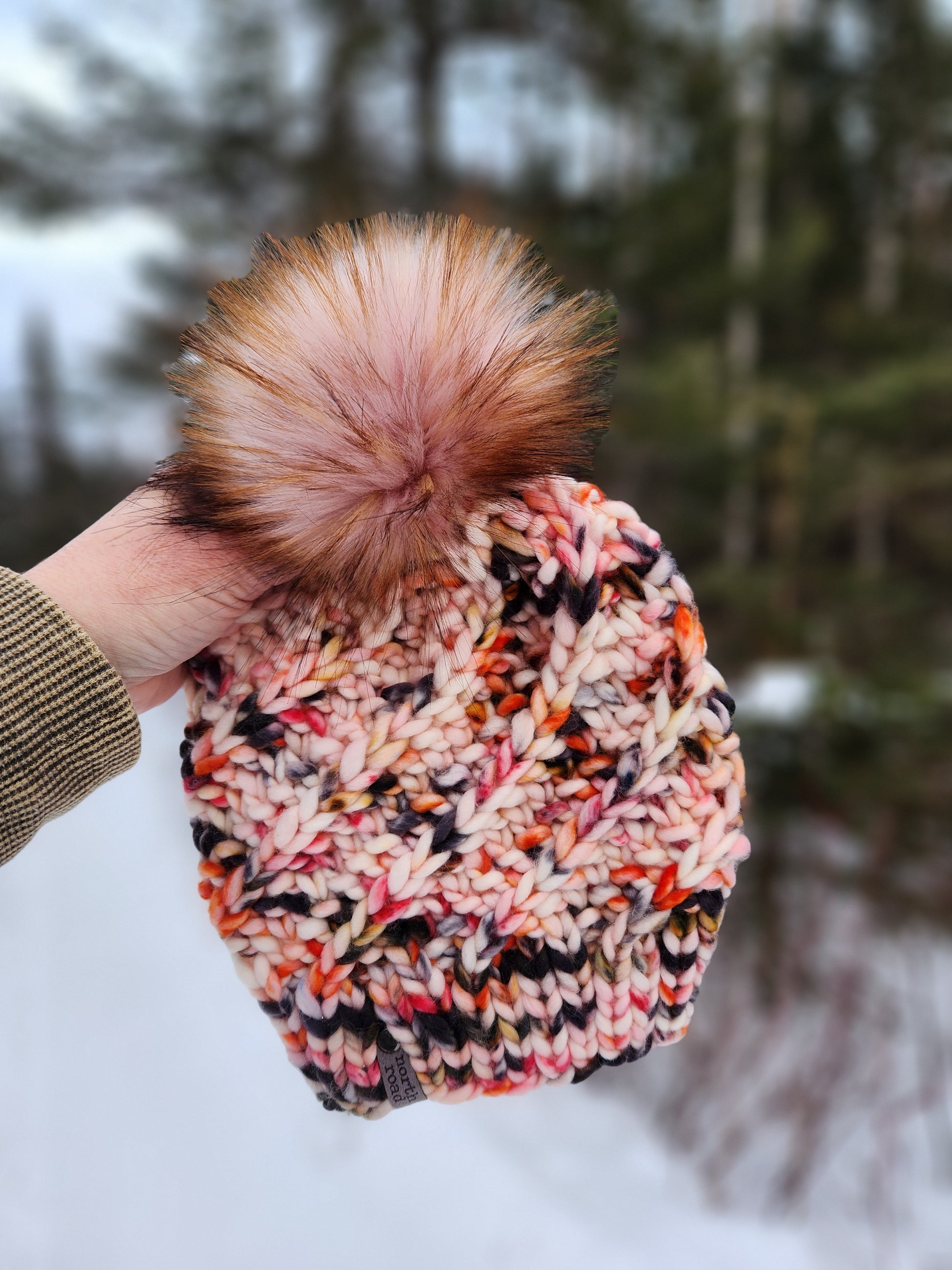 The hat is made from a beautiful 100% merino wool yarn that is sustainably and ethically sourced, and hand dyed. Fits most average adult heads. Shown here on a glass mannequin head that measures 22" in circumference.