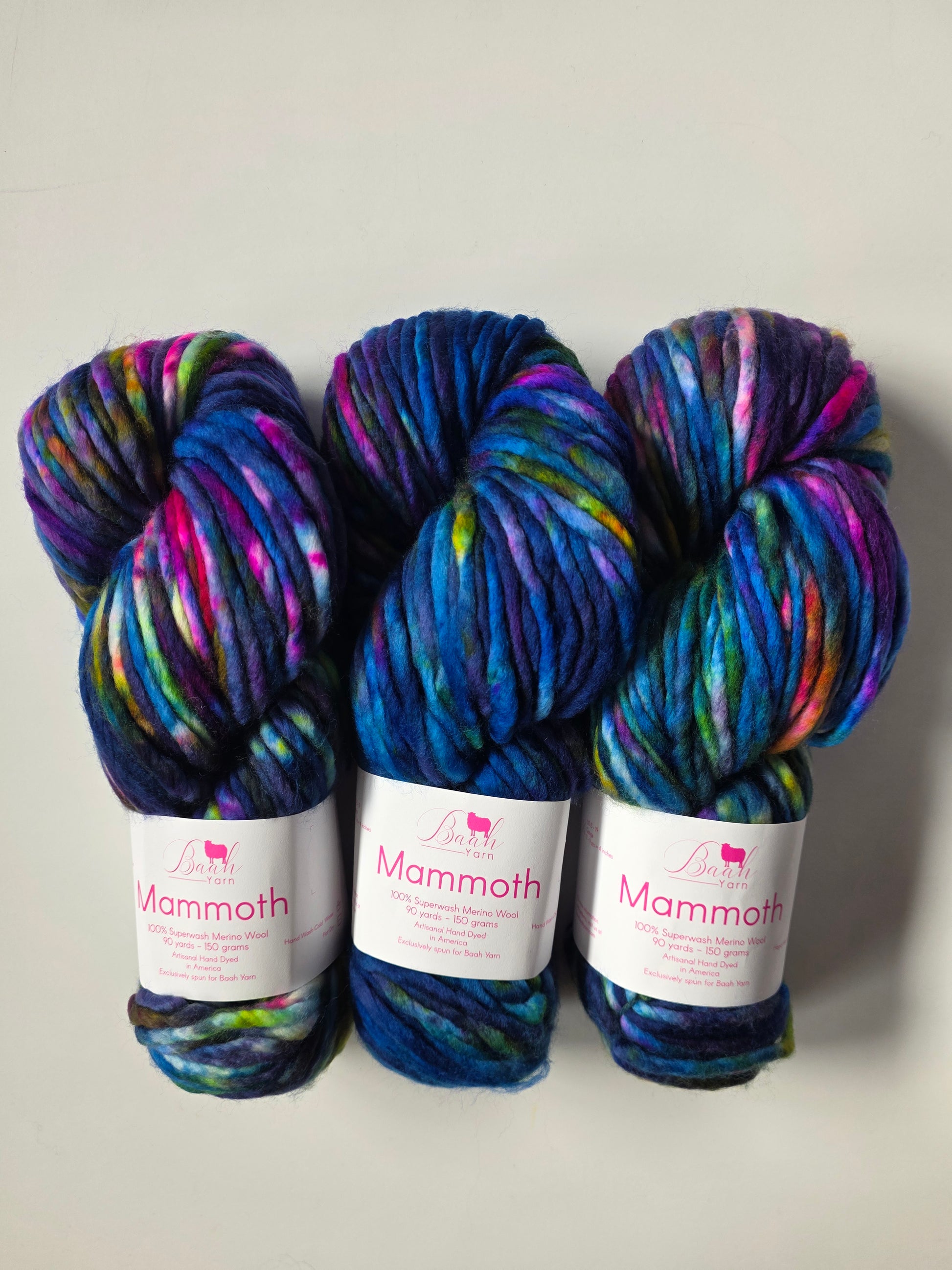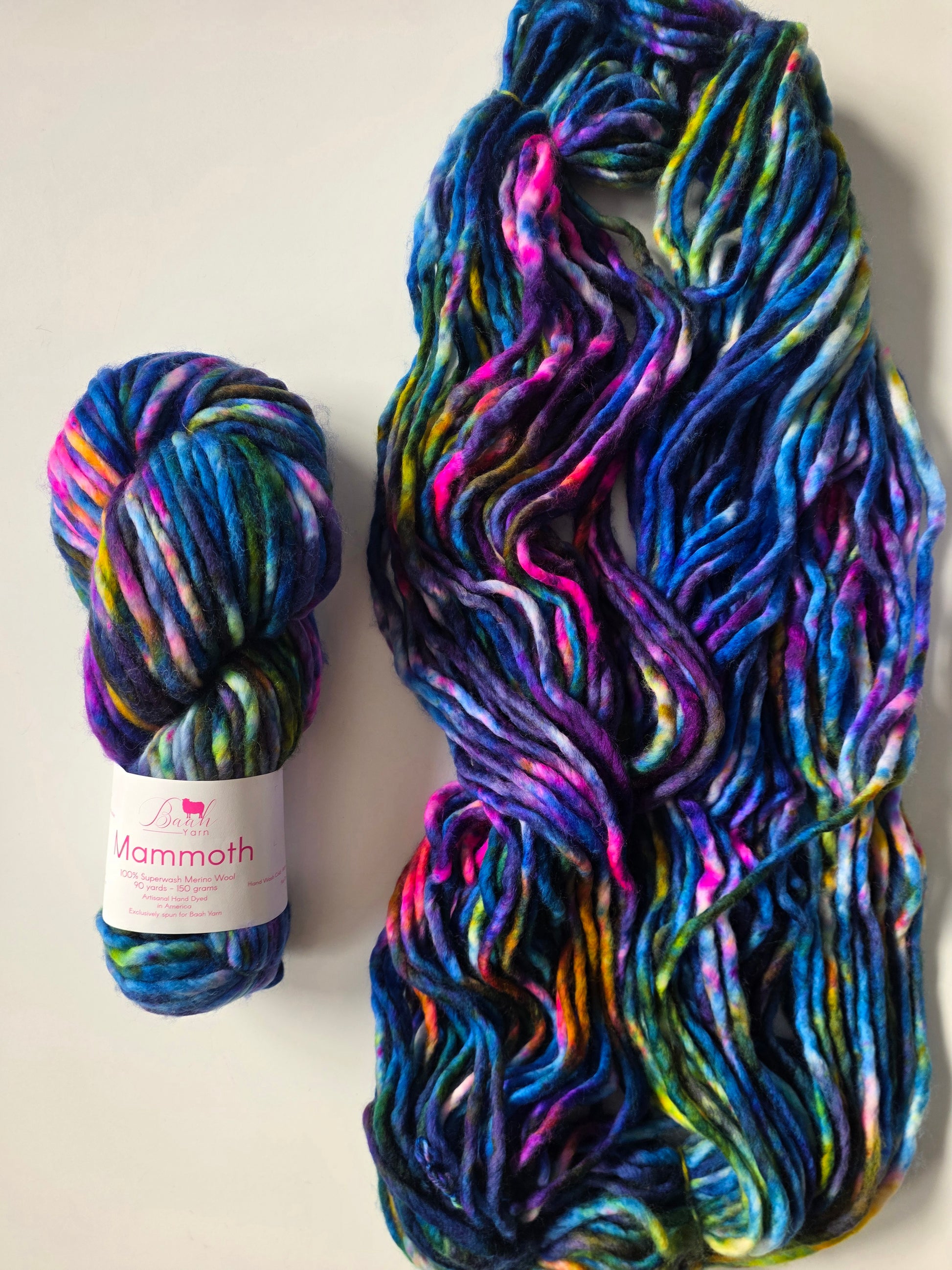 Baah Mammoth 100% superwash single ply merino wool. Each skein is 90 yards of hand-dyed squishy beauty, perfect for plump, quick knit or crochet projects.