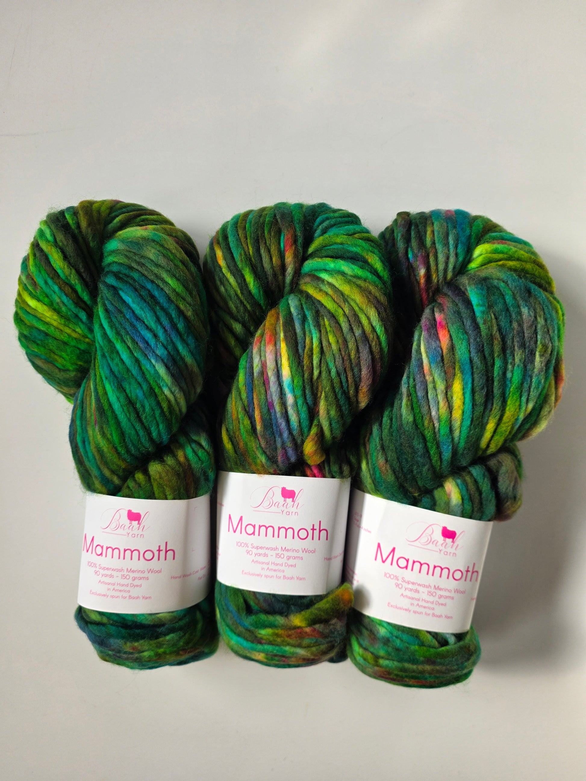 Baah Mammoth 100% superwash single ply merino wool. Each skein is 90 yards of hand-dyed squishy beauty, perfect for plump, quick knit or crochet projects.