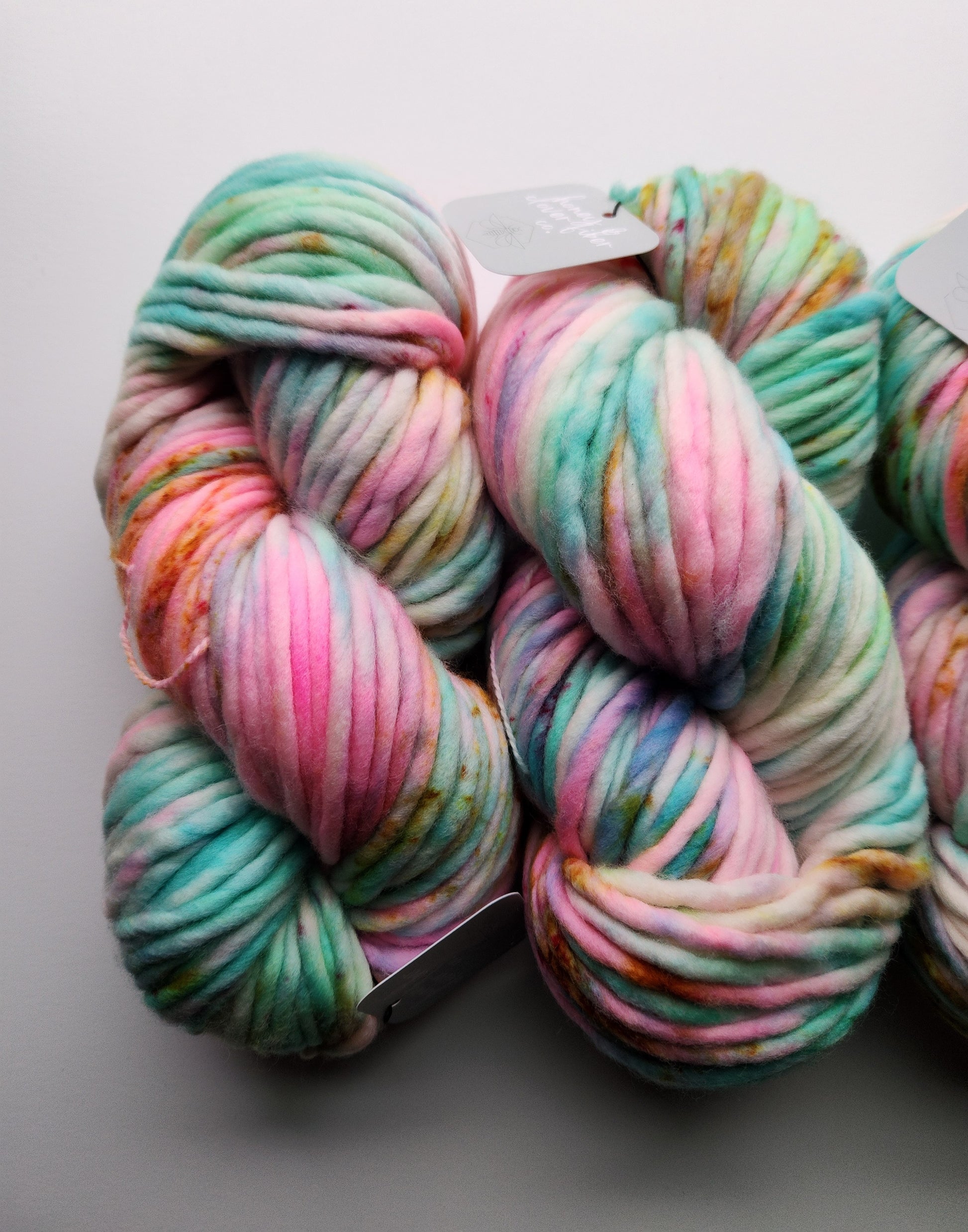 I am so excited to have some of Honey and Clover's hand dyed yarn on my website. Trish hand dyes each skein in dozens of unique colorways. Single Ply Super Bulky 100% Merino Wool Superwash. Each skein is 98 yards of hand-dyed squishy beauty, perfect for plump, quick knit or crochet projects.