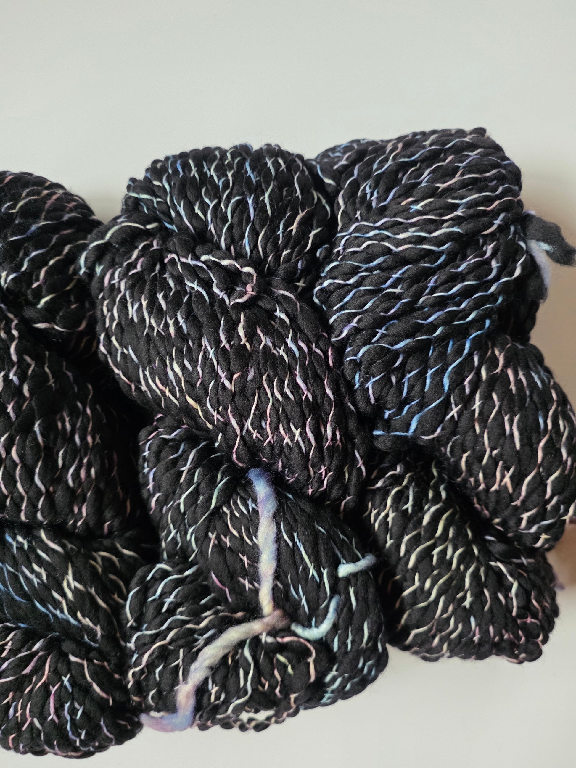 Malabrigo Caracol 100% superwash merino wool. Super bulky. Piled thick and thin yarn. Each skein is 90 yards.
