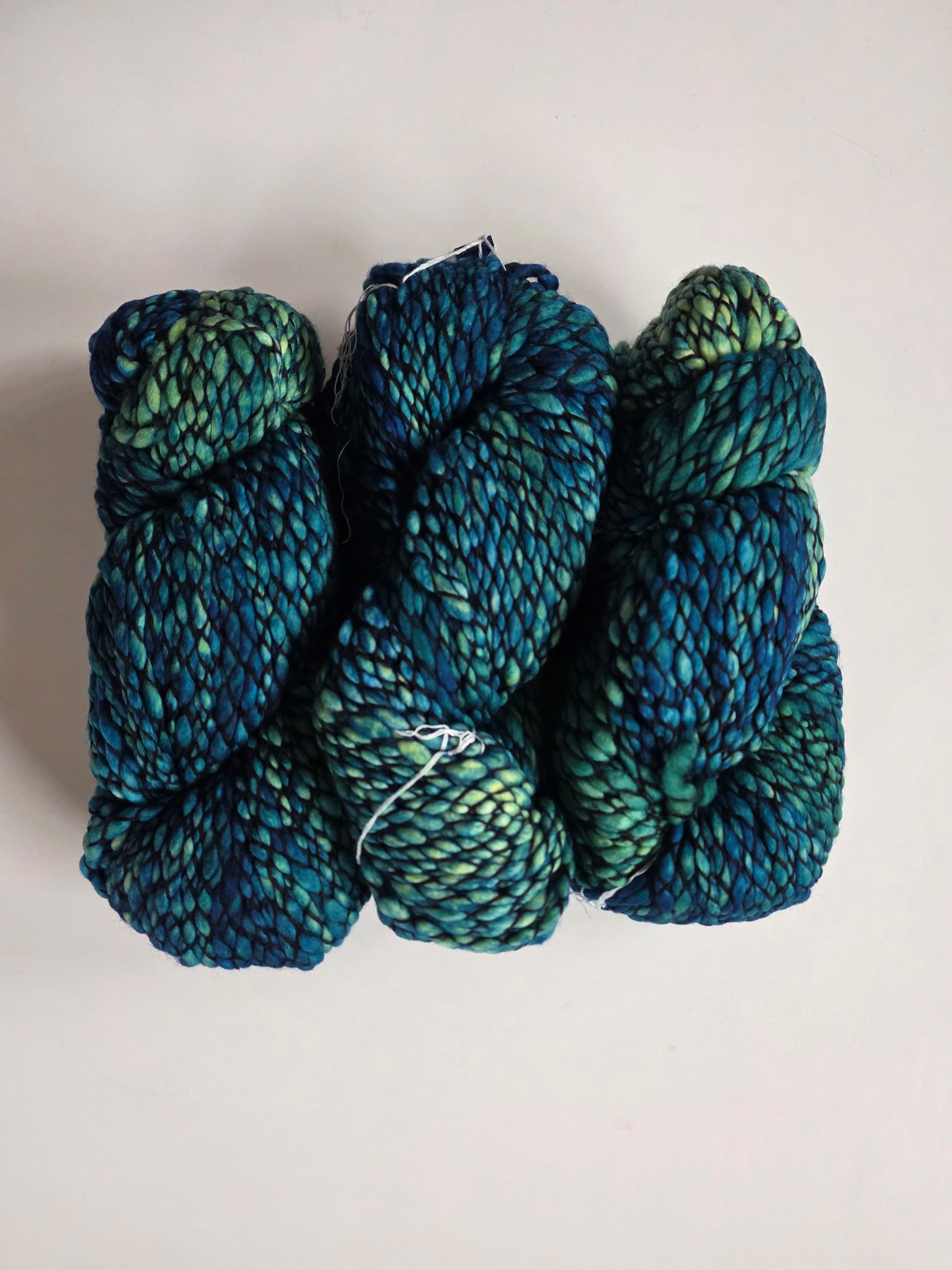 Malabrigo Caracol 100% superwash merino wool. Super bulky. Piled thick and thin yarn. Each skein is 90 yards.