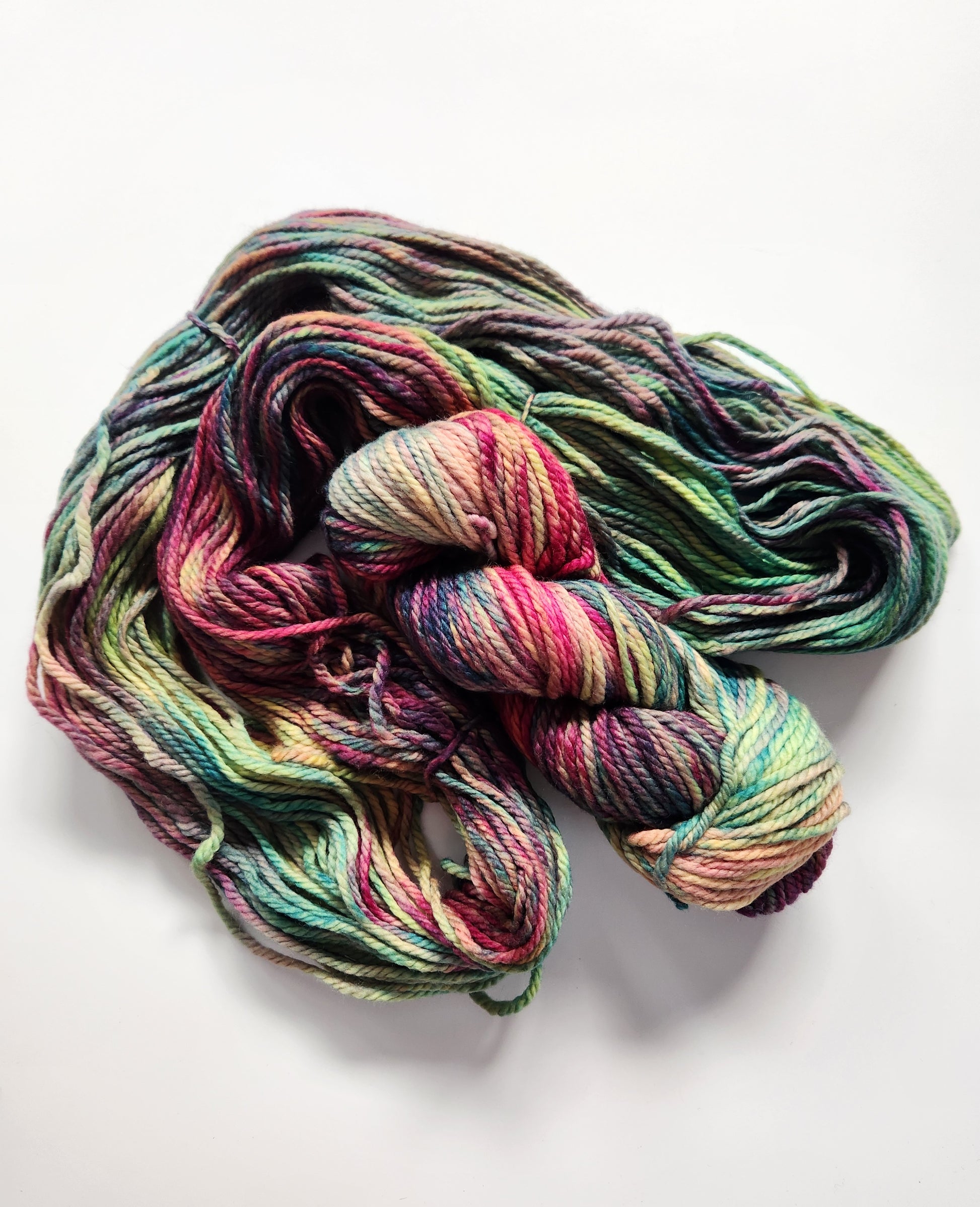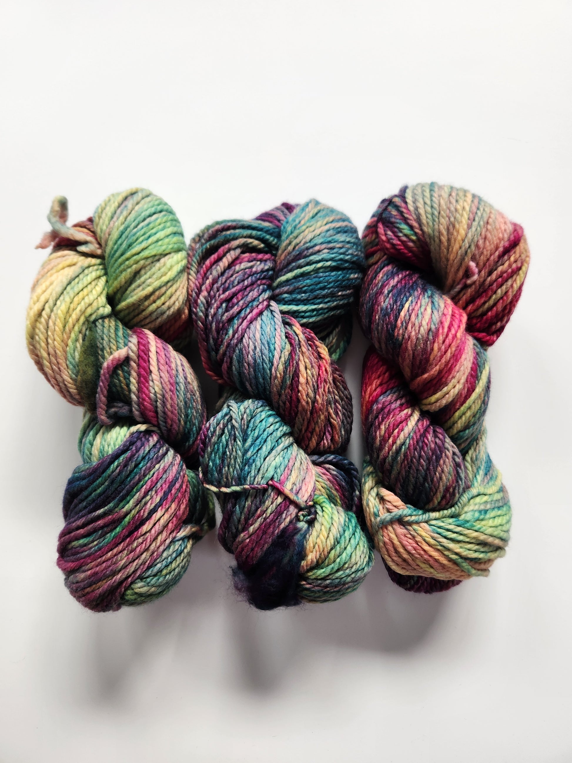 Malabrigo Chunky is 100% merino wool. 3 ply. Each skein is 104 yards of hand-dyed perfection, great for any knit or crochet creations, including accessories, garments, baby and kids items, housewares, toys, cables, textured stitches, color-work.